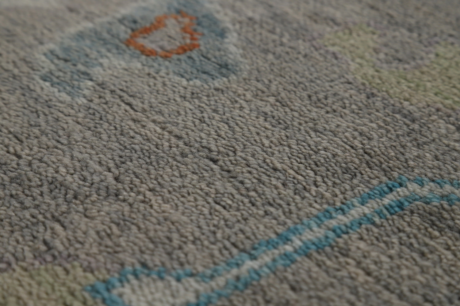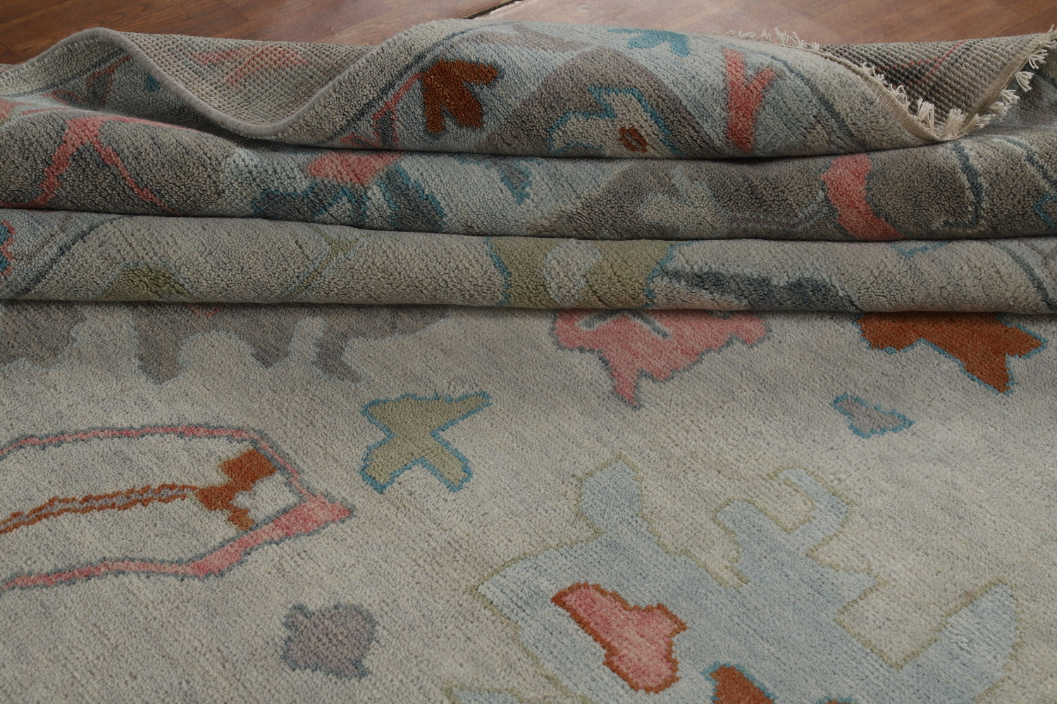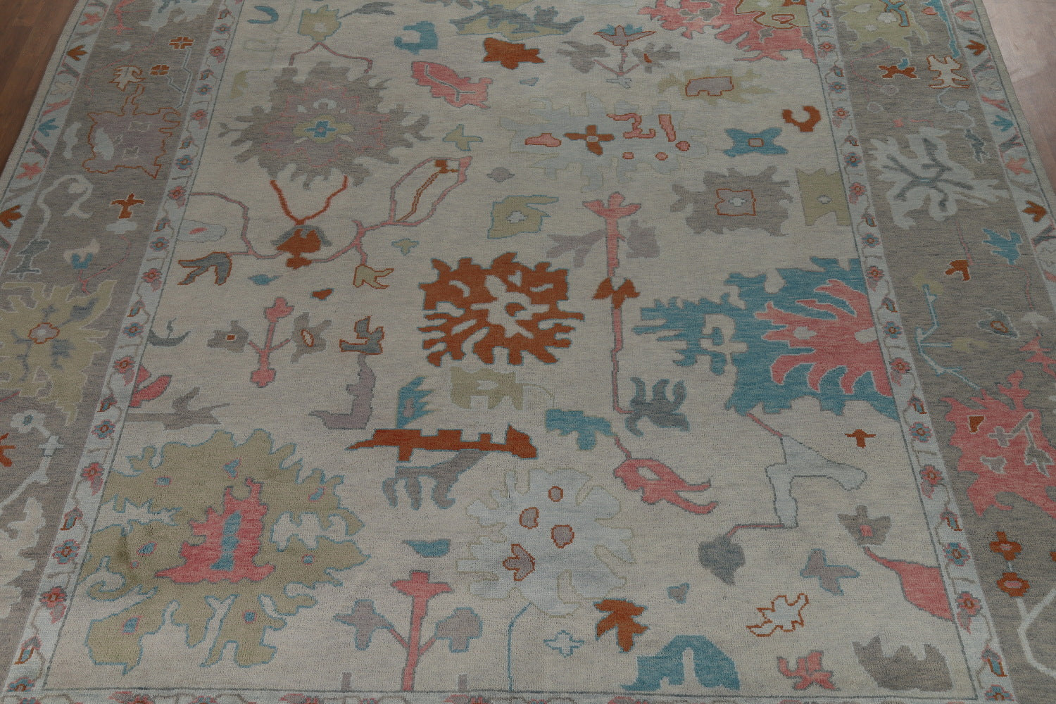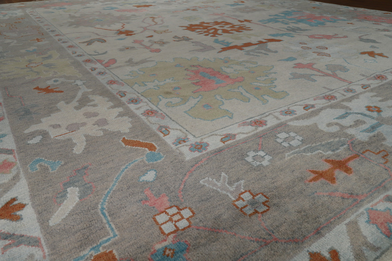 A Beautiful Genuine India Oushak rug is Hand Knotted by skillful weavers in India with 100% Wool Material. This rug is in New, First Quality condition. dimensions are 14' 11'' X 11' 9'' in foot and 455 X 358 in centimeter. the primary color is Greys & Charcoal.