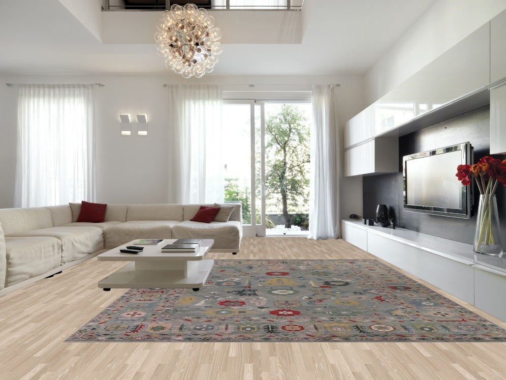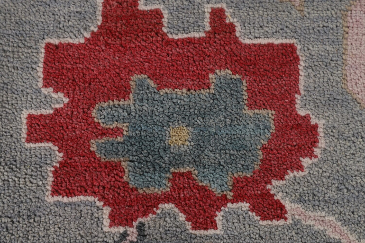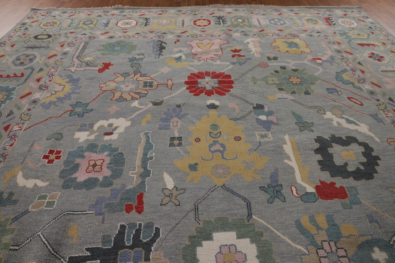 A Beautiful Genuine India Oushak rug is Hand Knotted by skillful weavers in India with 100% Wool Material. This rug is in New, First Quality condition. dimensions are 14' 9'' X 12' 2'' in foot and 450 X 371 in centimeter. the primary color is Greys & Charcoal.