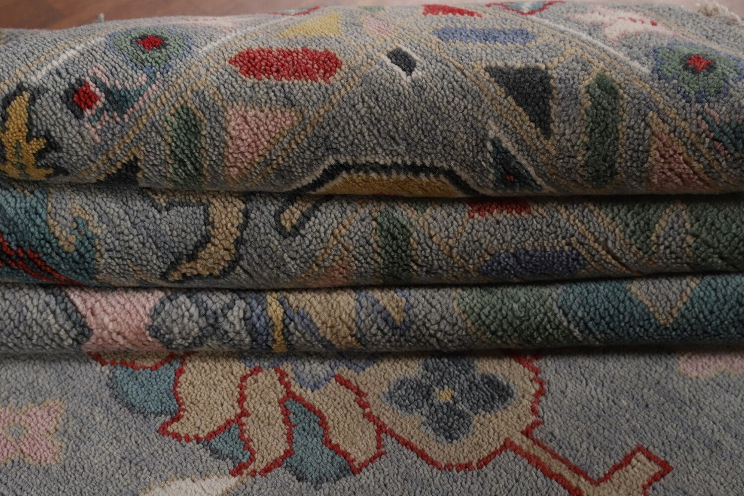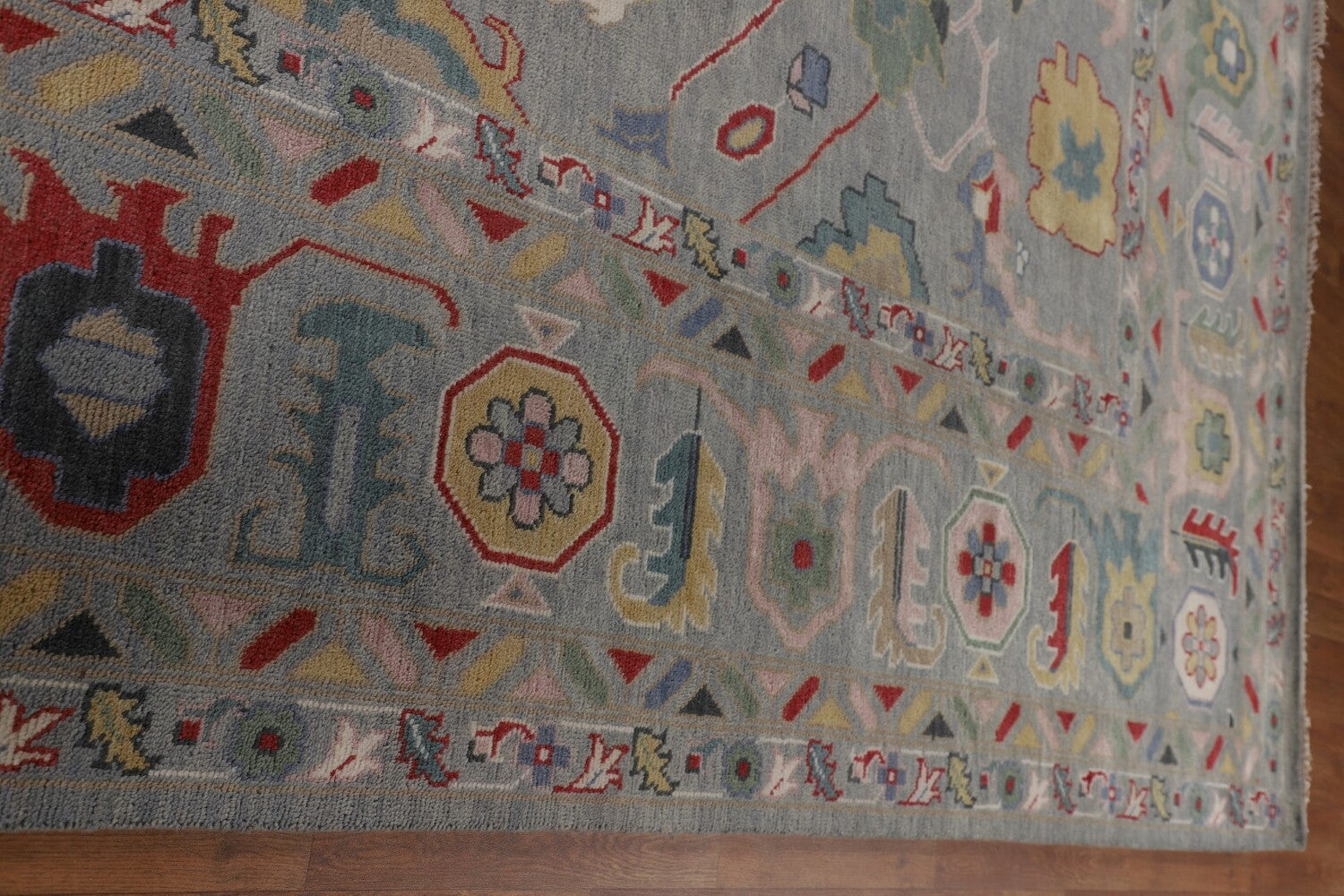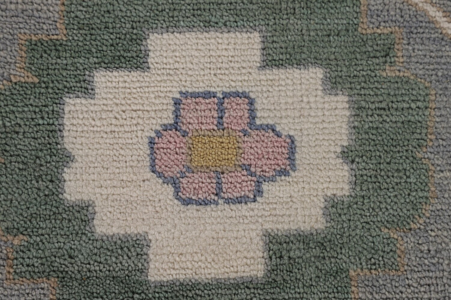 A Beautiful Genuine India Oushak rug is Hand Knotted by skillful weavers in India with 100% Wool Material. This rug is in New, First Quality condition. dimensions are 14' 9'' X 12' 2'' in foot and 450 X 371 in centimeter. the primary color is Greys & Charcoal.