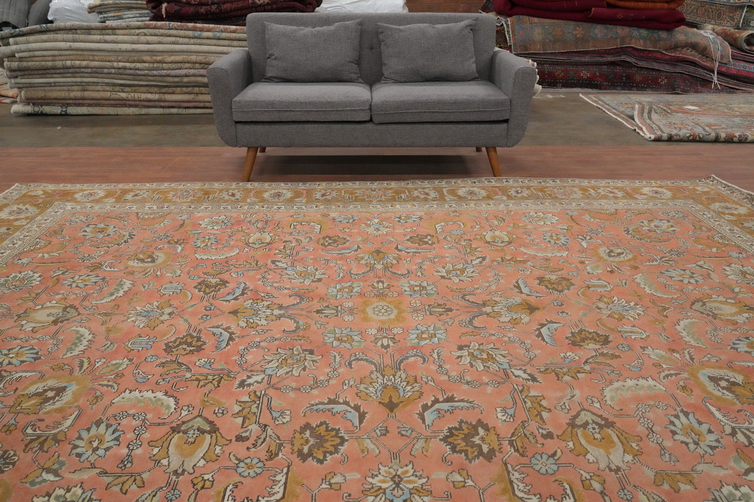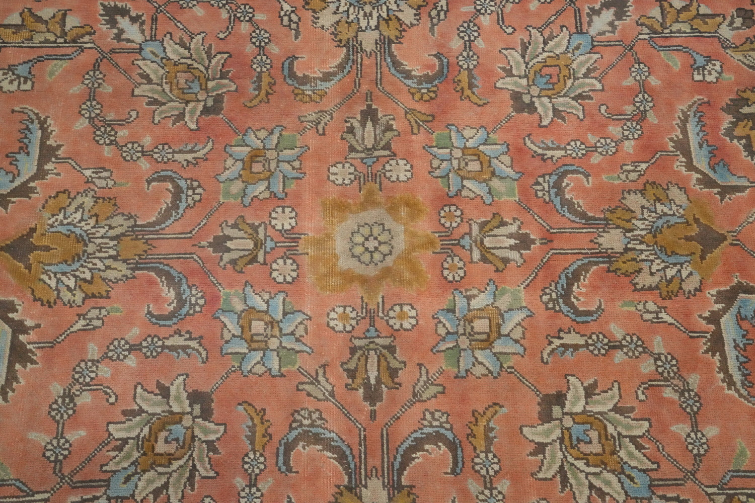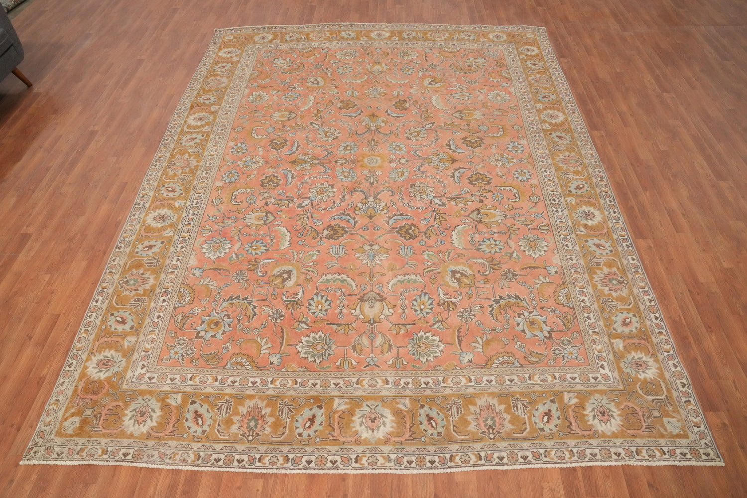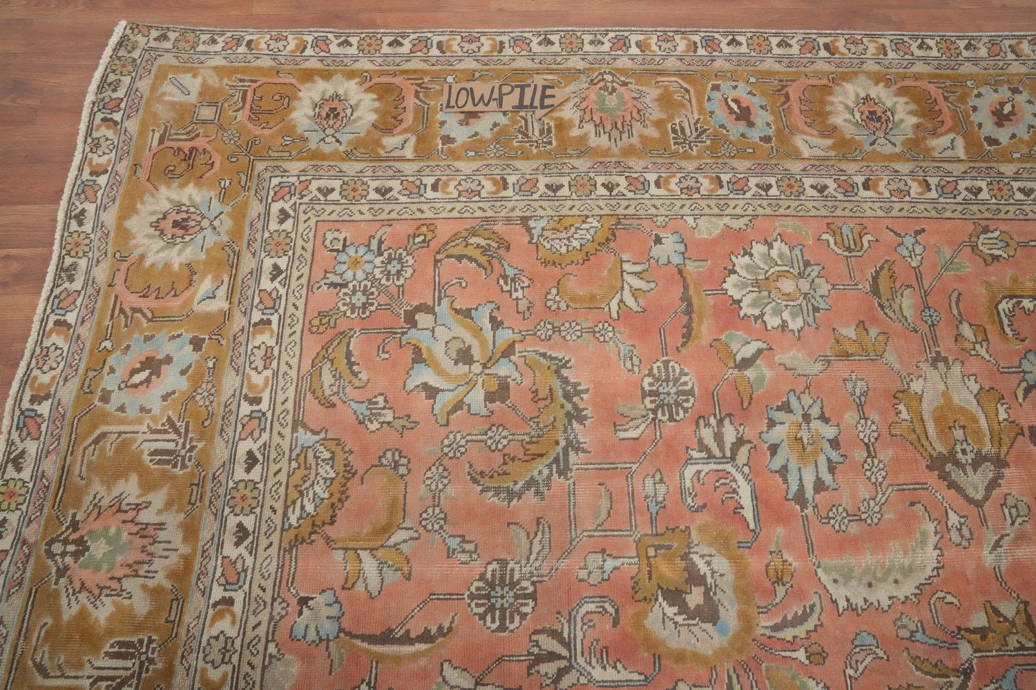 A Beautiful Genuine Persia ( Persia ) Tabriz rug is Hand Knotted by skillful weavers in Persia ( Persia ) with 100% Wool Material. This rug is in Very Good ( Low Pile ) condition. dimensions are 12' 6'' X 9' 7'' in foot and 381 X 292 in centimeter. the primary color is Pink.