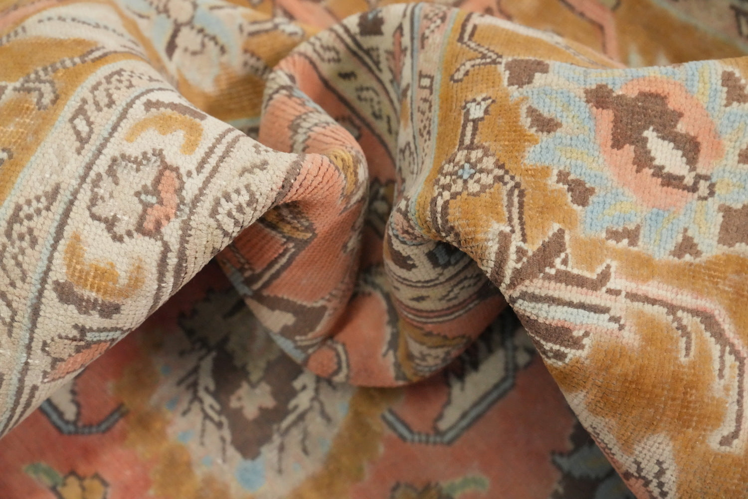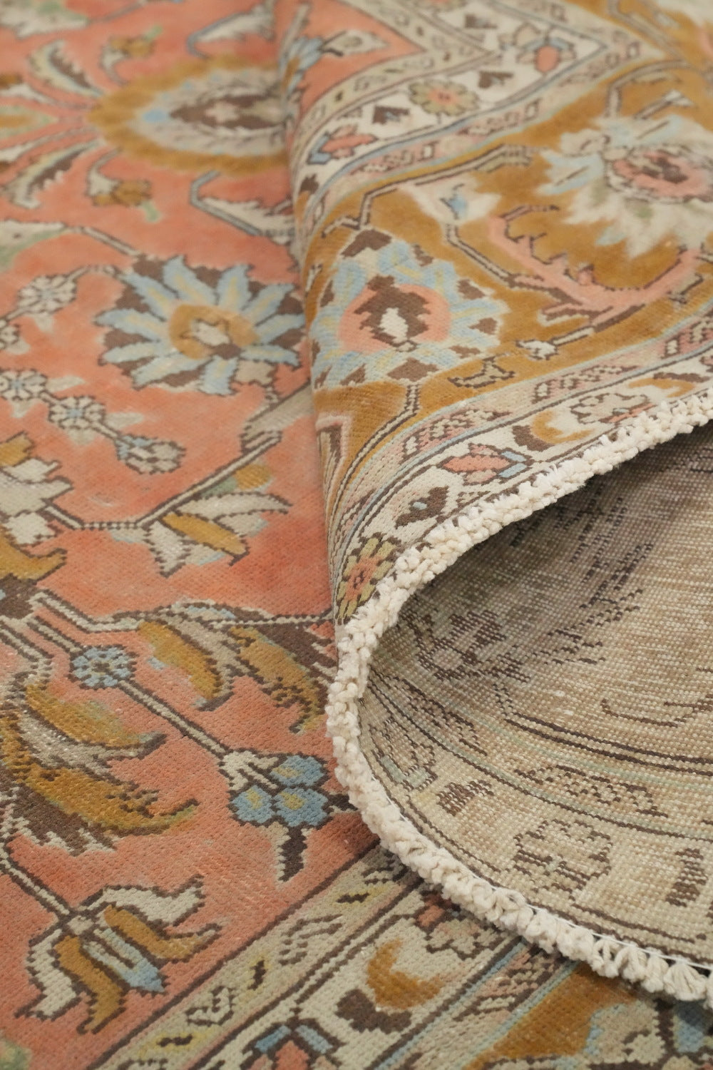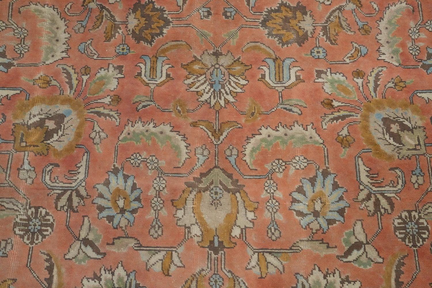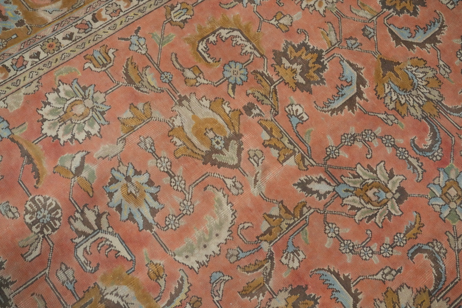 A Beautiful Genuine Persia ( Persia ) Tabriz rug is Hand Knotted by skillful weavers in Persia ( Persia ) with 100% Wool Material. This rug is in Very Good ( Low Pile ) condition. dimensions are 12' 6'' X 9' 7'' in foot and 381 X 292 in centimeter. the primary color is Pink.