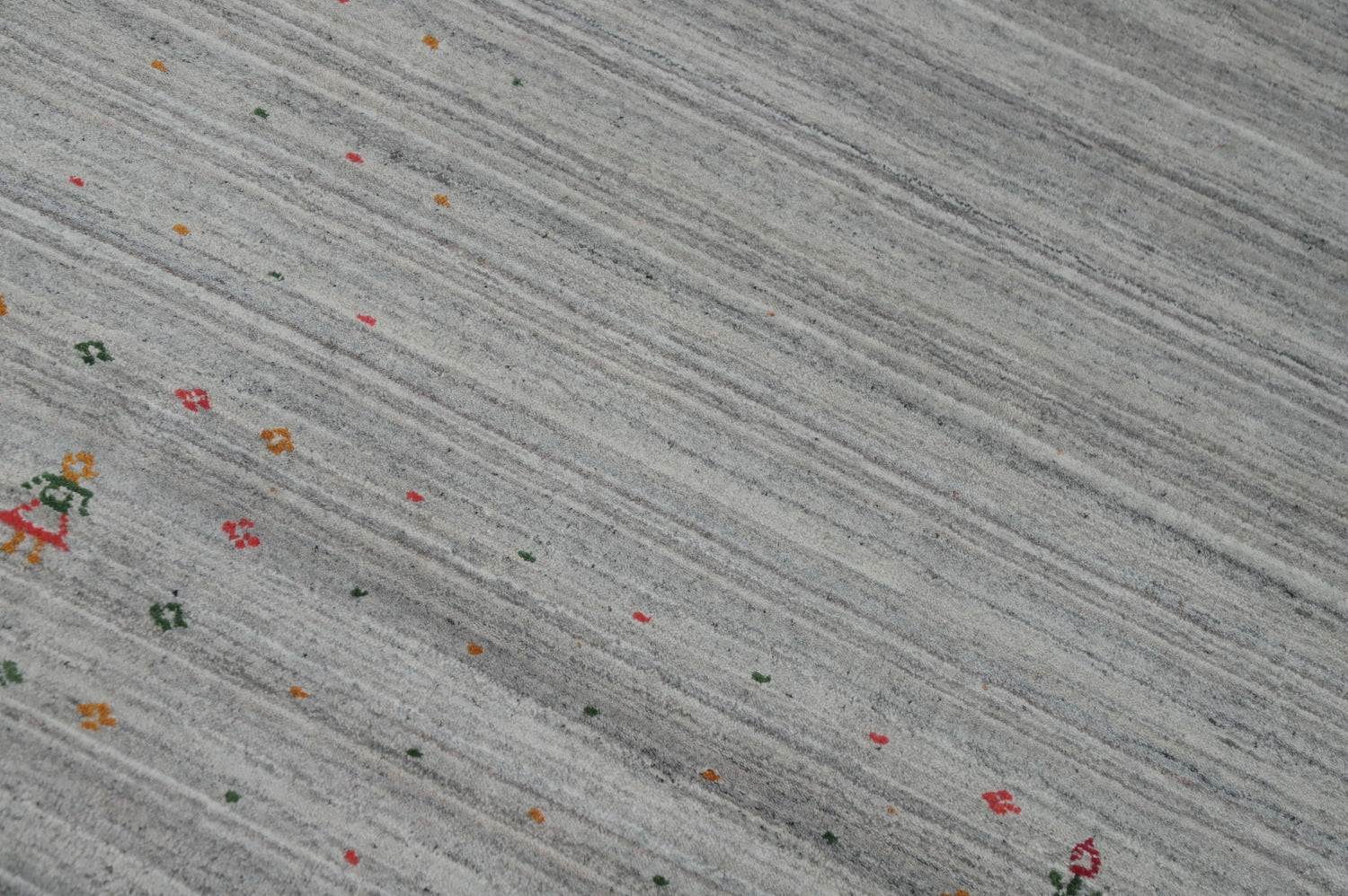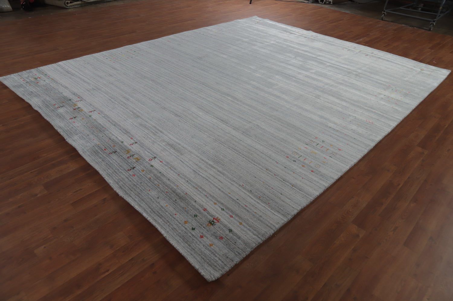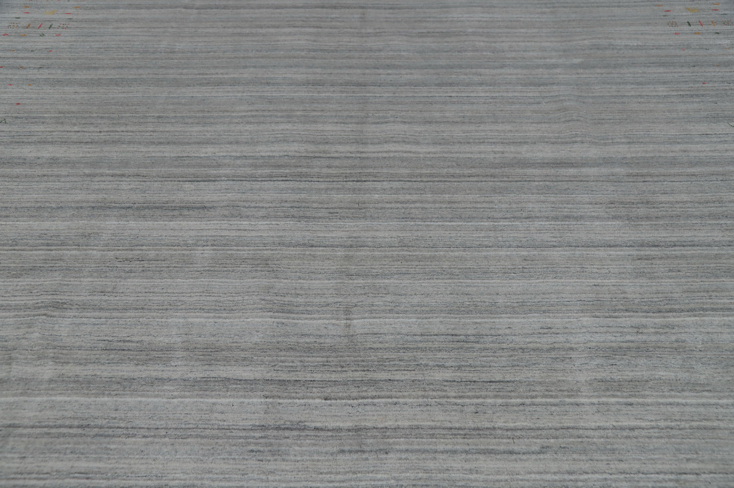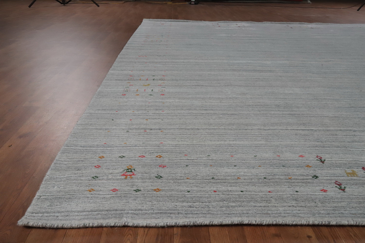 A Beautiful Genuine India Gabbeh rug is Hand Knotted by skillful weavers in India with 100% Wool Material. This rug is in New, First Quality condition. dimensions are 11' 8'' X 9' 3'' in foot and 356 X 282 in centimeter. the primary color is Greys & Charcoal.