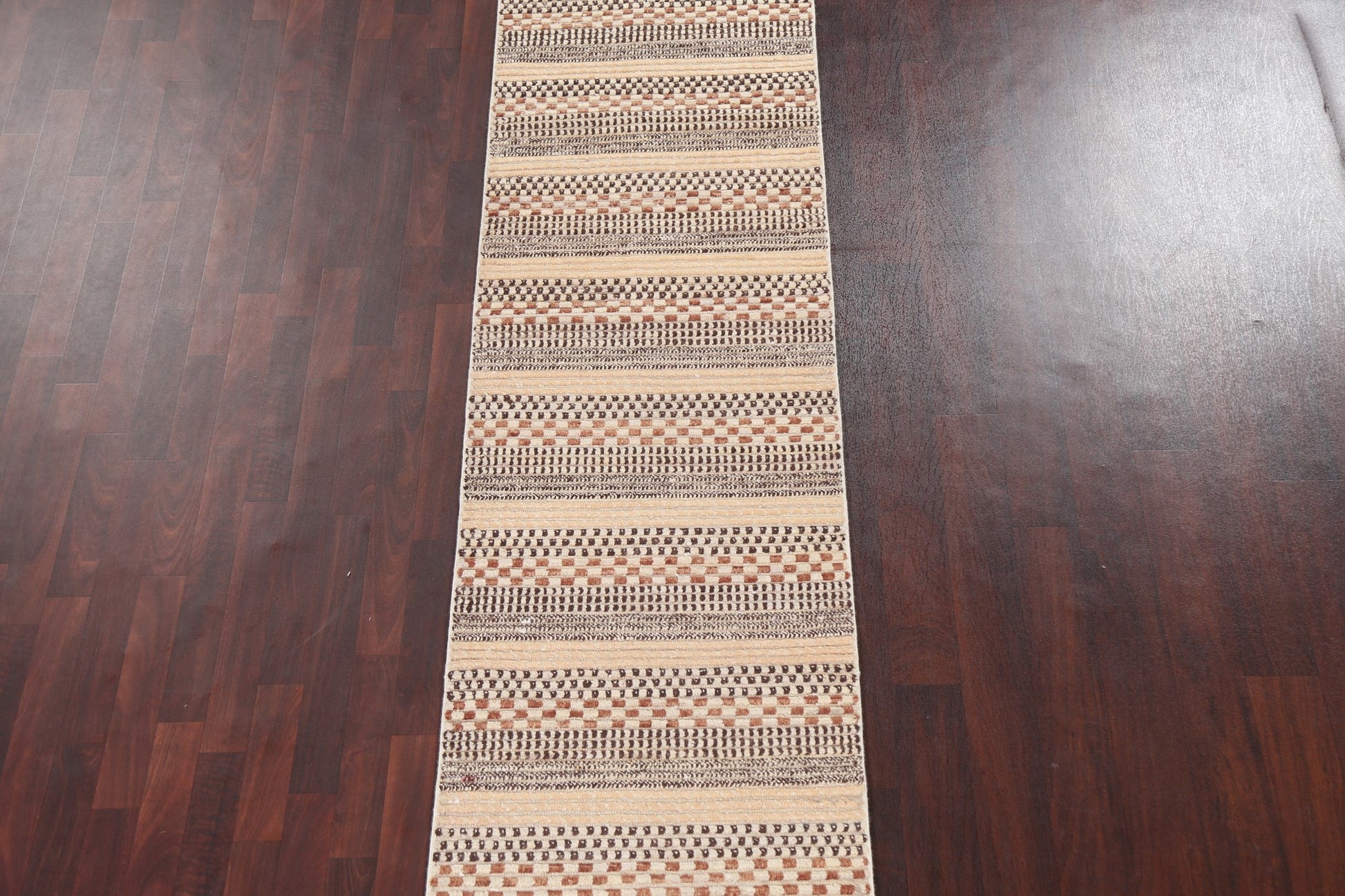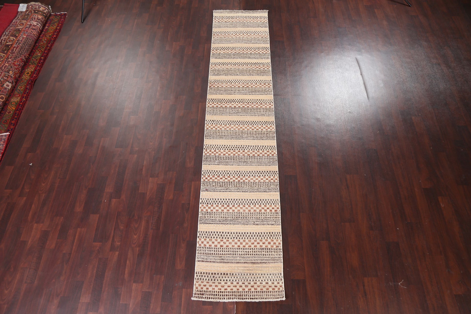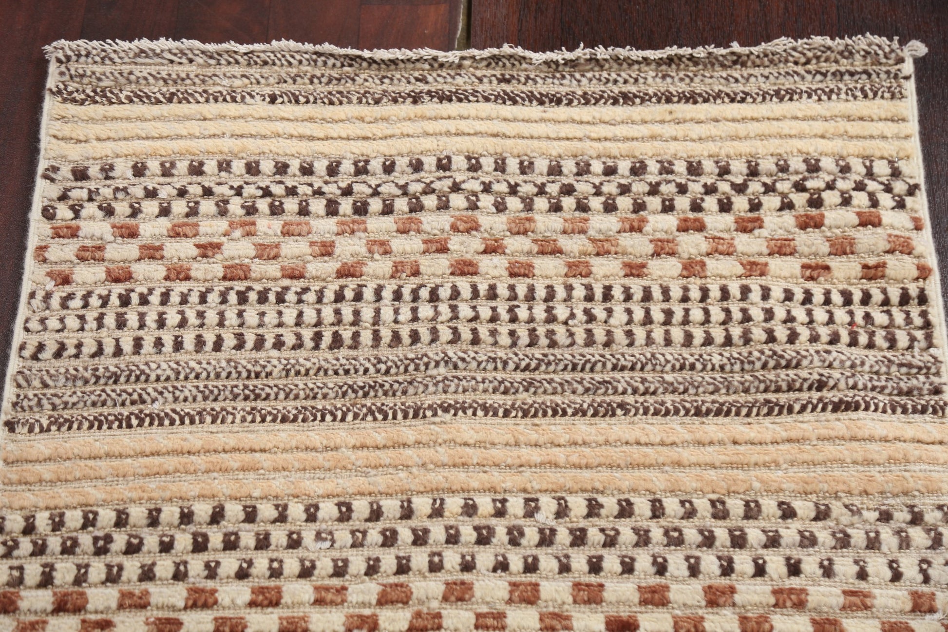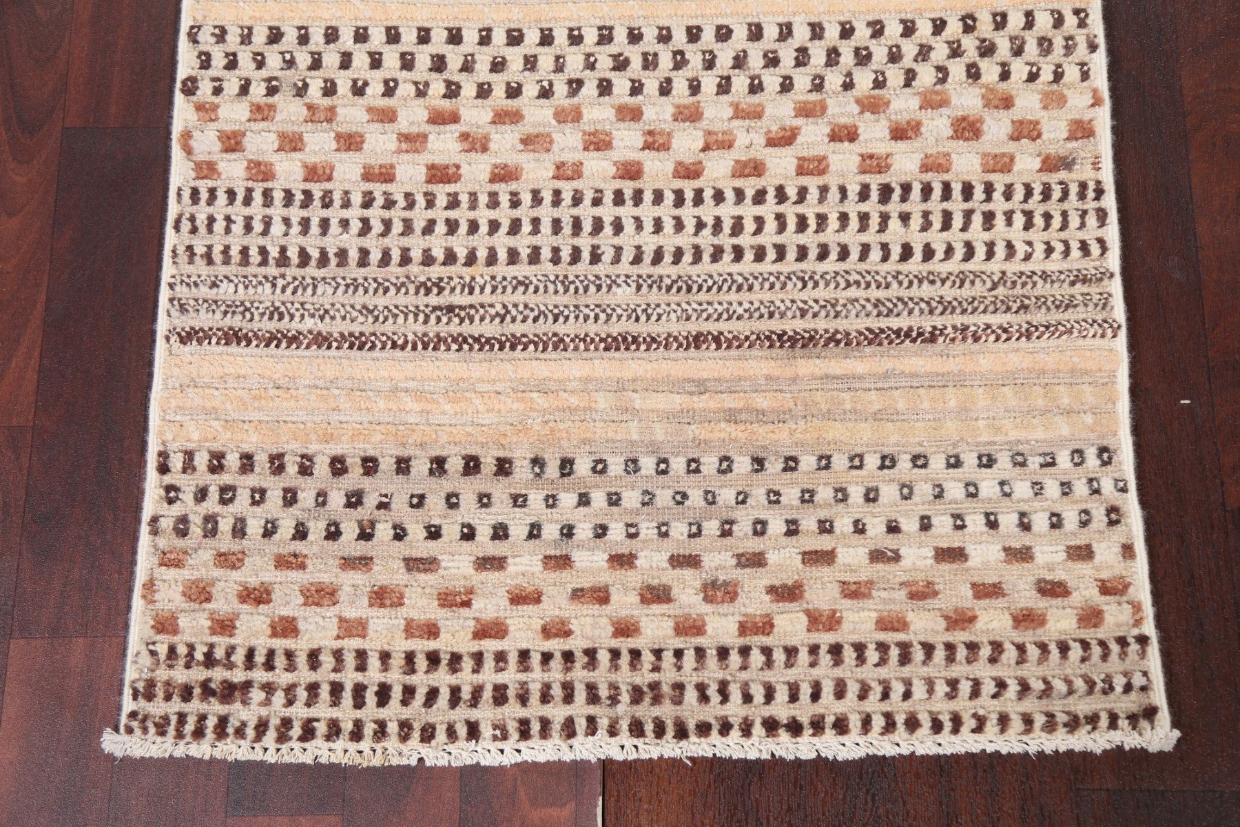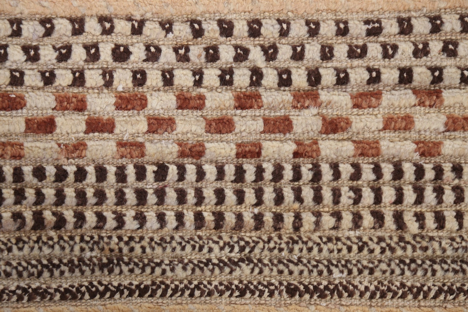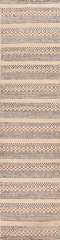 A Beautiful Genuine Pakistan Gabbeh (kashkoli) rug is Hand Knotted by skillful weavers in Pakistan with 100% Wool Material. This rug is in New, First Quality condition. dimensions are 12' 5'' X 2' 6'' in foot and 378 X 76 in centimeter. the primary color is Beige & Ivories.