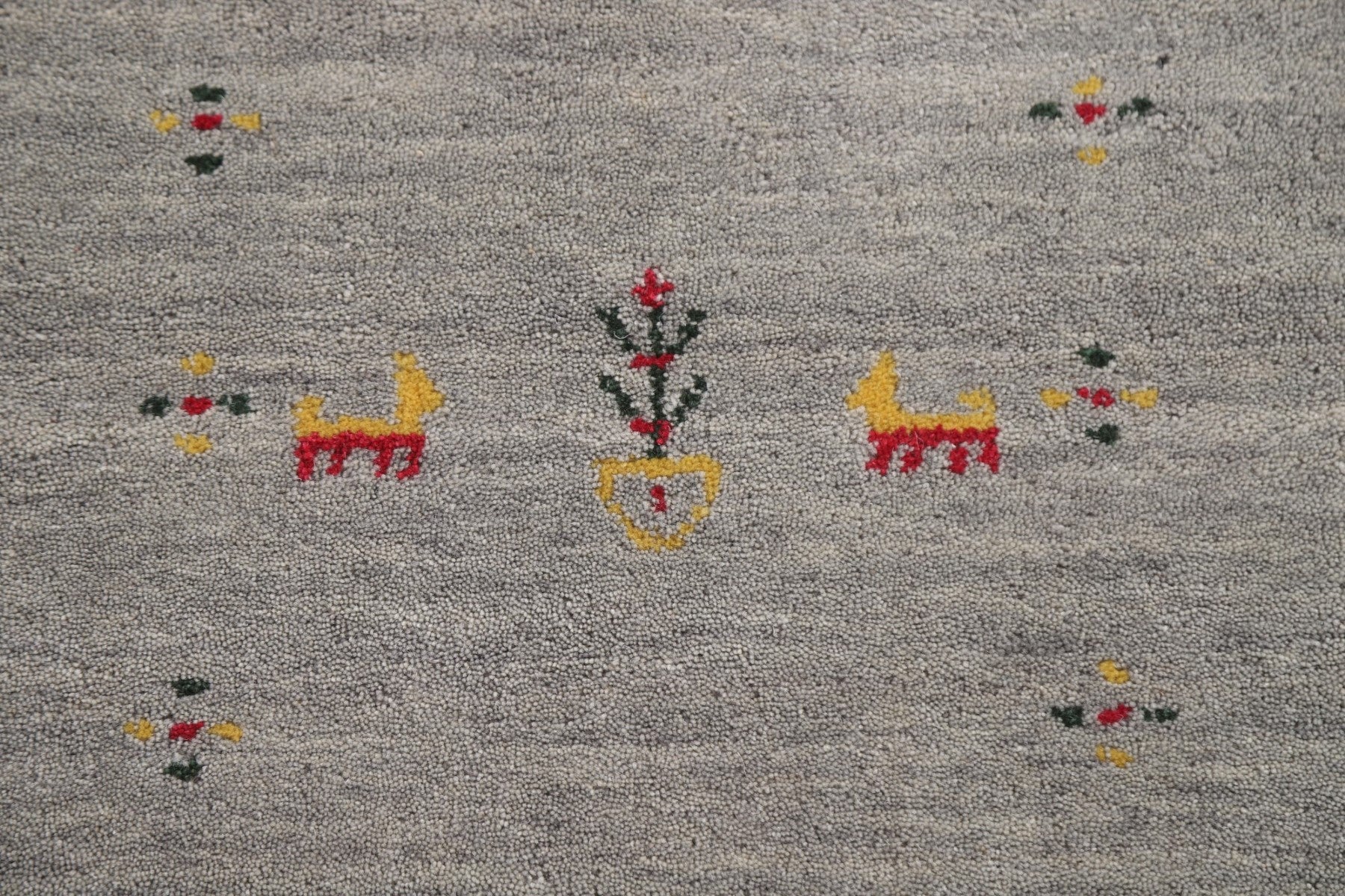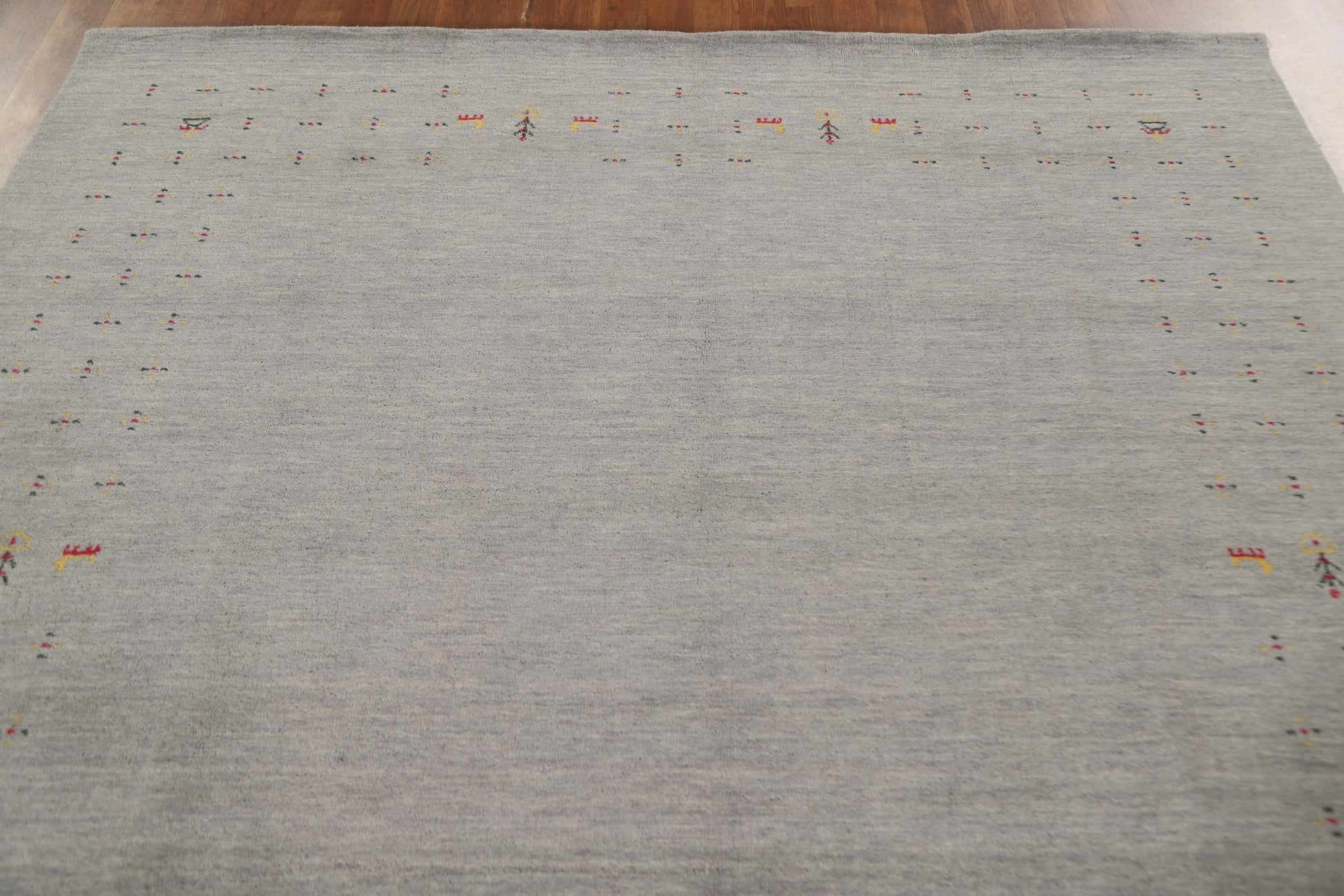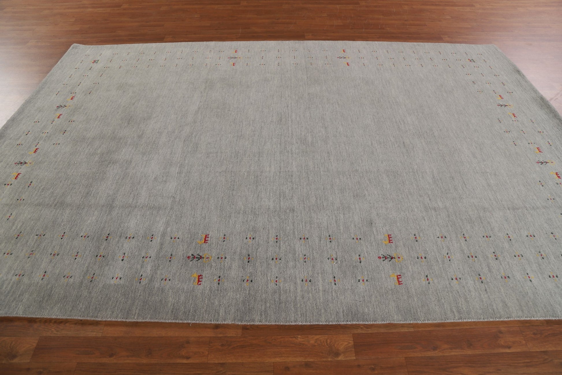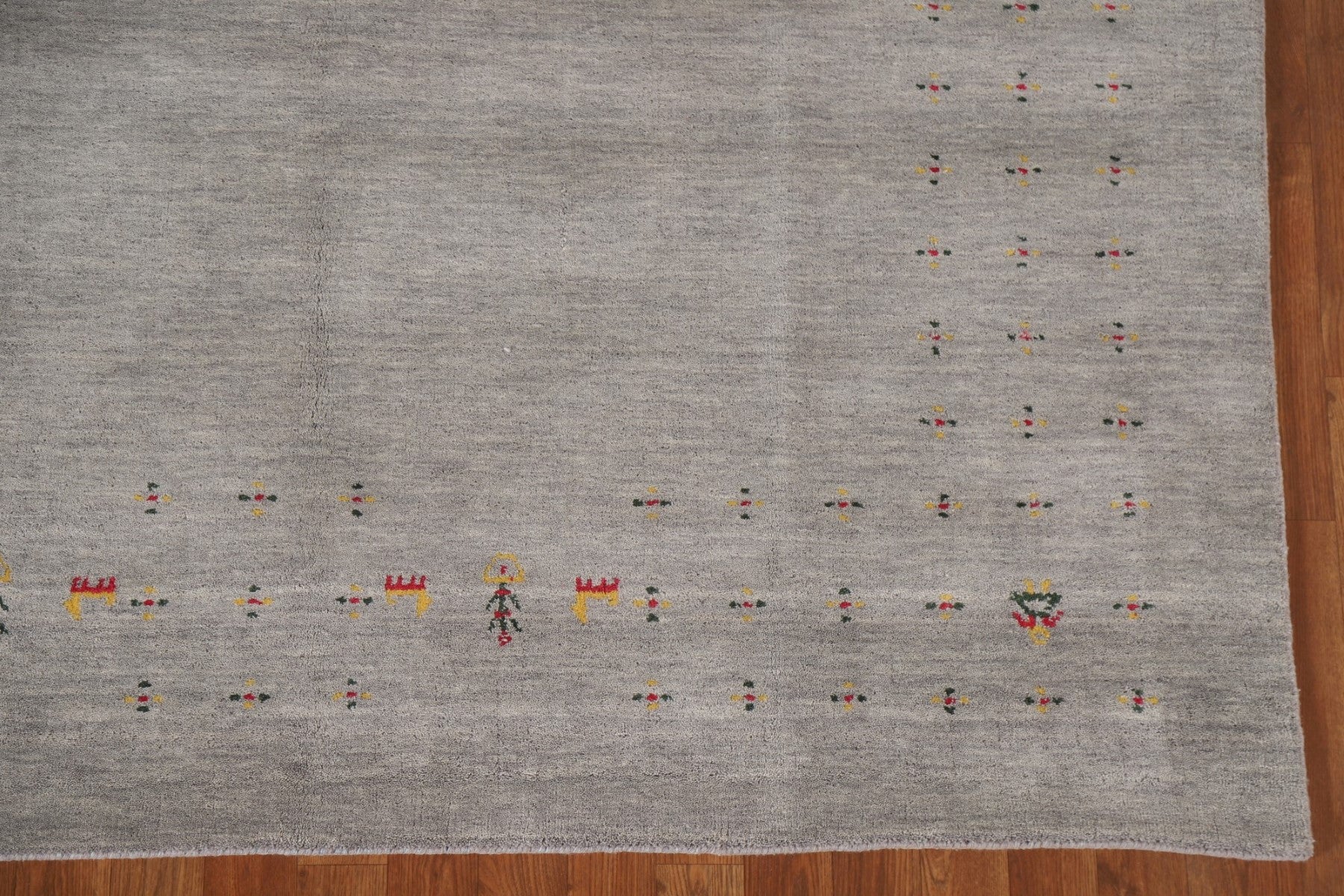 A Beautiful Genuine India Gabbeh rug is Hand Knotted by skillful weavers in India with 100% Wool Material. This rug is in New, First Quality condition. dimensions are 9' 9'' X 6' 8'' in foot and 297 X 203 in centimeter. the primary color is Greys & Charcoal.