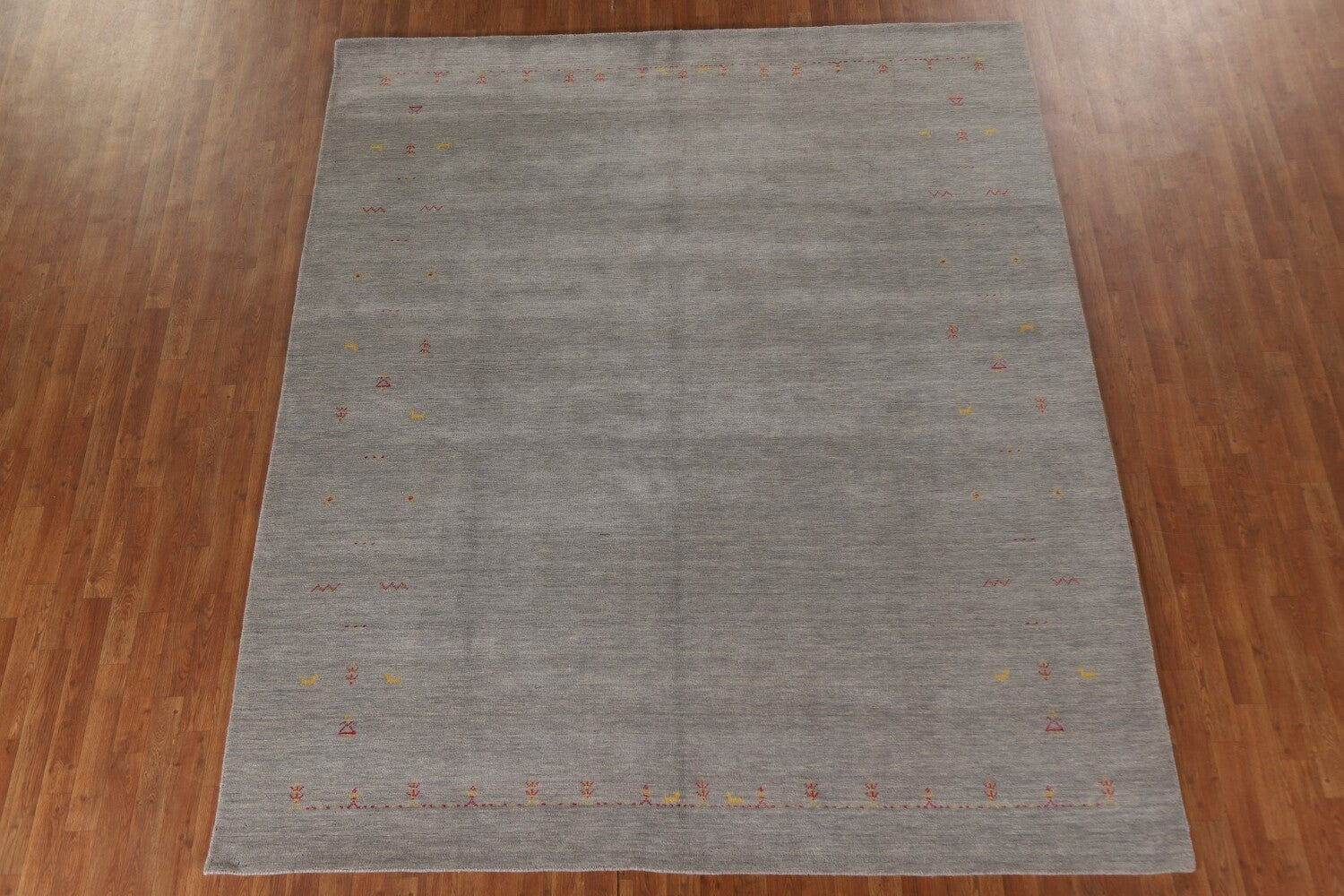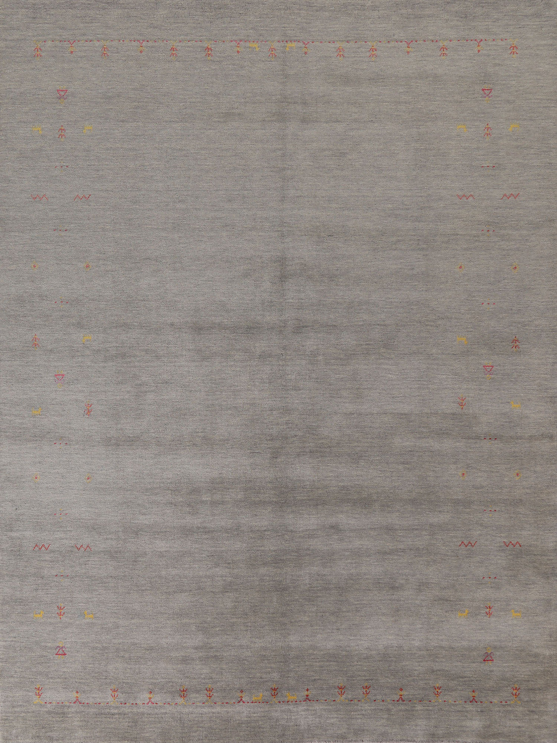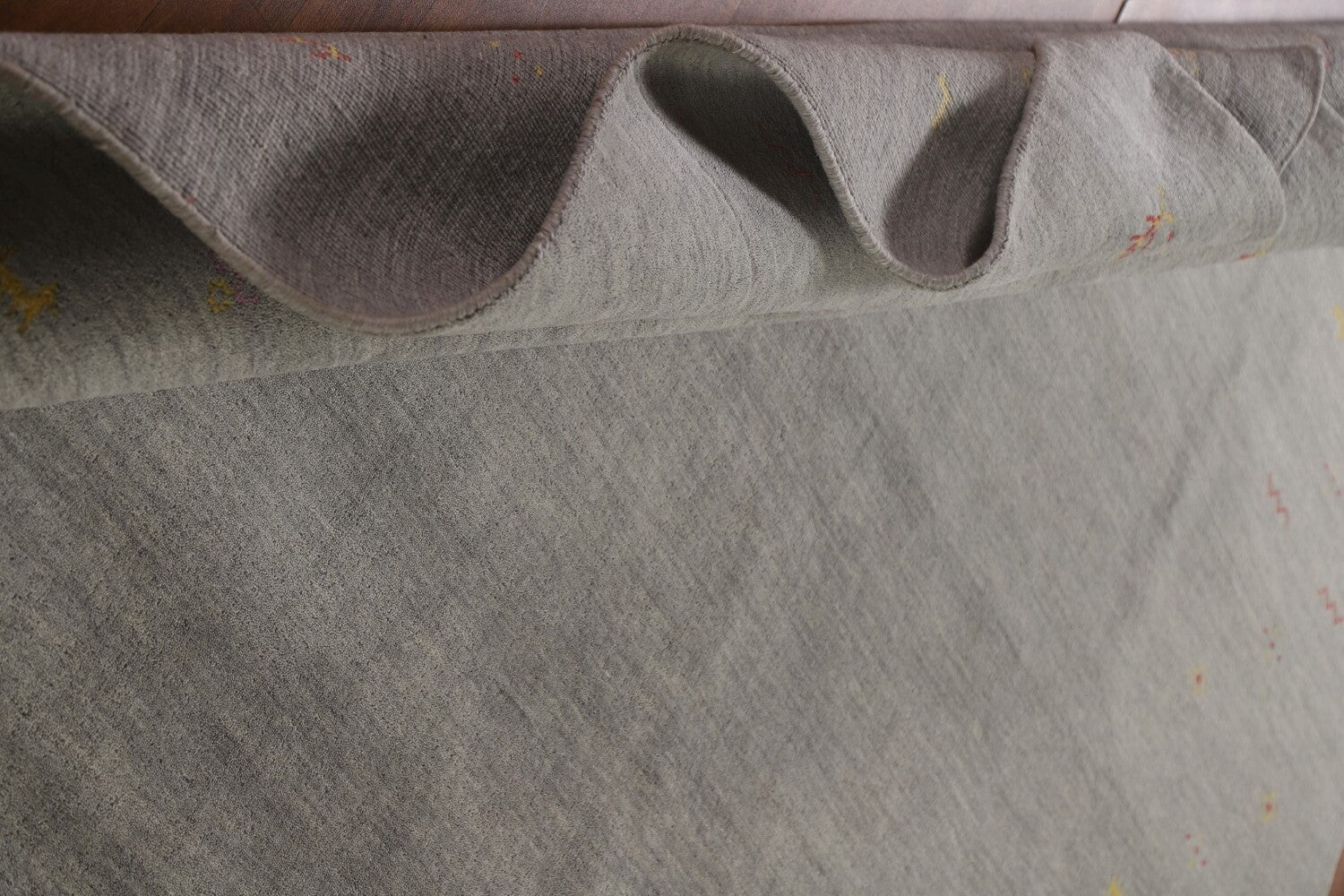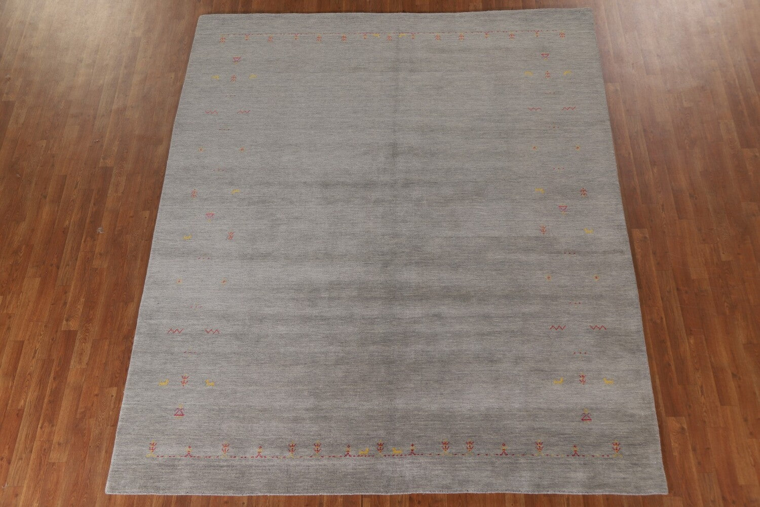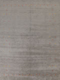 A Beautiful Genuine India Gabbeh rug is Hand Knotted by skillful weavers in India with 100% Wool Material. This rug is in New, First Quality condition. dimensions are 9' 8'' X 8' 1'' in foot and 295 X 246 in centimeter. the primary color is Greys & Charcoal.
