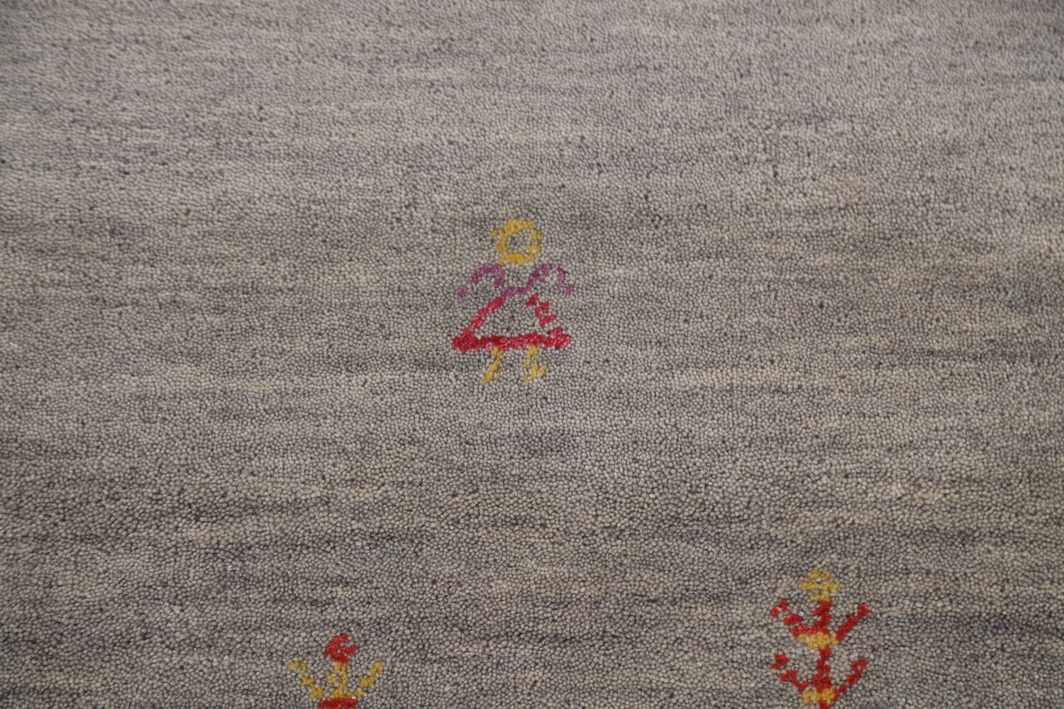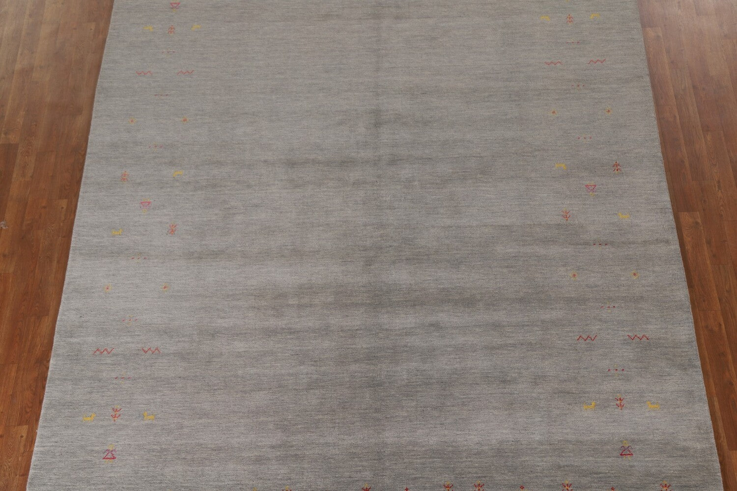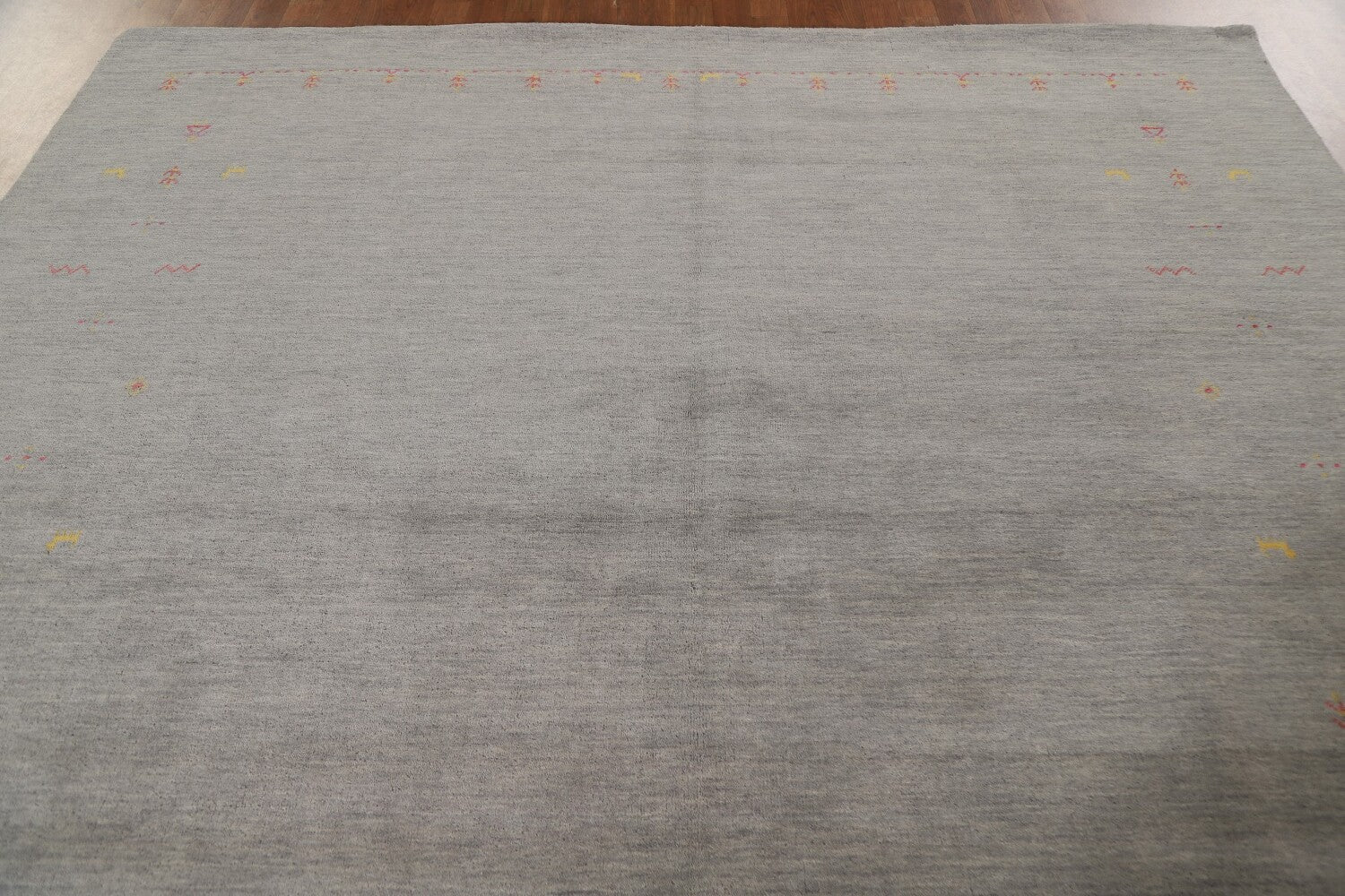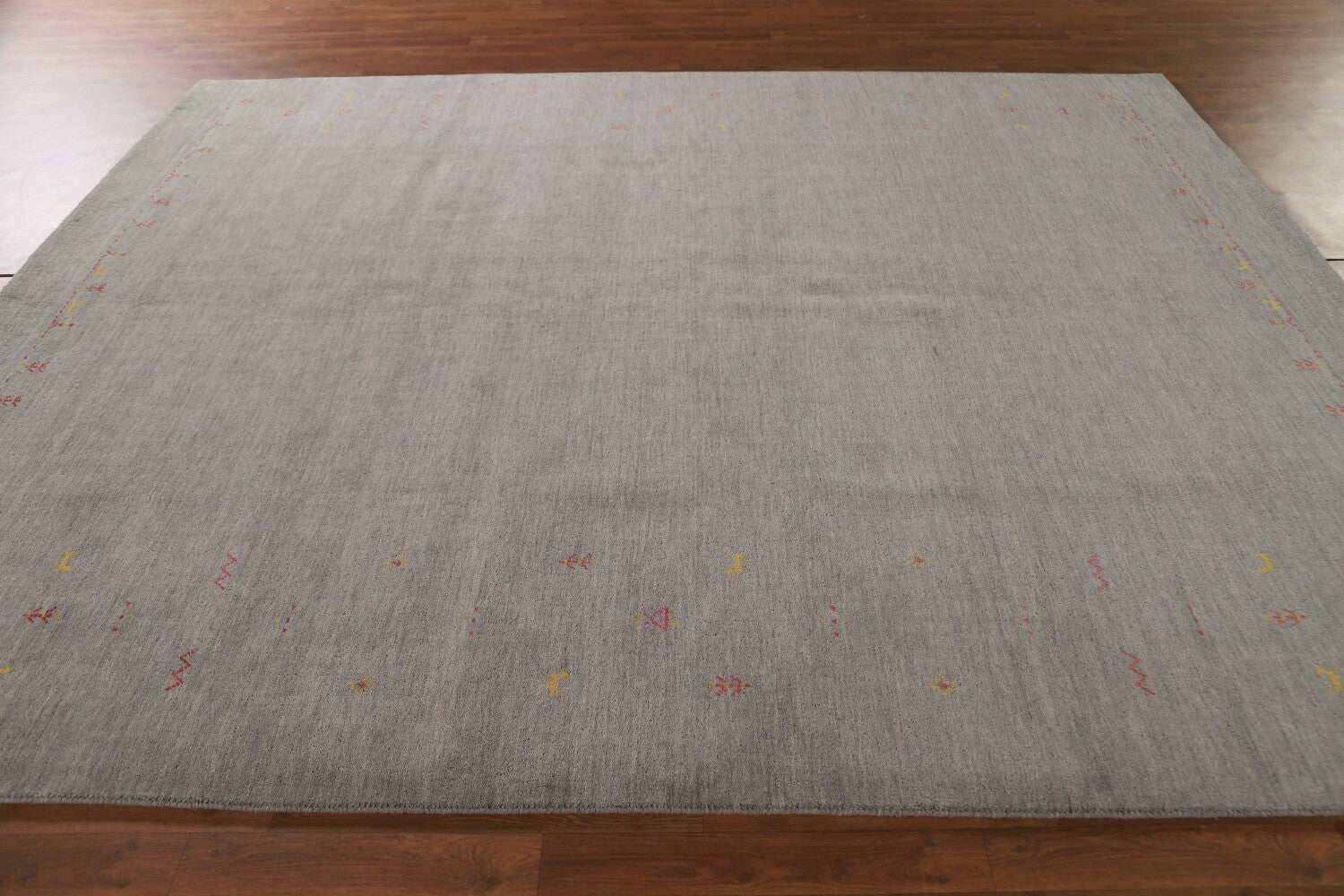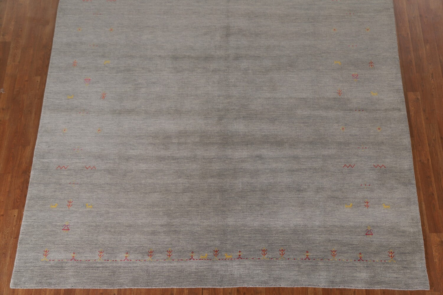 A Beautiful Genuine India Gabbeh rug is Hand Knotted by skillful weavers in India with 100% Wool Material. This rug is in New, First Quality condition. dimensions are 9' 8'' X 8' 1'' in foot and 295 X 246 in centimeter. the primary color is Greys & Charcoal.