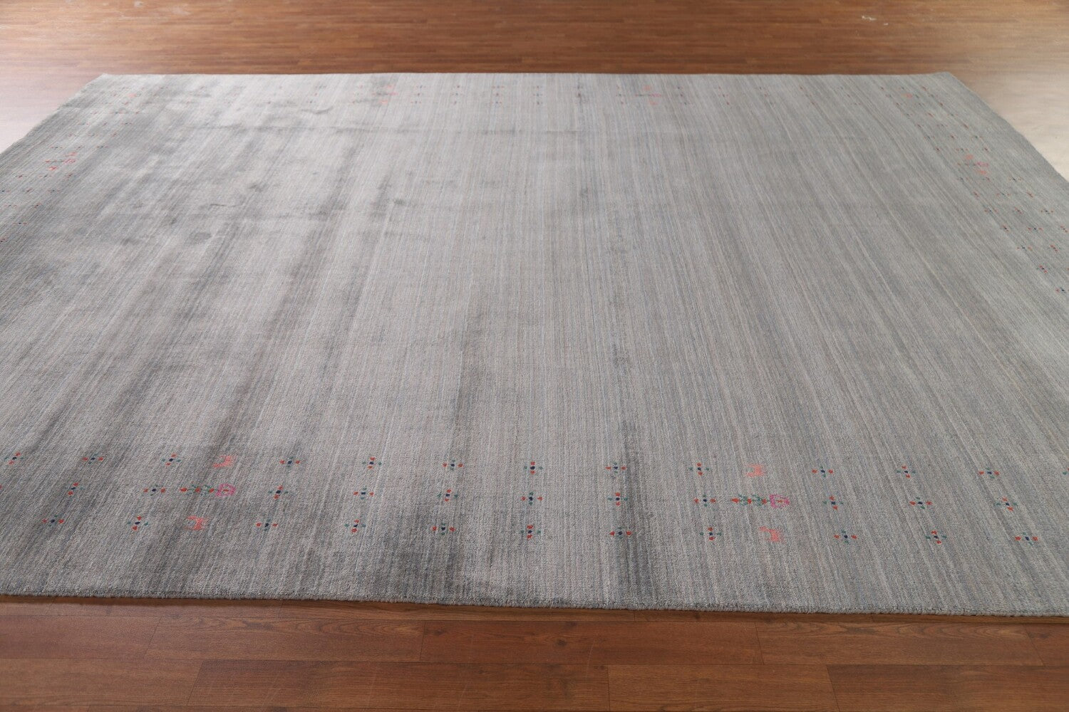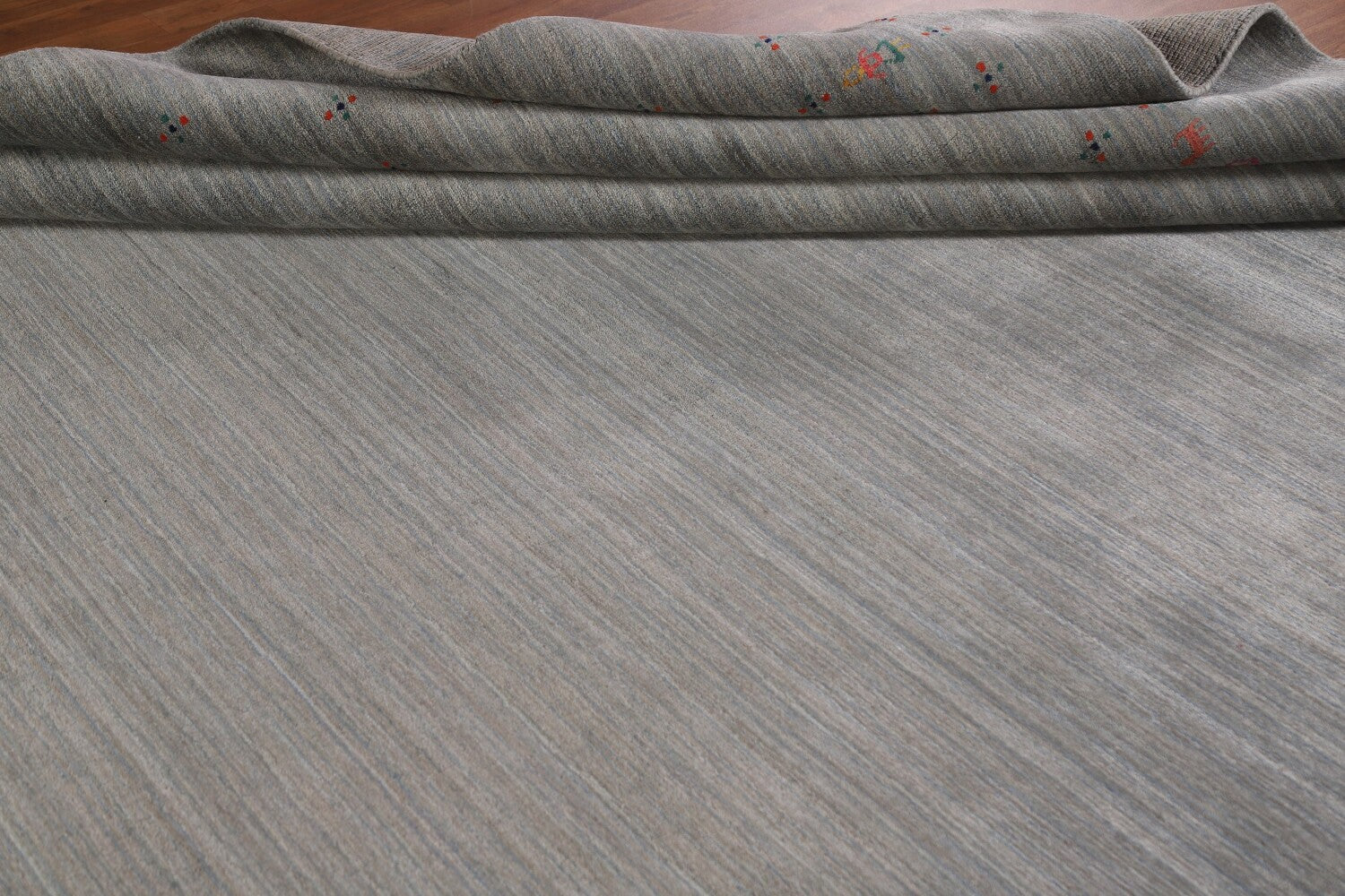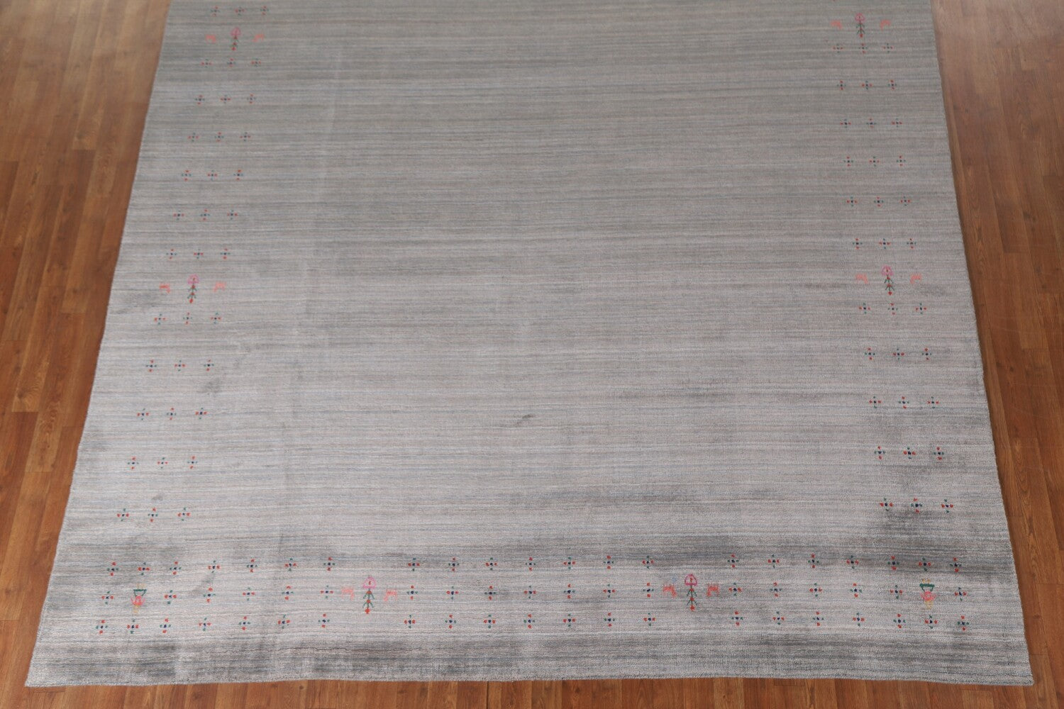 A Beautiful Genuine India Gabbeh rug is Hand Knotted by skillful weavers in India with 100% Wool Material. This rug is in New, First Quality condition. dimensions are 11' 11'' X 9' 1'' in foot and 363 X 277 in centimeter. the primary color is Greys & Charcoal.