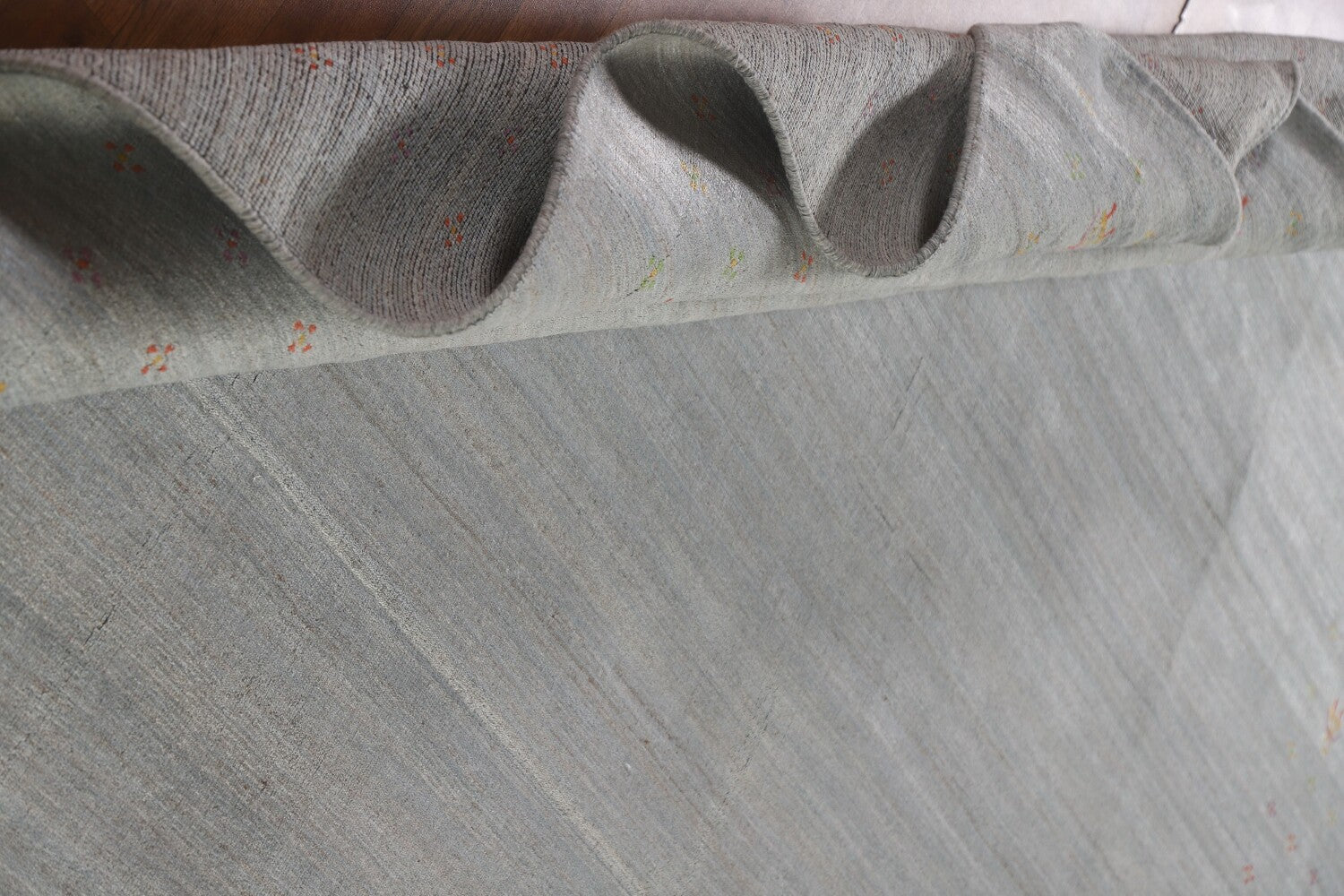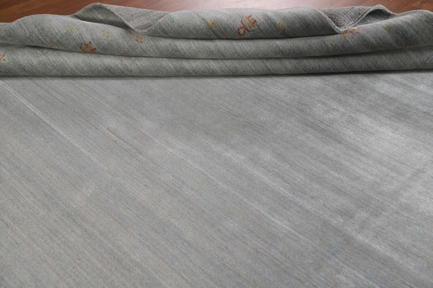A Beautiful Genuine India Gabbeh rug is Hand Knotted by skillful weavers in India with 100% Wool Material. This rug is in New, First Quality condition. dimensions are 11' 9'' X 8' 11'' in foot and 358 X 272 in centimeter. the primary color is Greys & Charcoal.