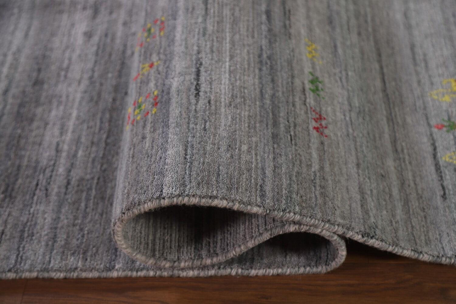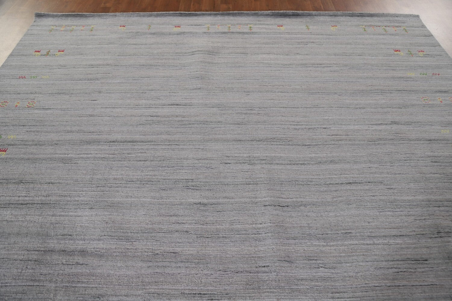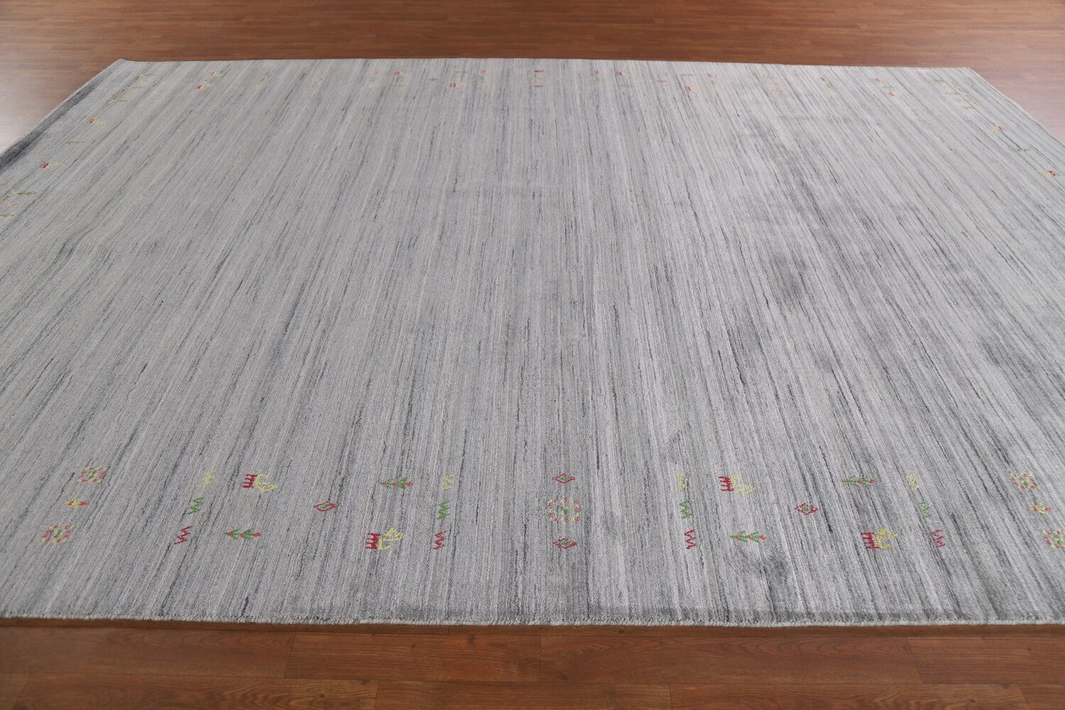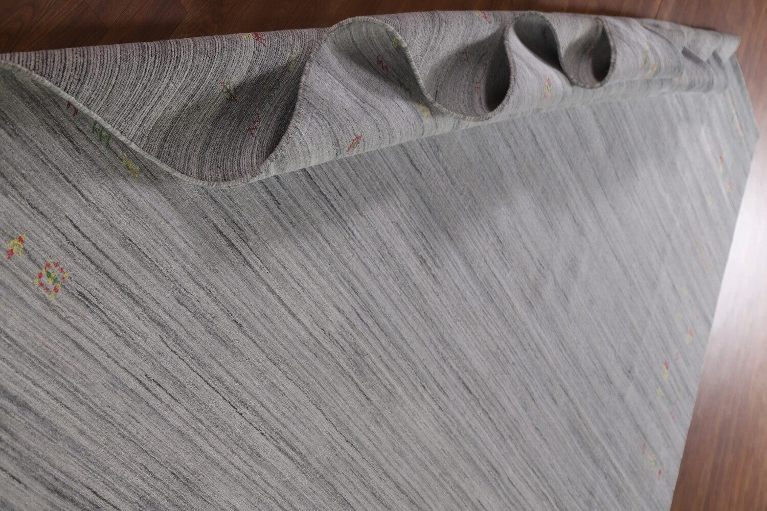 A Beautiful Genuine India Gabbeh rug is Hand Knotted by skillful weavers in India with 100% Wool Material. This rug is in New, First Quality condition. dimensions are 12' 0'' X 8' 11'' in foot and 366 X 272 in centimeter. the primary color is Greys & Charcoal.