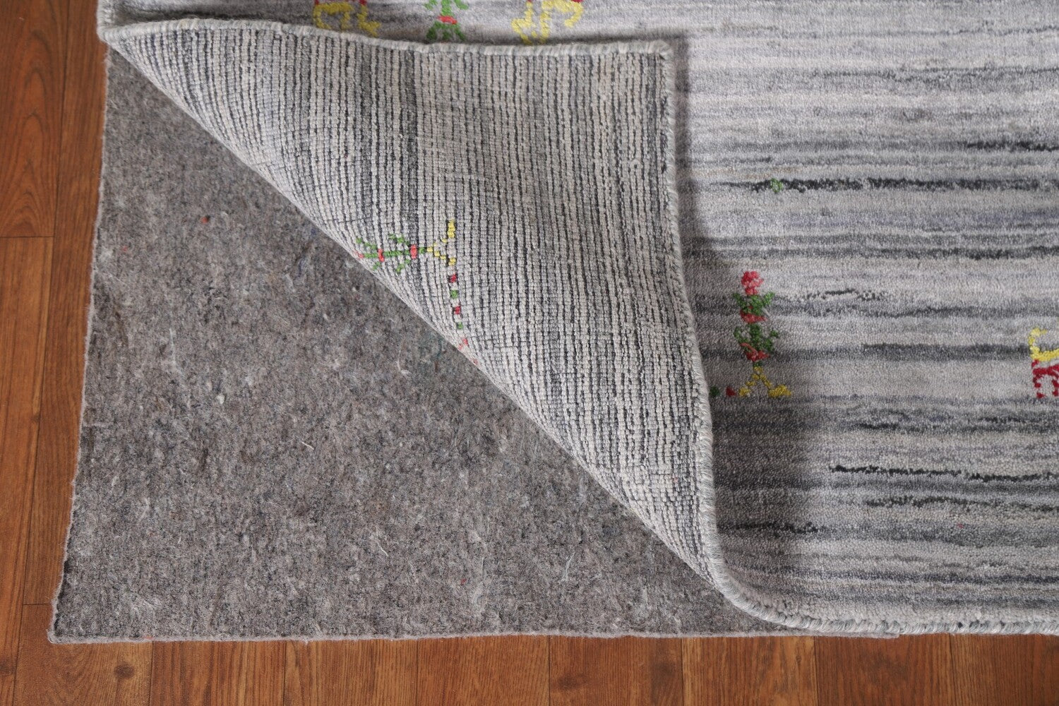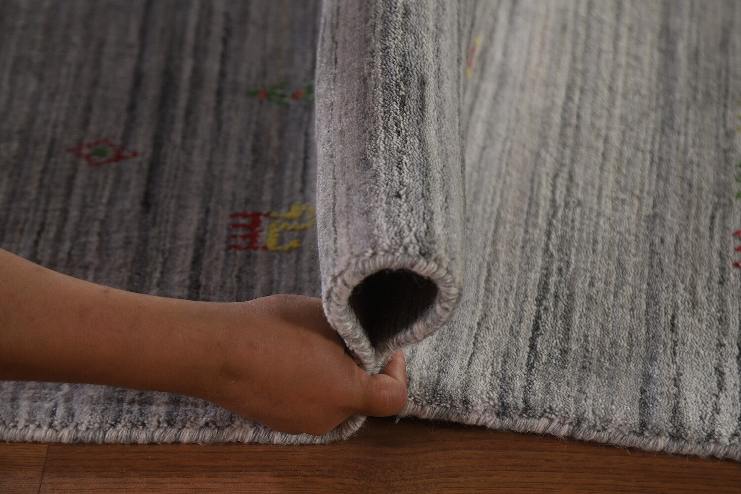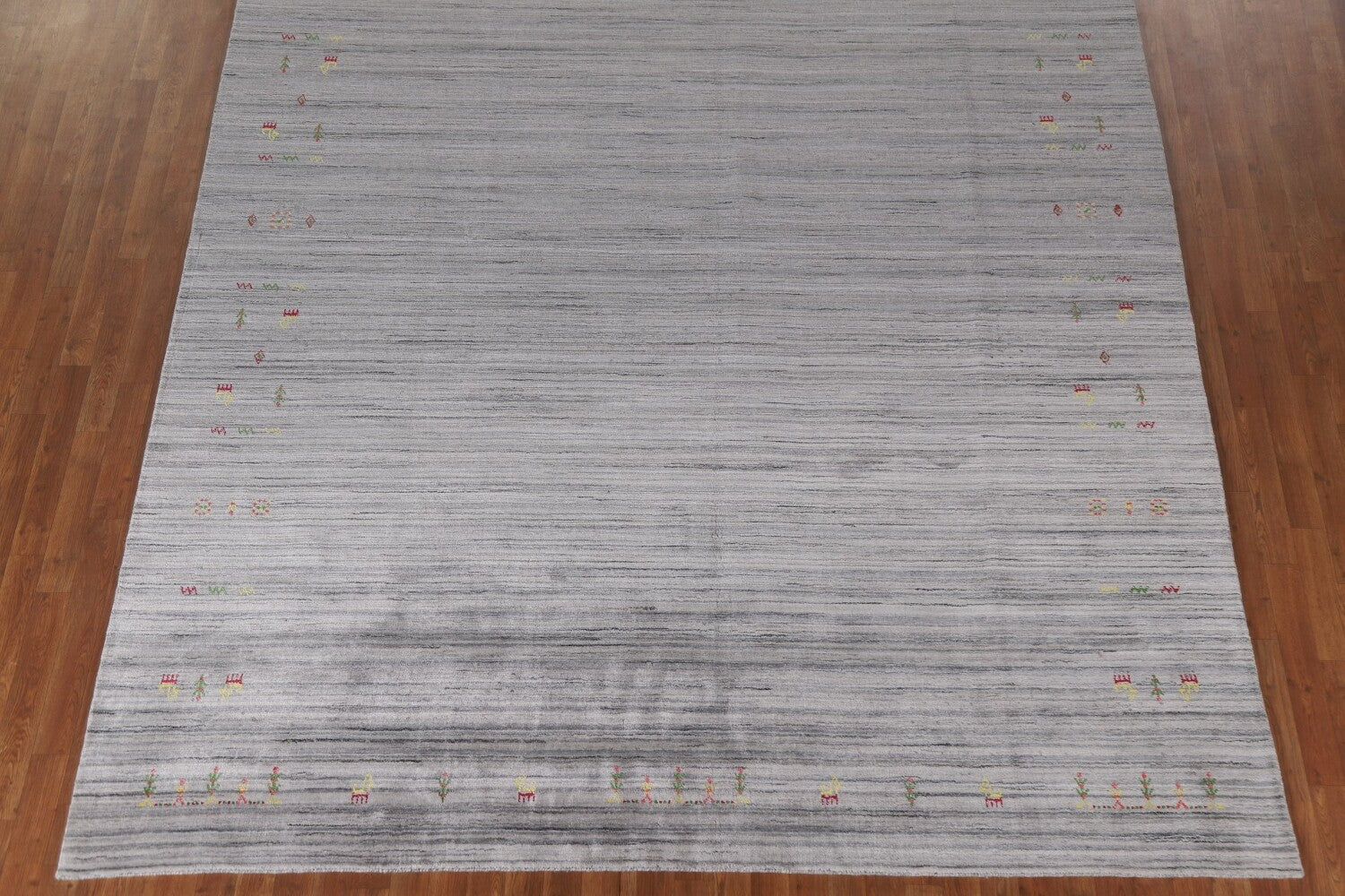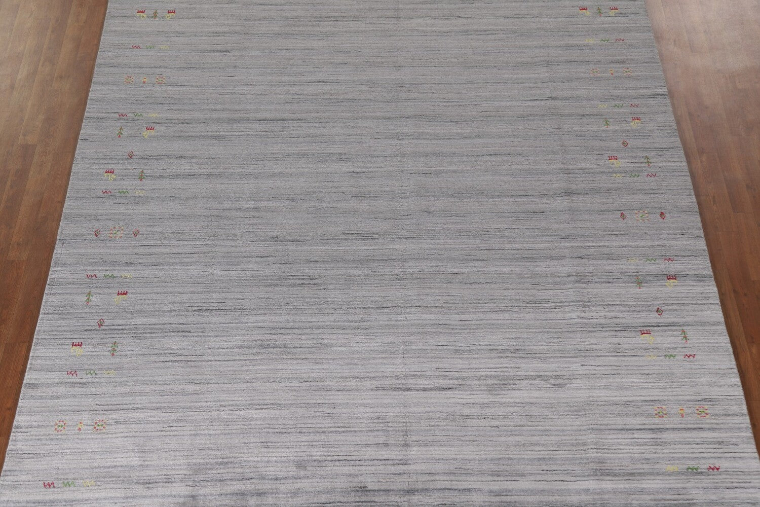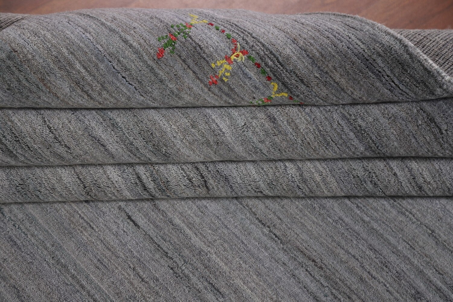 A Beautiful Genuine India Gabbeh rug is Hand Knotted by skillful weavers in India with 100% Wool Material. This rug is in New, First Quality condition. dimensions are 12' 0'' X 8' 11'' in foot and 366 X 272 in centimeter. the primary color is Greys & Charcoal.