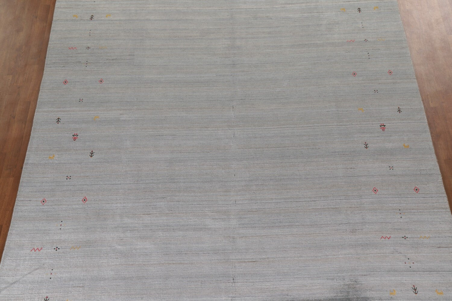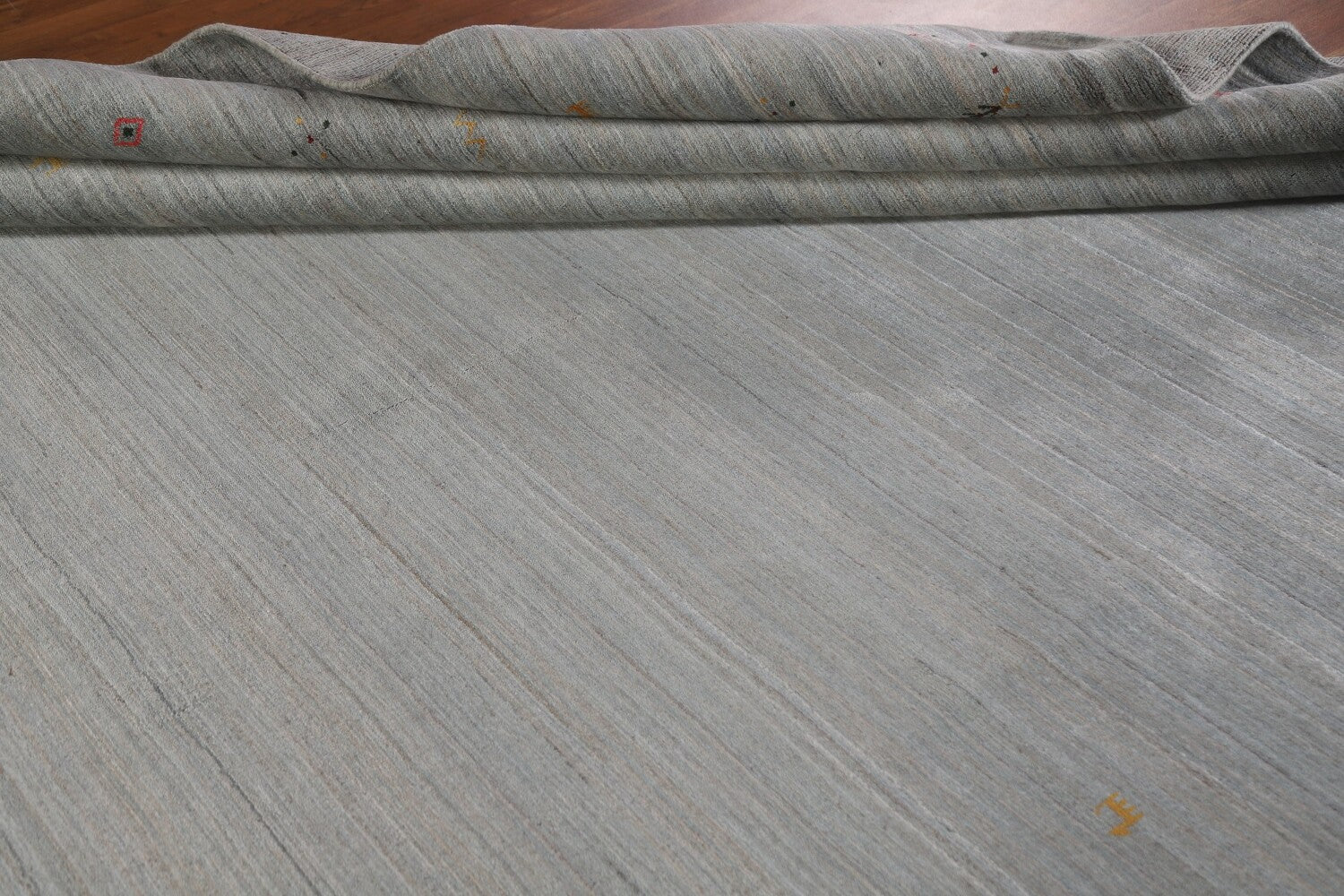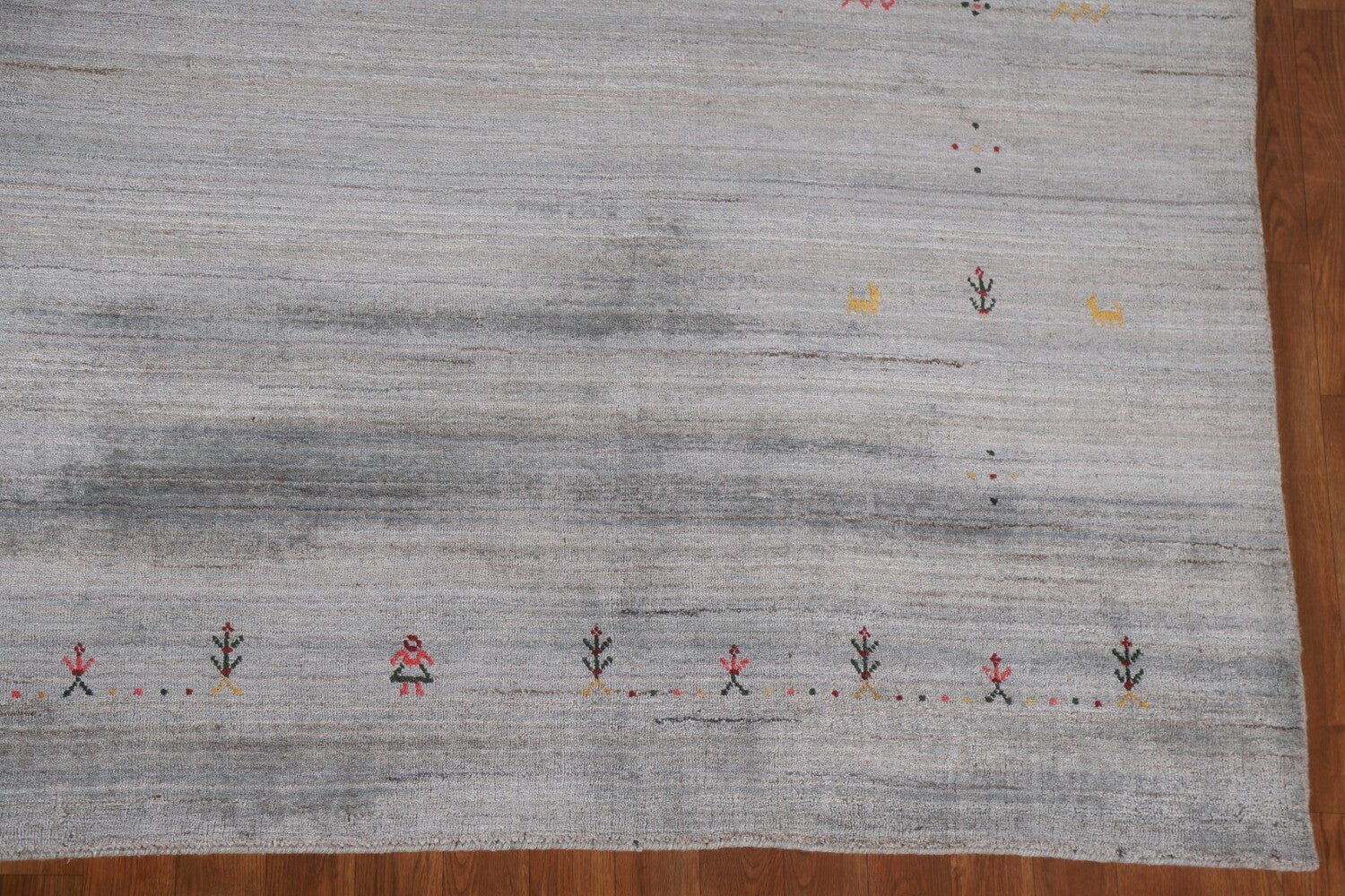 A Beautiful Genuine India Gabbeh rug is Hand Knotted by skillful weavers in India with 100% Wool Material. This rug is in New, First Quality condition. dimensions are 11' 8'' X 8' 10'' in foot and 356 X 269 in centimeter. the primary color is Greys & Charcoal.
