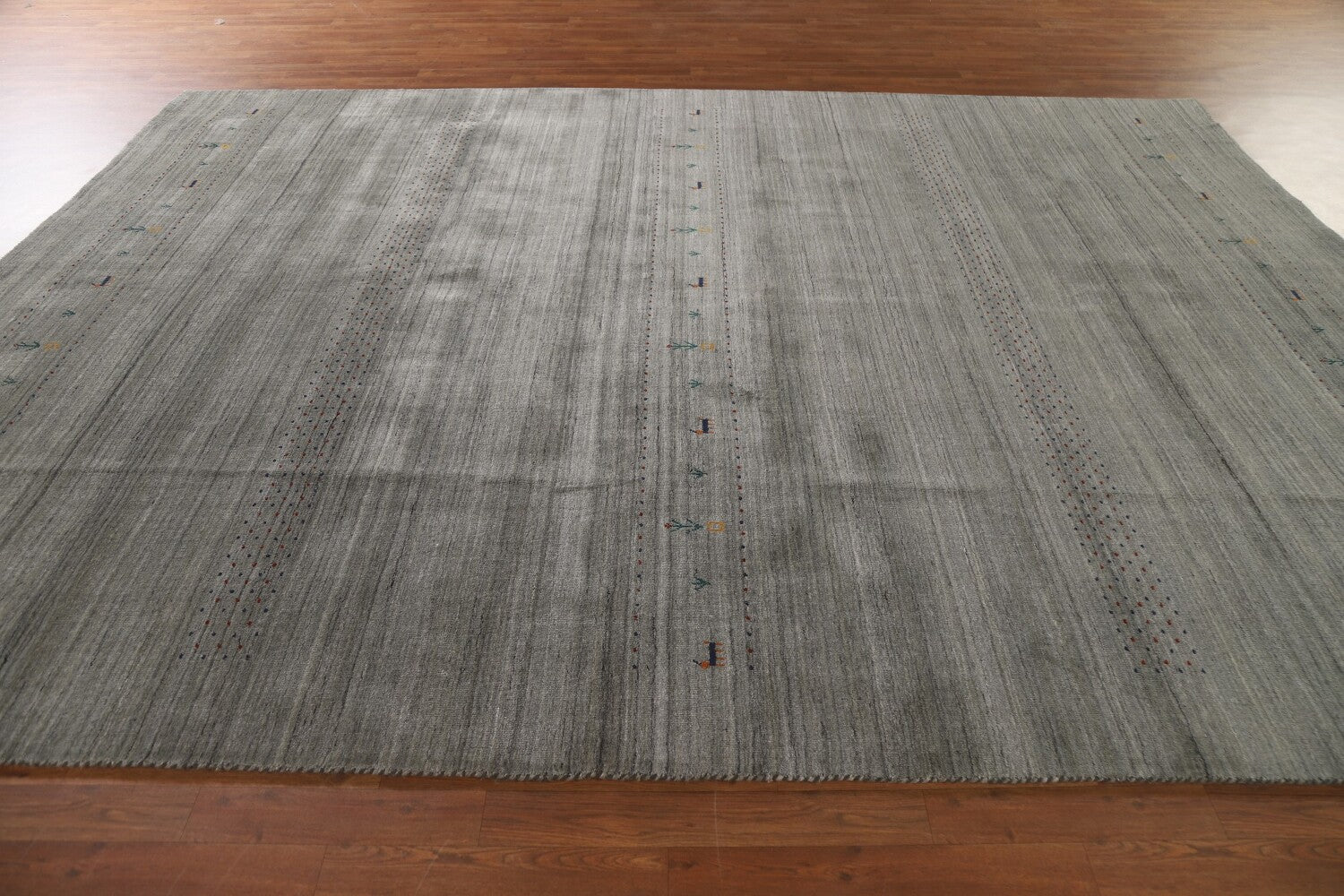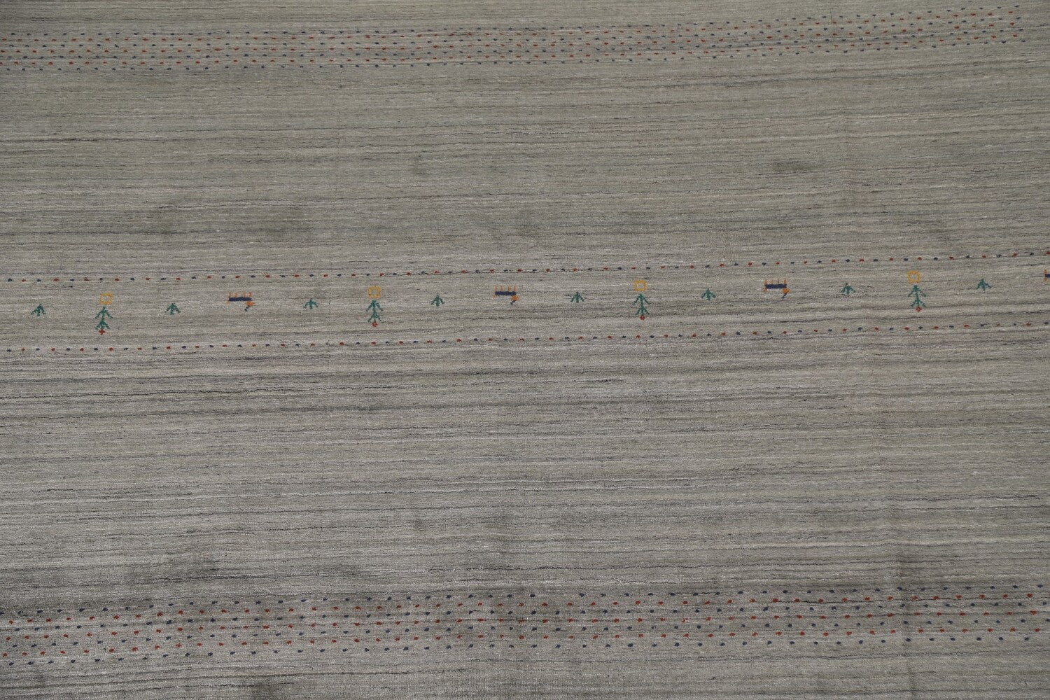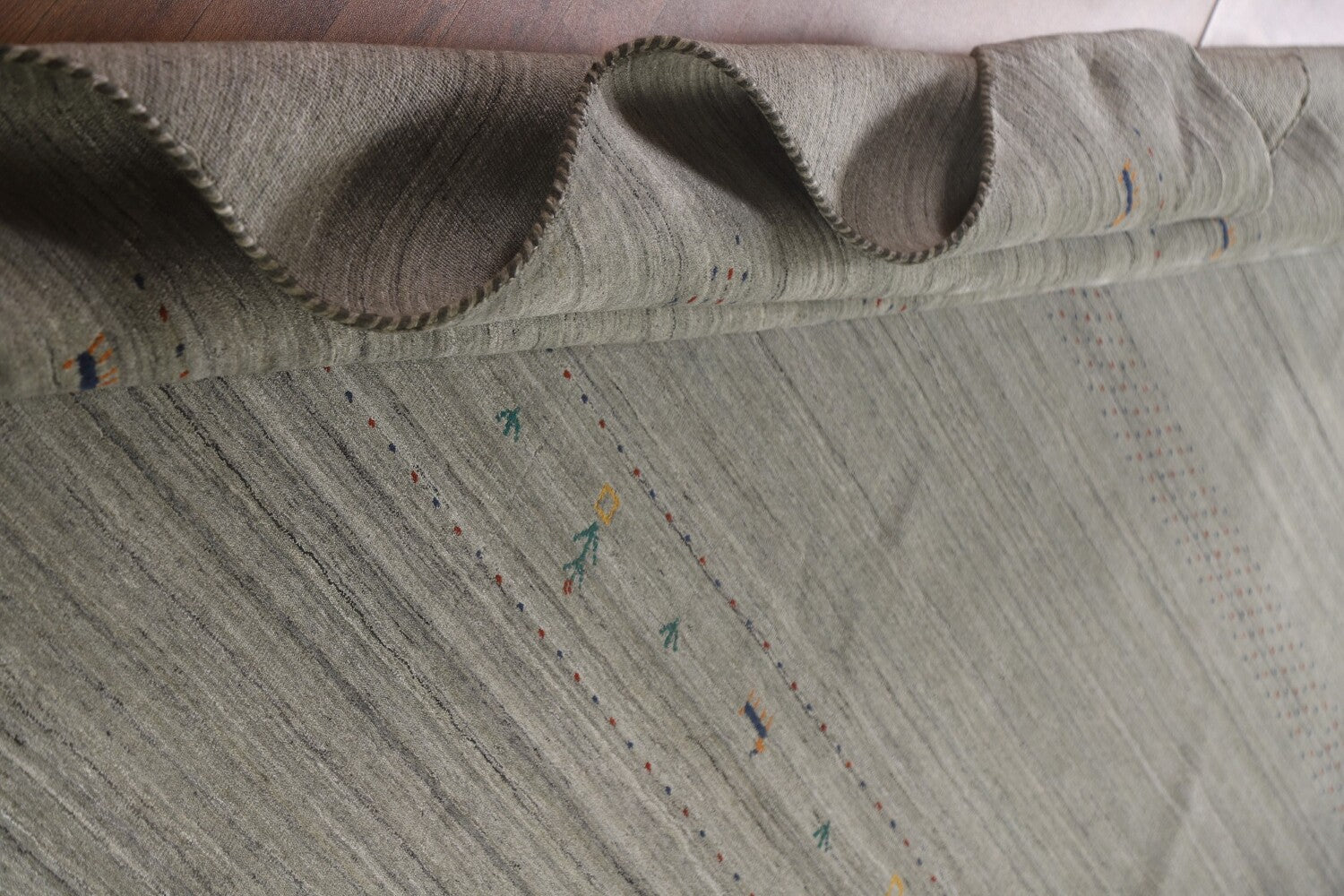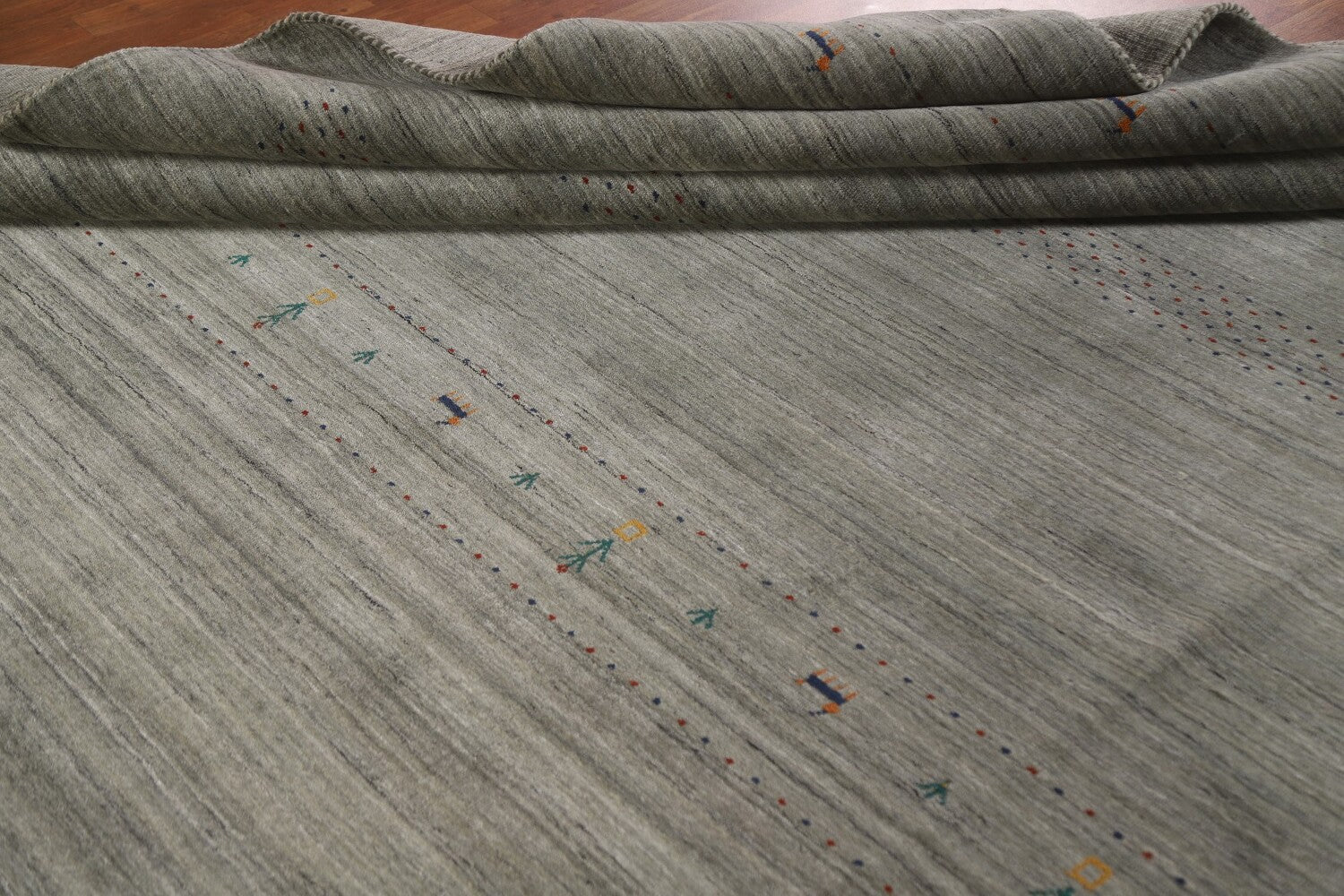 A Beautiful Genuine India Gabbeh rug is Hand Knotted by skillful weavers in India with 100% Wool Material. This rug is in New, First Quality condition. dimensions are 11' 7'' X 8' 10'' in foot and 353 X 269 in centimeter. the primary color is Greys & Charcoal.