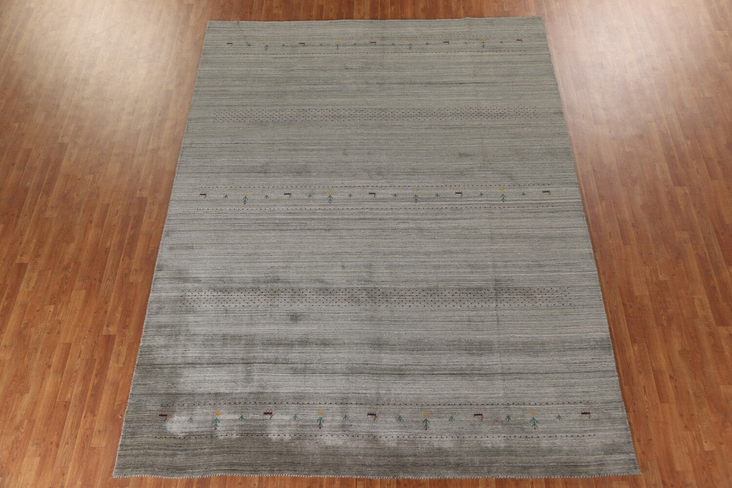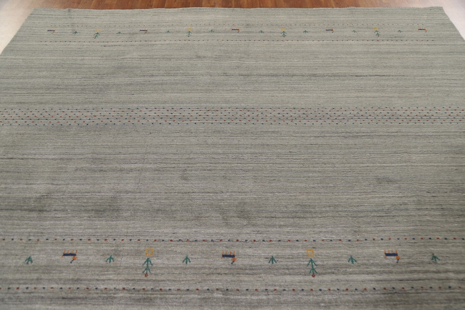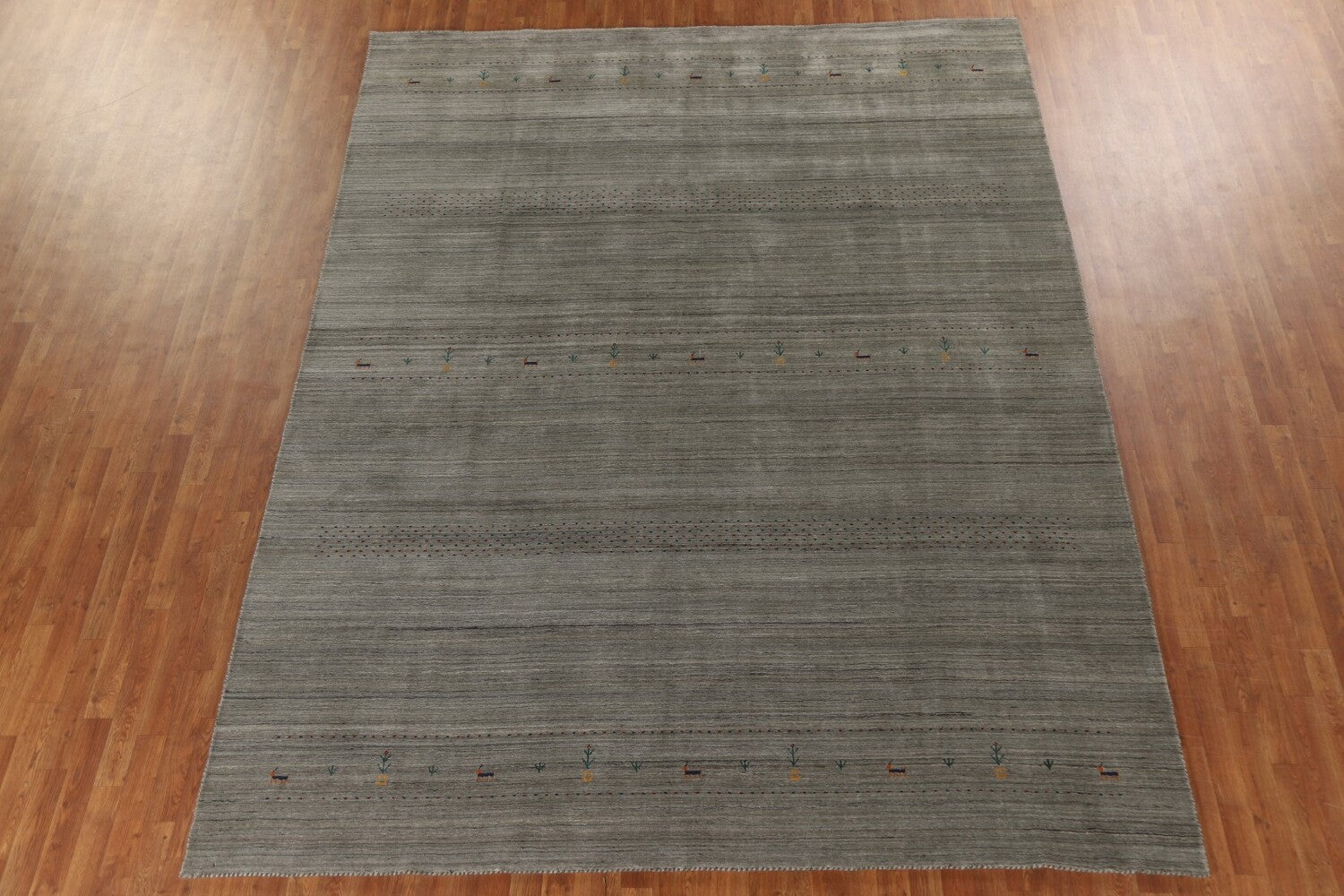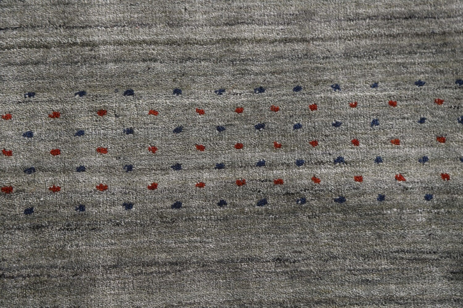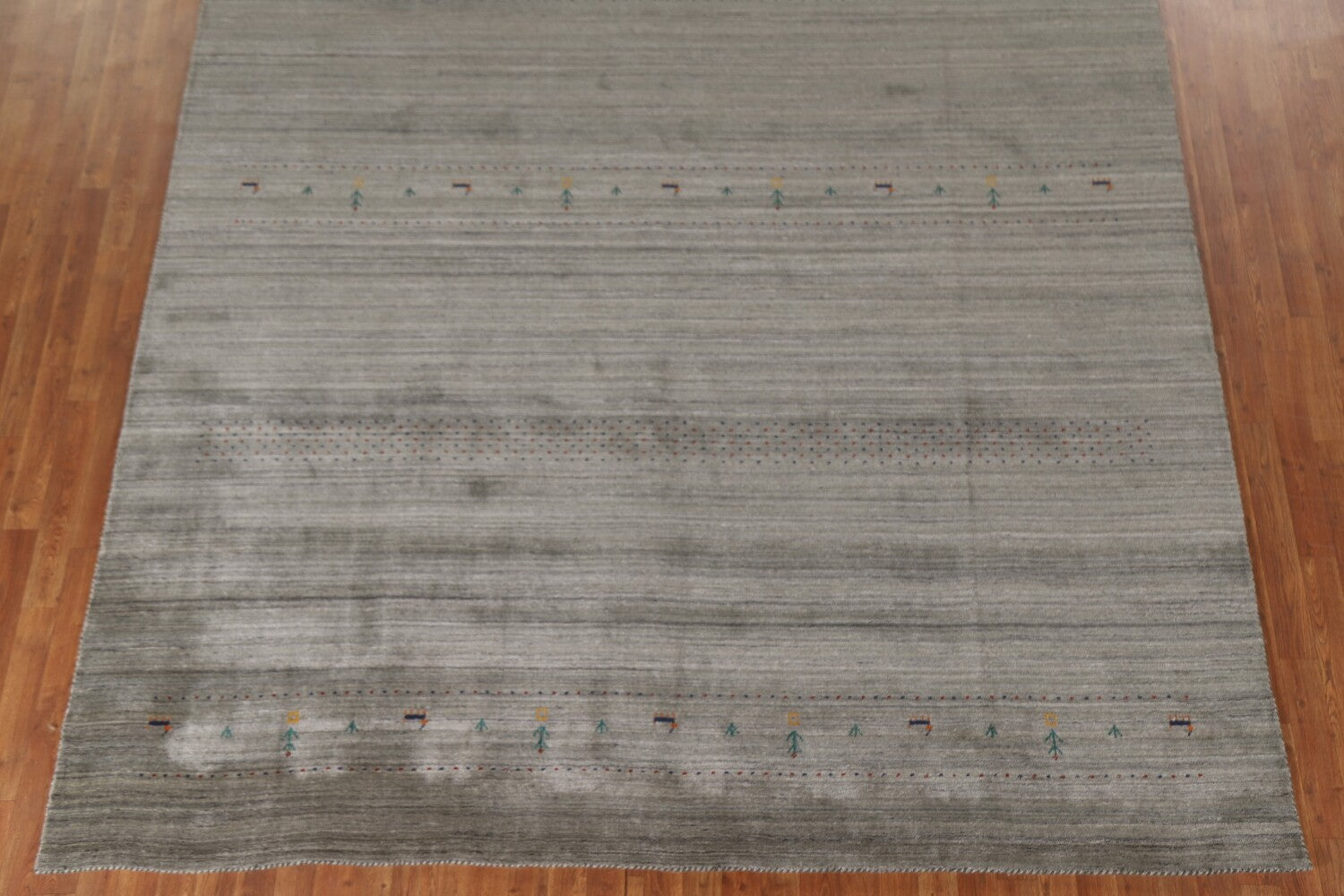 A Beautiful Genuine India Gabbeh rug is Hand Knotted by skillful weavers in India with 100% Wool Material. This rug is in New, First Quality condition. dimensions are 11' 7'' X 8' 10'' in foot and 353 X 269 in centimeter. the primary color is Greys & Charcoal.