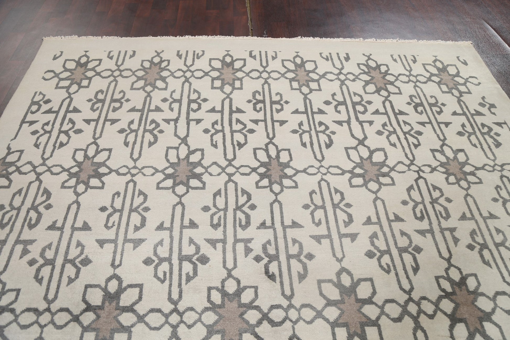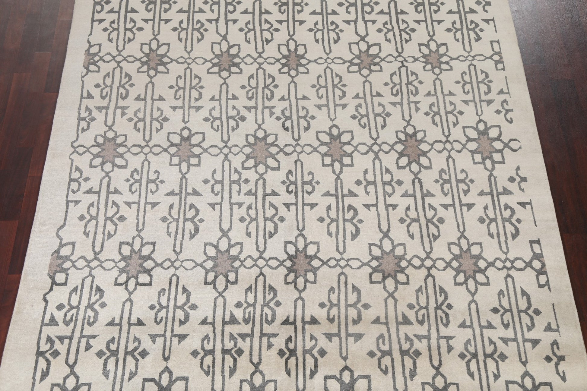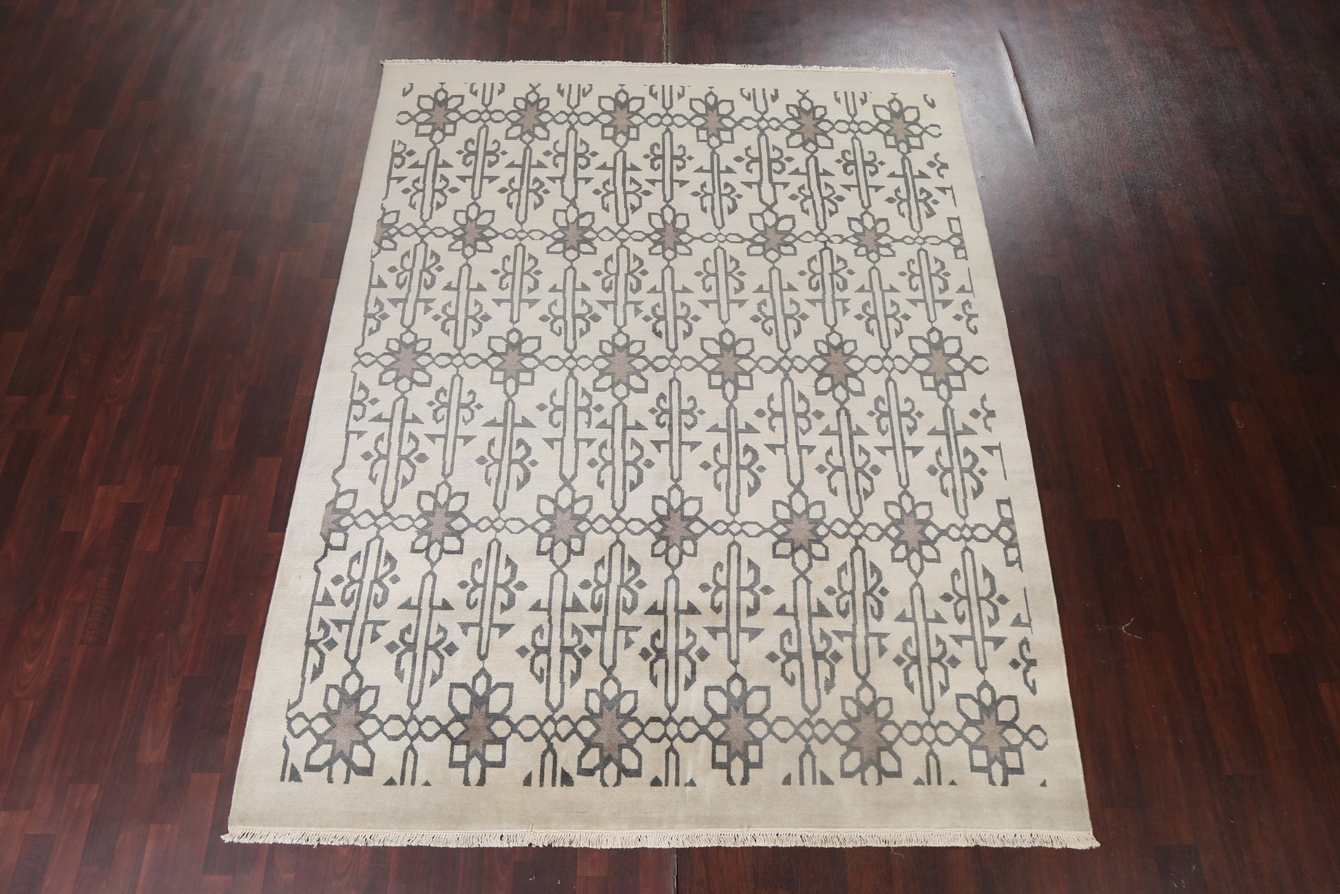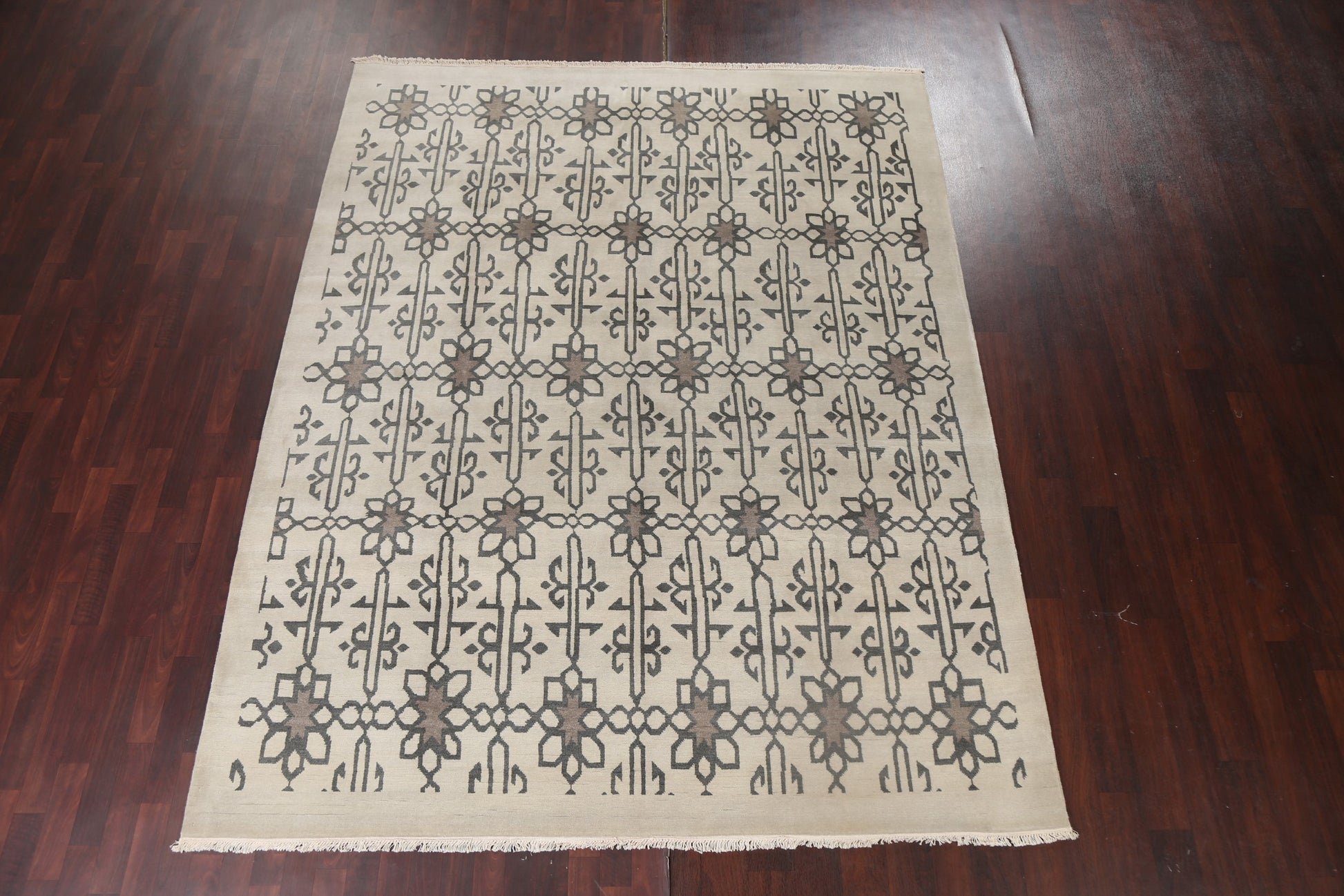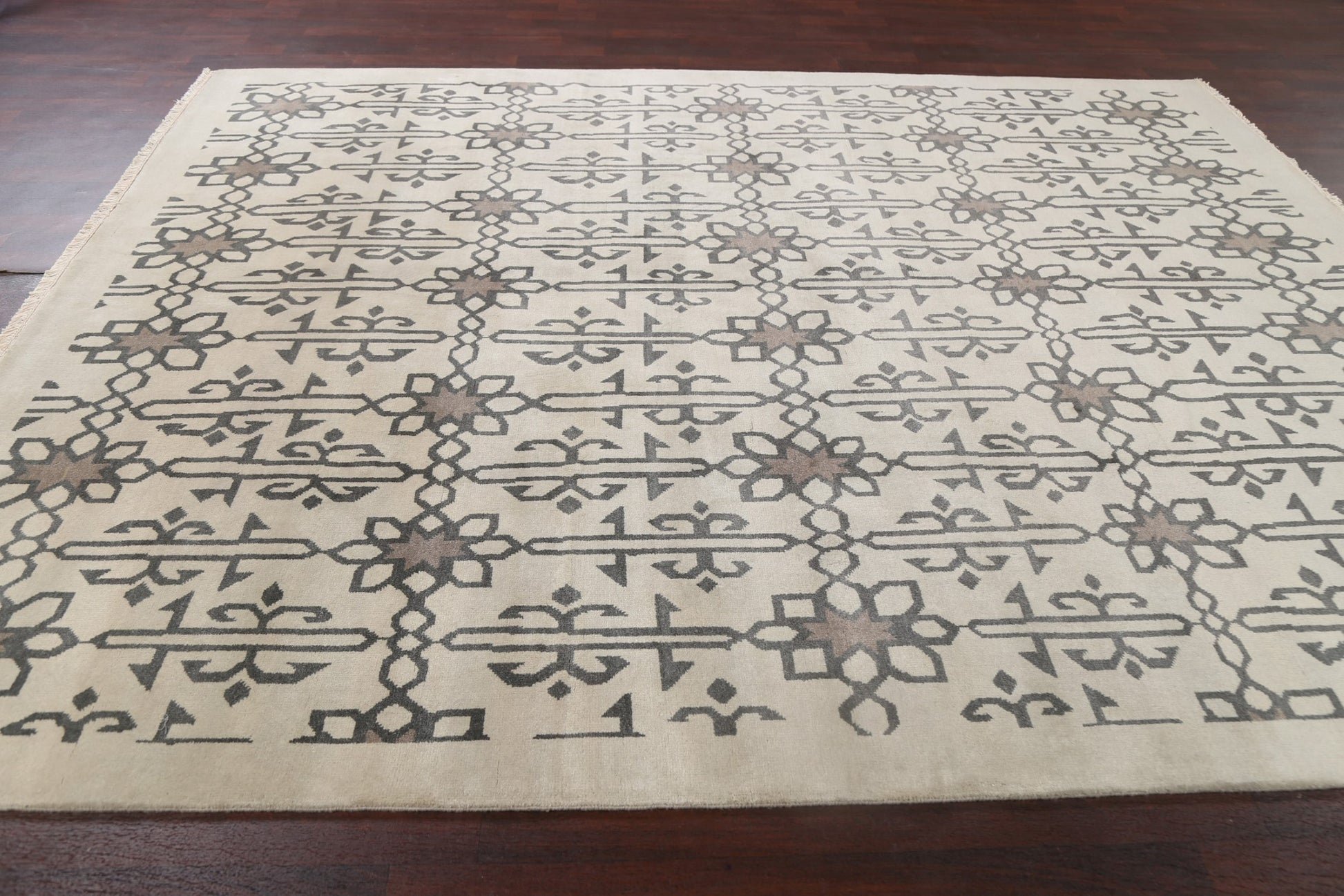 A Beautiful Genuine India Modern rug is Hand Knotted by skillful weavers in India with 100% Wool Material. This rug is in New, First Quality condition. dimensions are 9' 10'' X 7' 11'' in foot and 300 X 241 in centimeter. the primary color is Beige & Ivories.