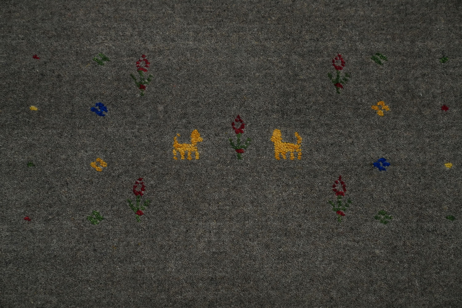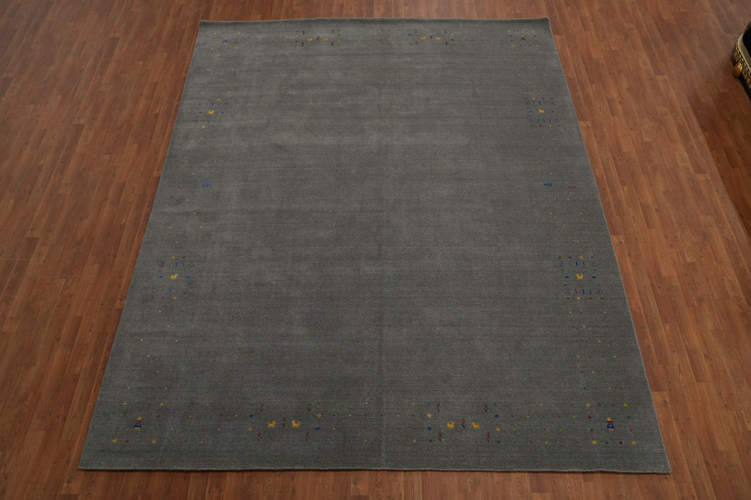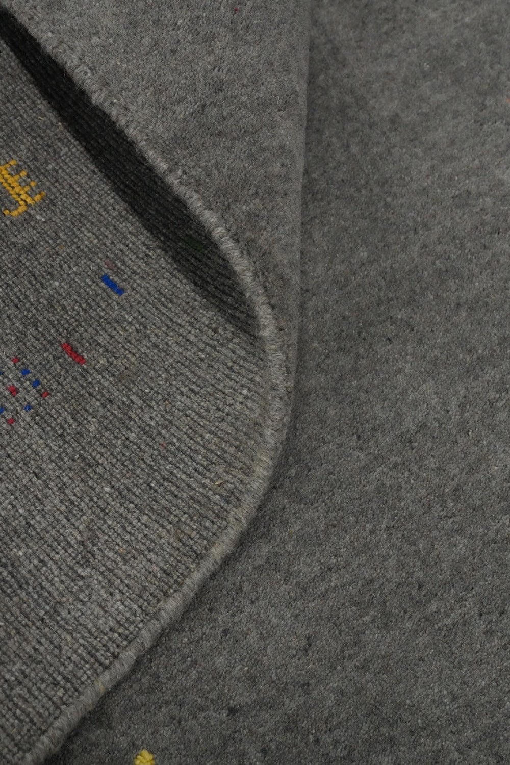 A Beautiful Genuine India Gabbeh rug is Hand Knotted by skillful weavers in India with 100% Wool Material. This rug is in New, First Quality condition. dimensions are 11' 9'' X 9' 2'' in foot and 358 X 279 in centimeter. the primary color is Greys & Charcoal.
