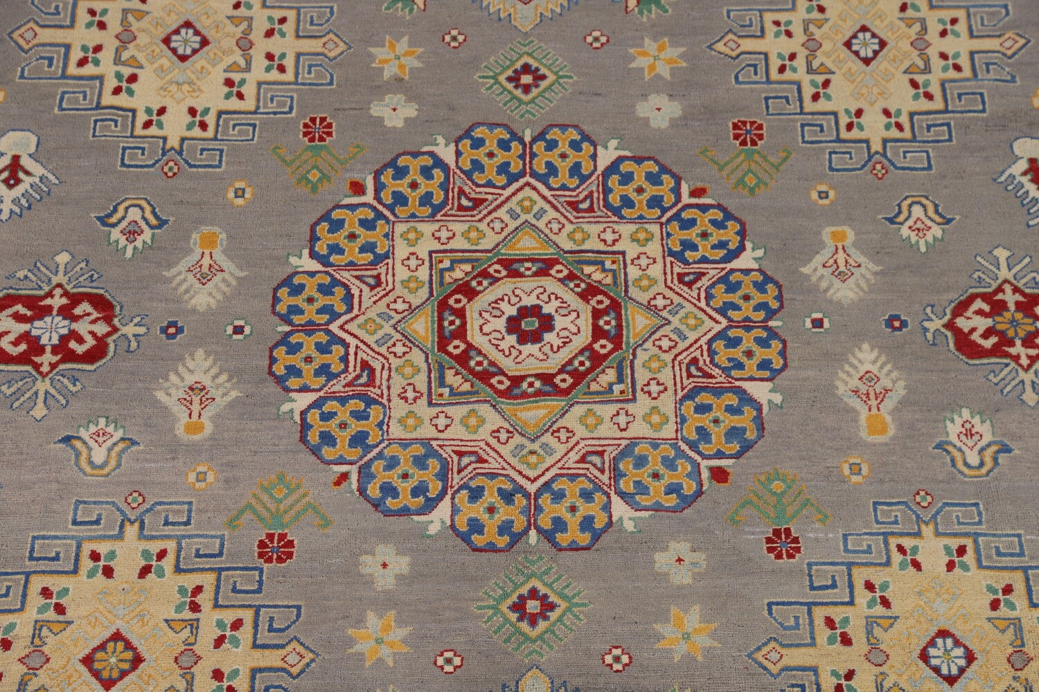 A Beautiful Genuine Pakistan Kazak rug is Hand Knotted by skillful weavers in Pakistan with 100% Wool Material. This rug is in New, First Quality condition. dimensions are 12' 4'' X 8' 1'' in foot and 376 X 246 in centimeter. the primary color is Greys & Charcoal.