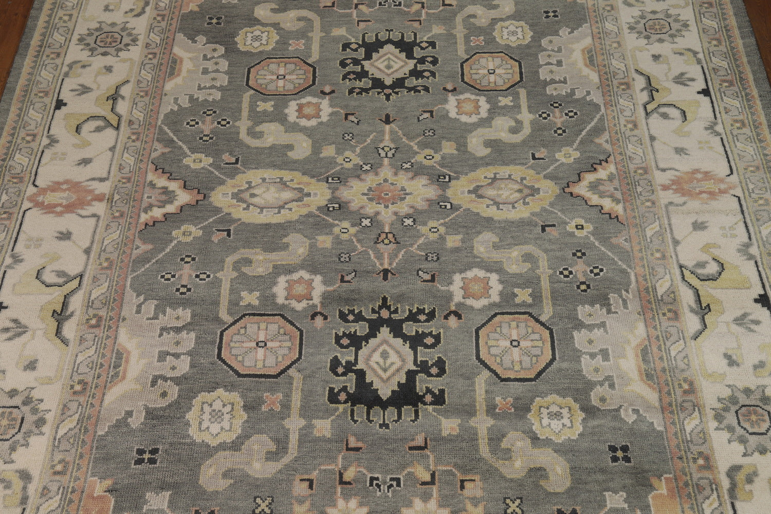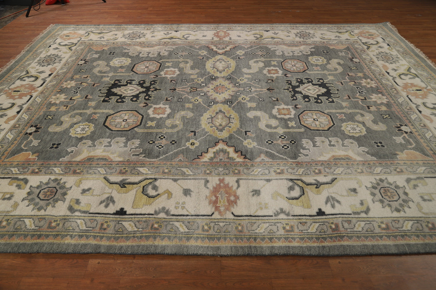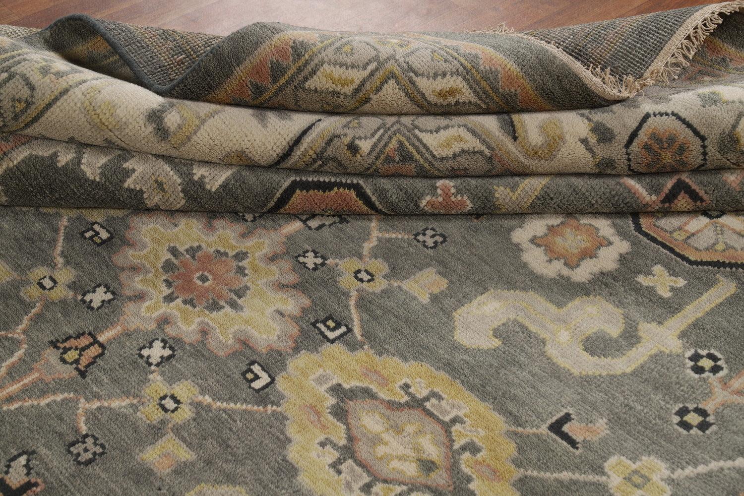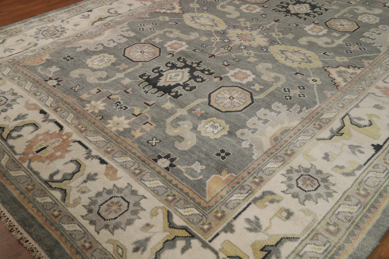 A Beautiful Genuine India Oushak rug is Hand Knotted by skillful weavers in India with 100% Wool Material. This rug is in New, First Quality condition. dimensions are 11' 10'' X 8' 4'' in foot and 361 X 254 in centimeter. the primary color is Greys & Charcoal.