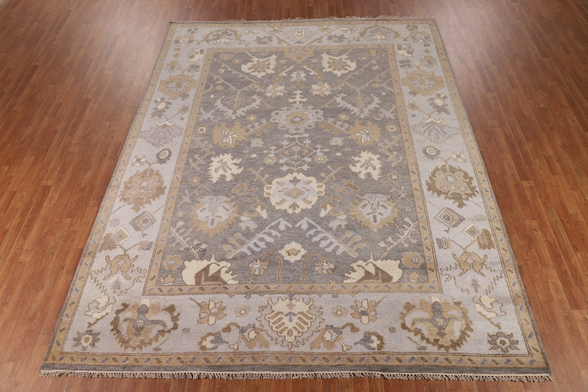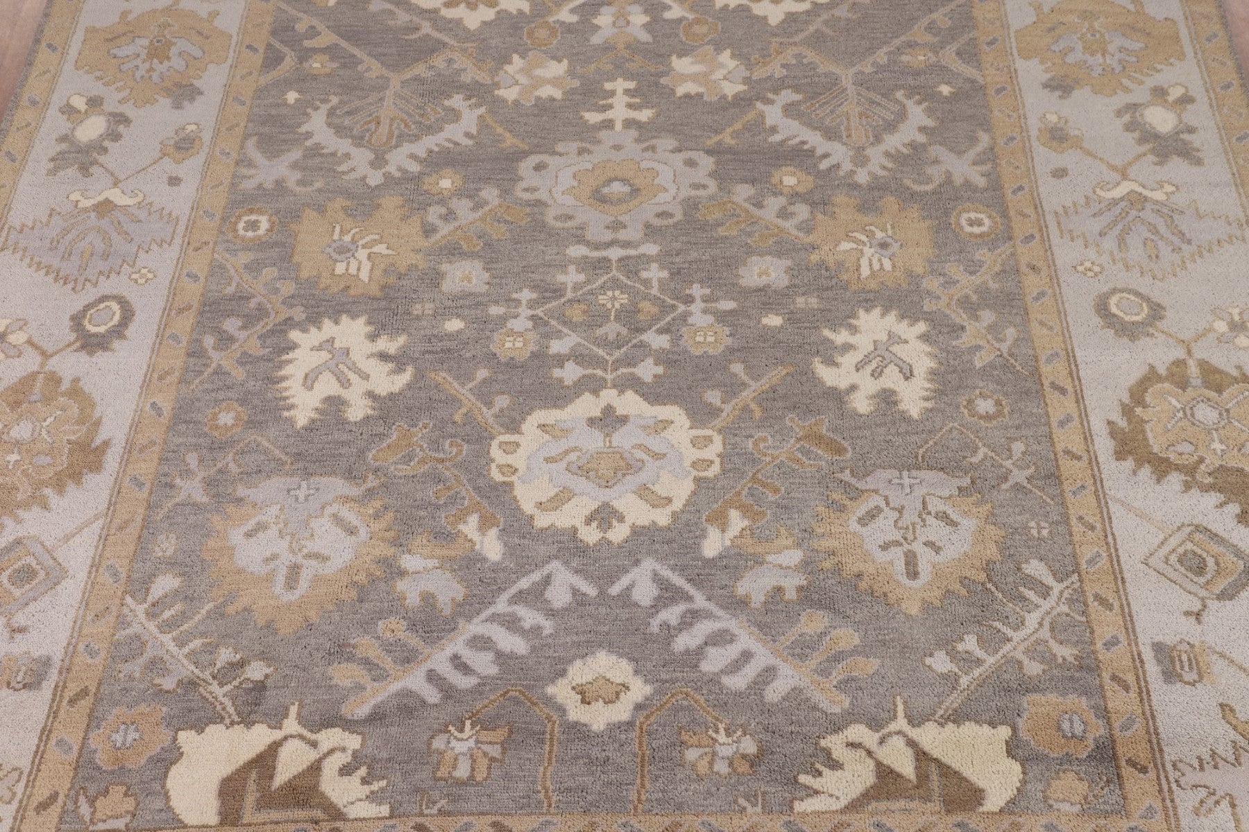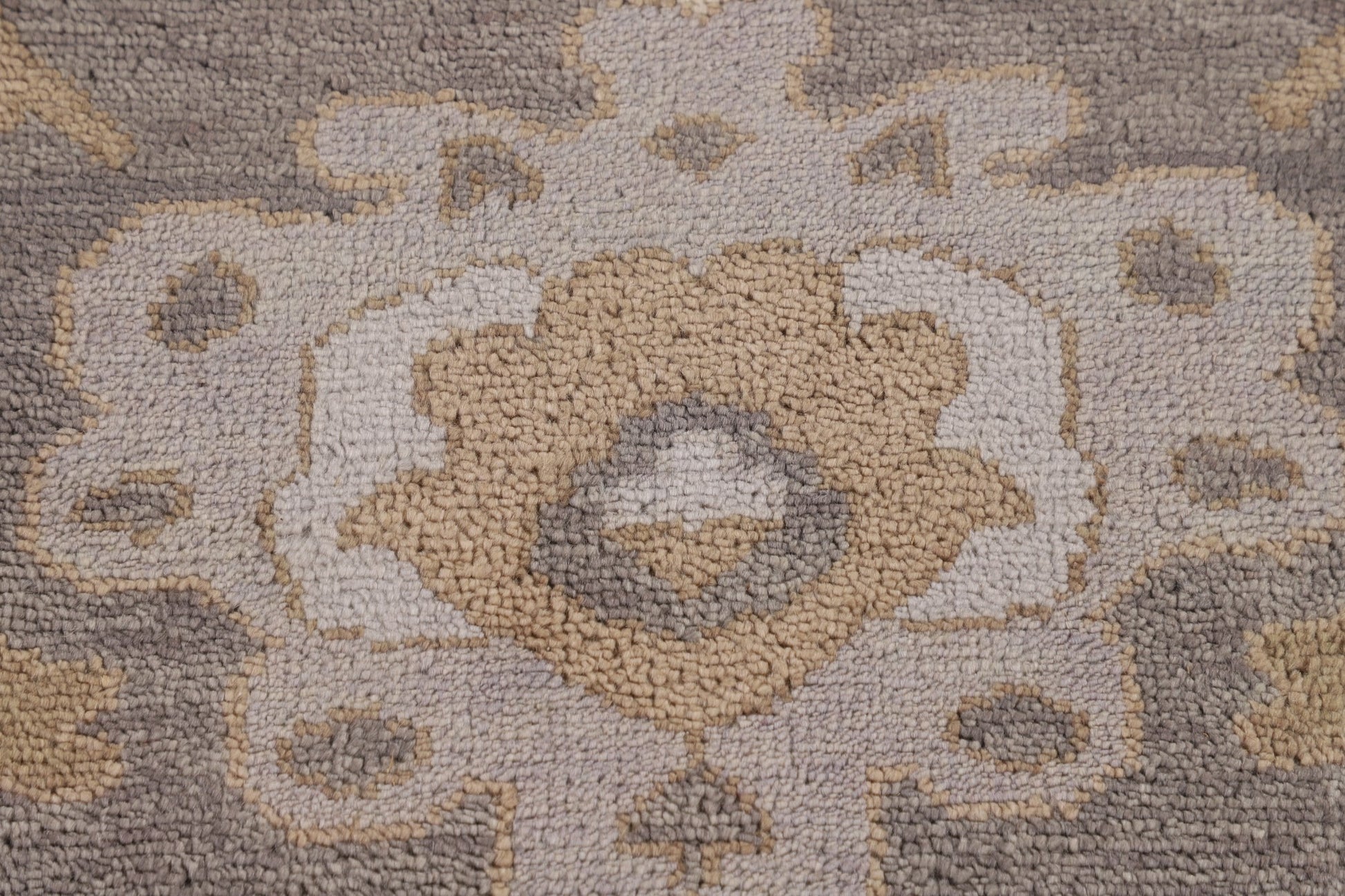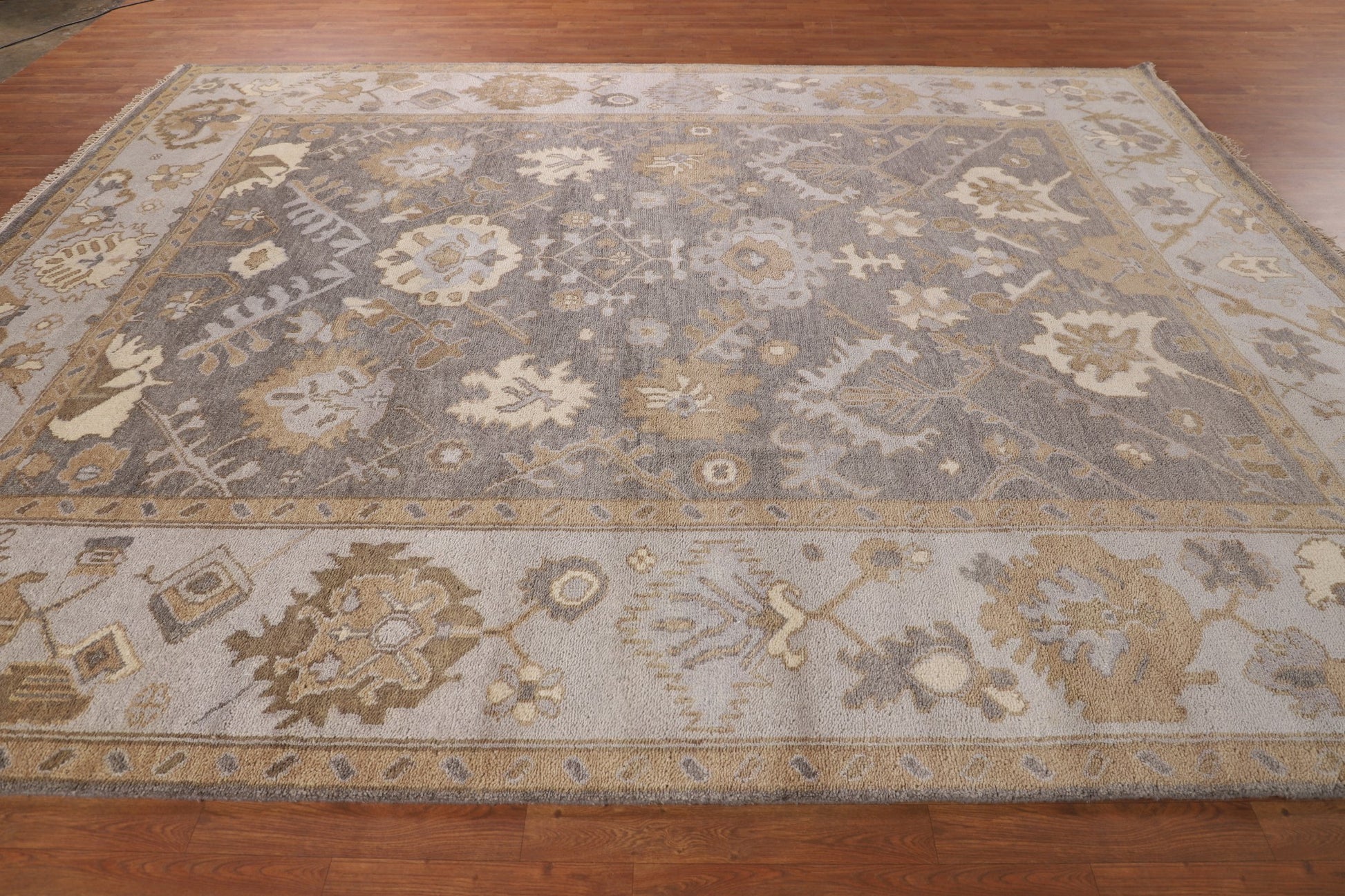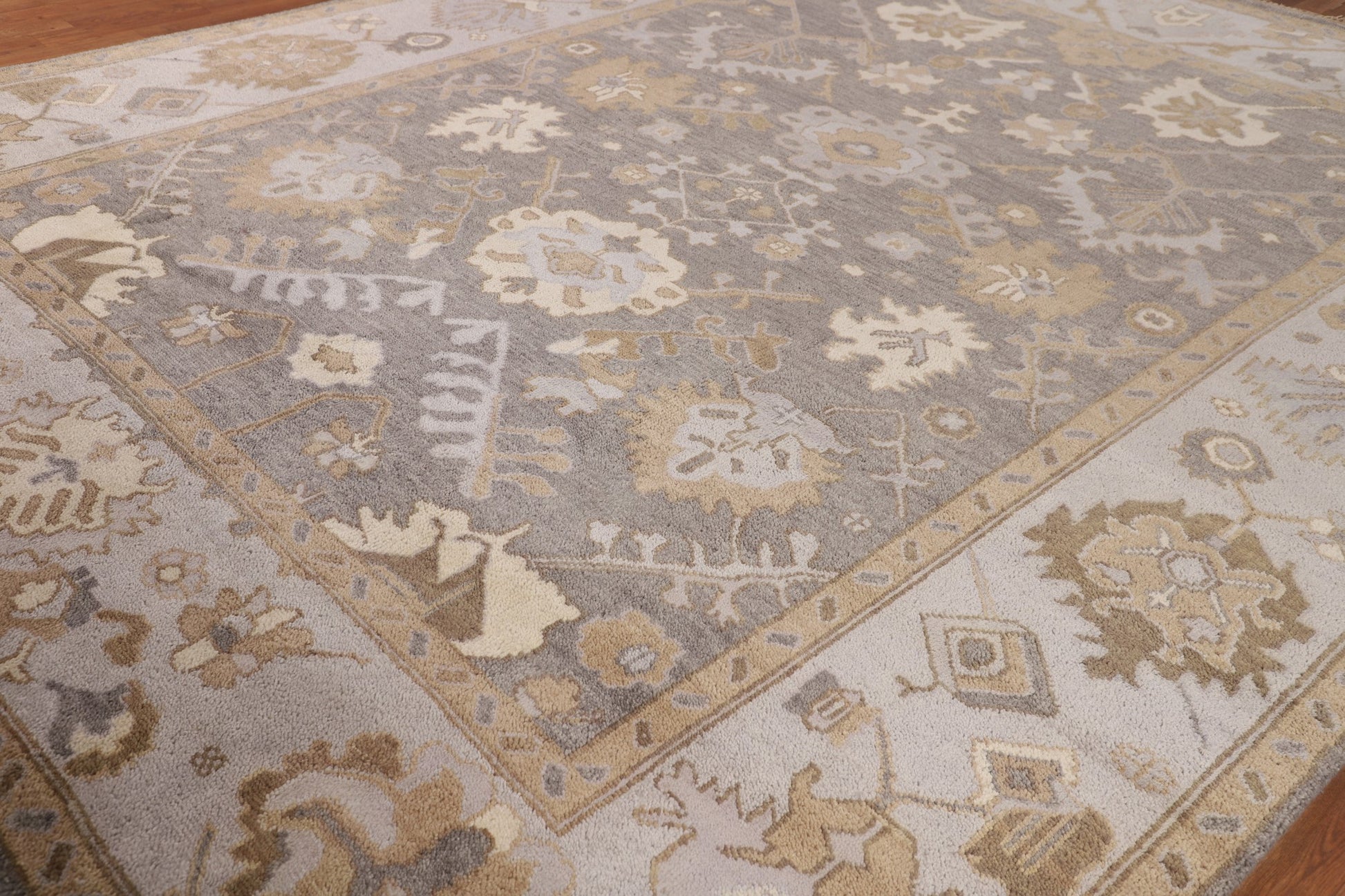 A Beautiful Genuine India Oushak rug is Hand Knotted by skillful weavers in India with 100% Wool Material. This rug is in New, First Quality condition. dimensions are 11' 7'' X 9' 3'' in foot and 353 X 282 in centimeter. the primary color is Greys & Charcoal.