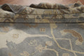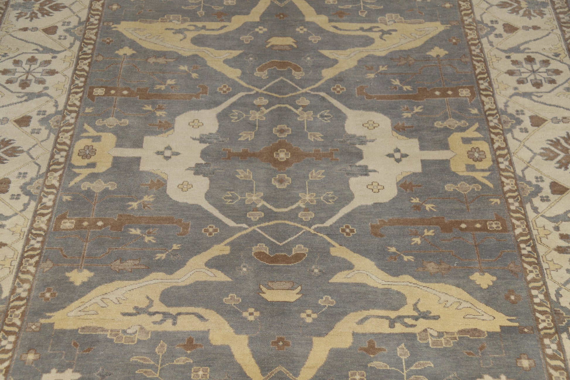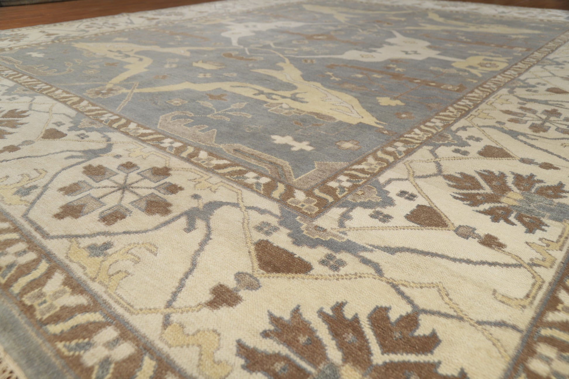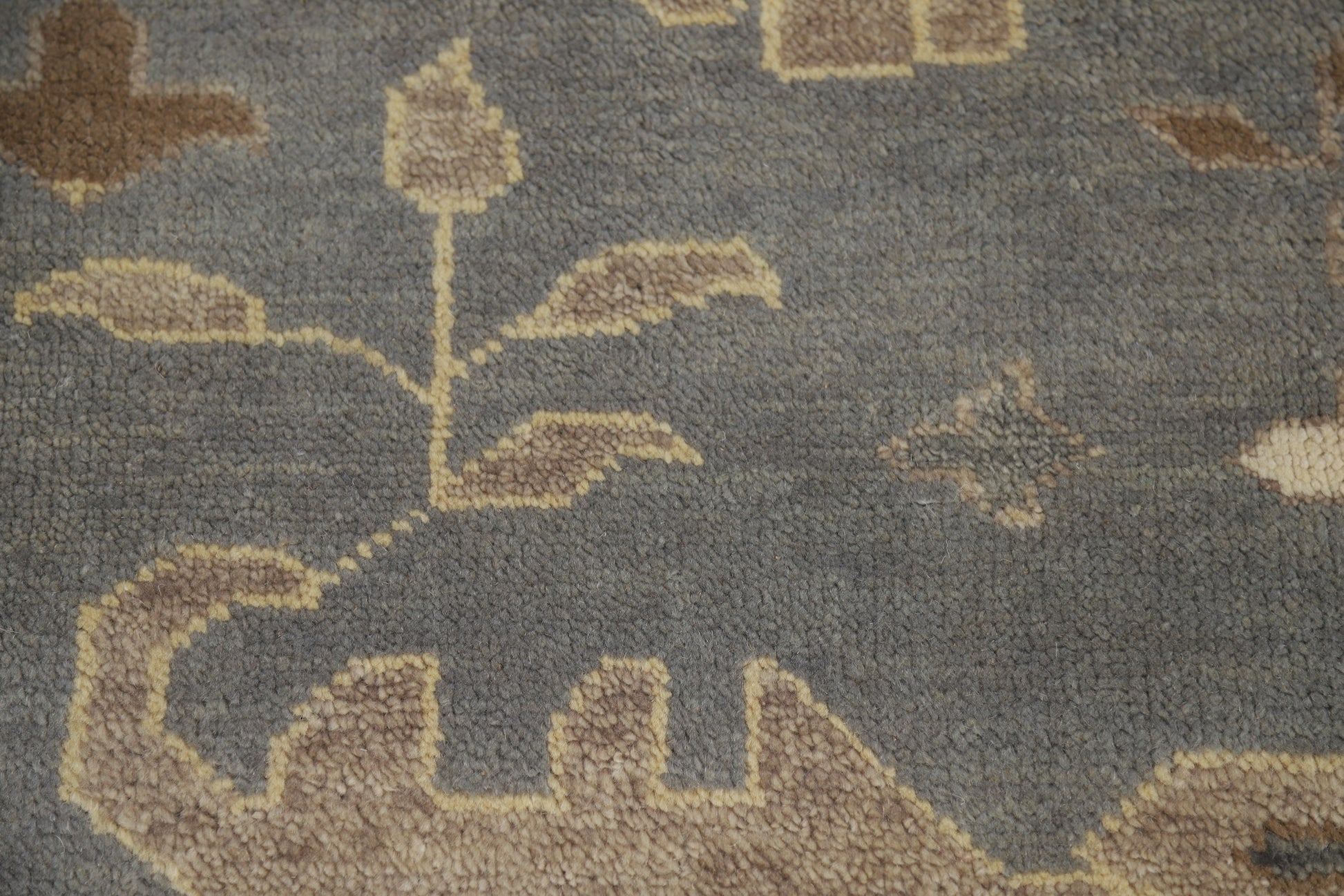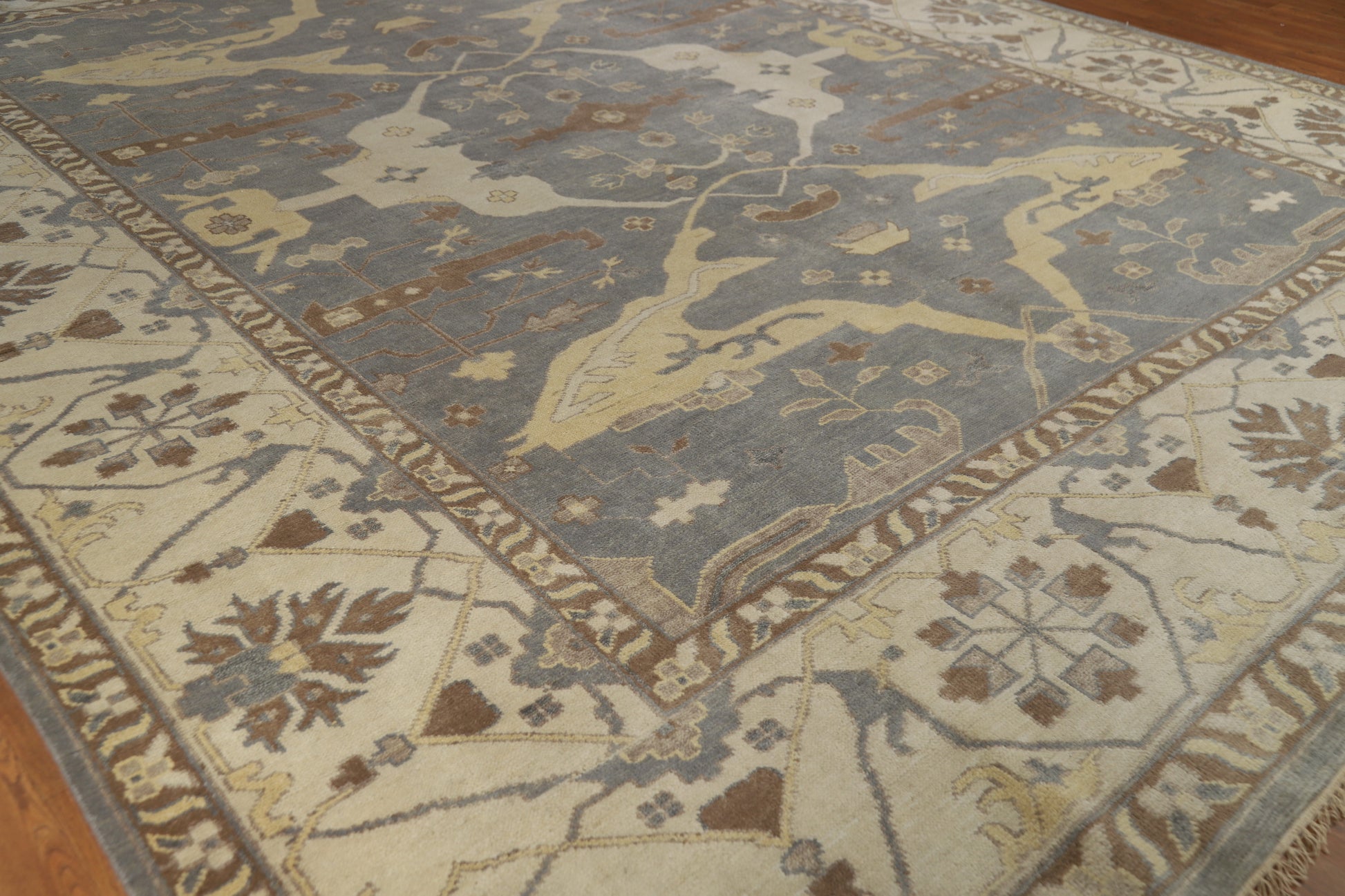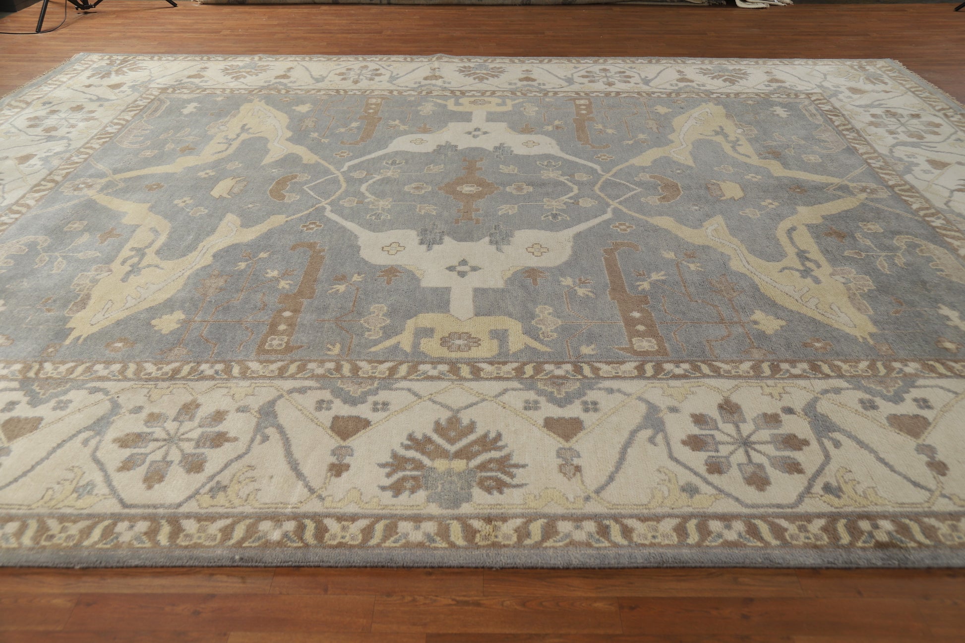 A Beautiful Genuine India Oushak rug is Hand Knotted by skillful weavers in India with 100% Wool Material. This rug is in New, First Quality condition. dimensions are 14' 9'' X 11' 10'' in foot and 450 X 361 in centimeter. the primary color is Greys & Charcoal.