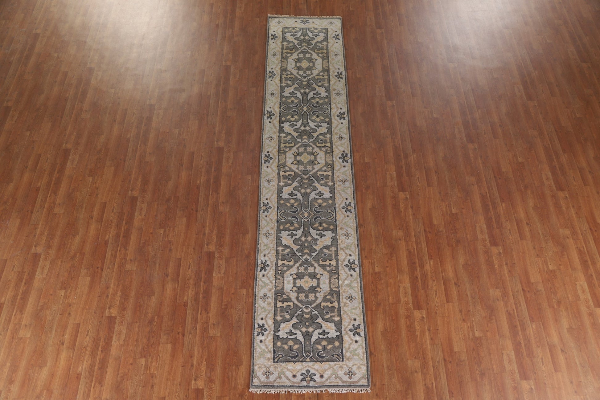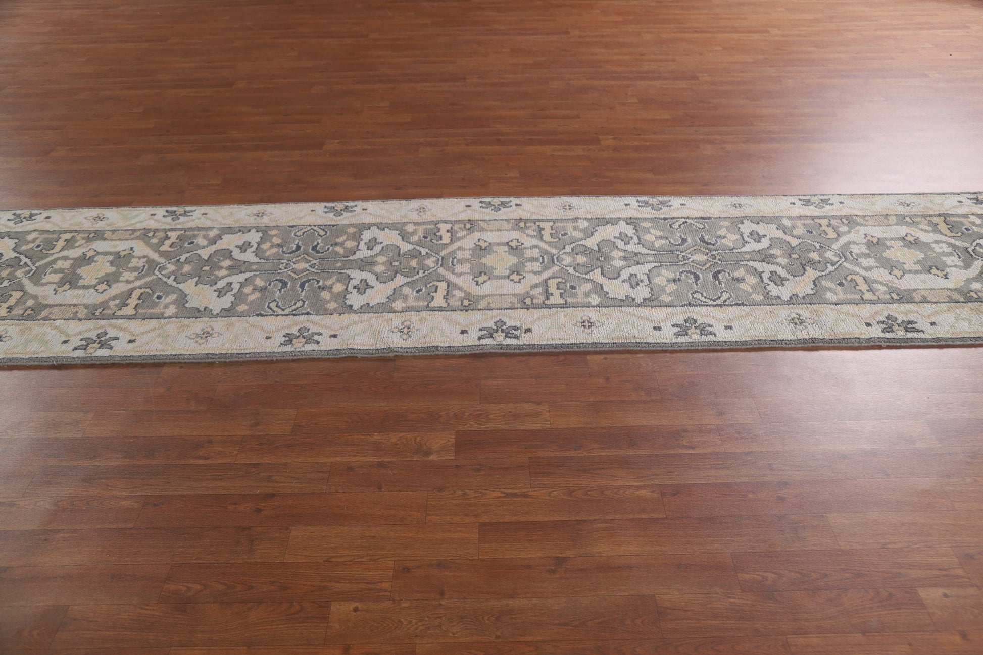 A Beautiful Genuine India Oushak rug is Hand Knotted by skillful weavers in India with 100% Wool Material. This rug is in New, First Quality condition. dimensions are 12' 2'' X 2' 7'' in foot and 371 X 79 in centimeter. the primary color is Greys & Charcoal.