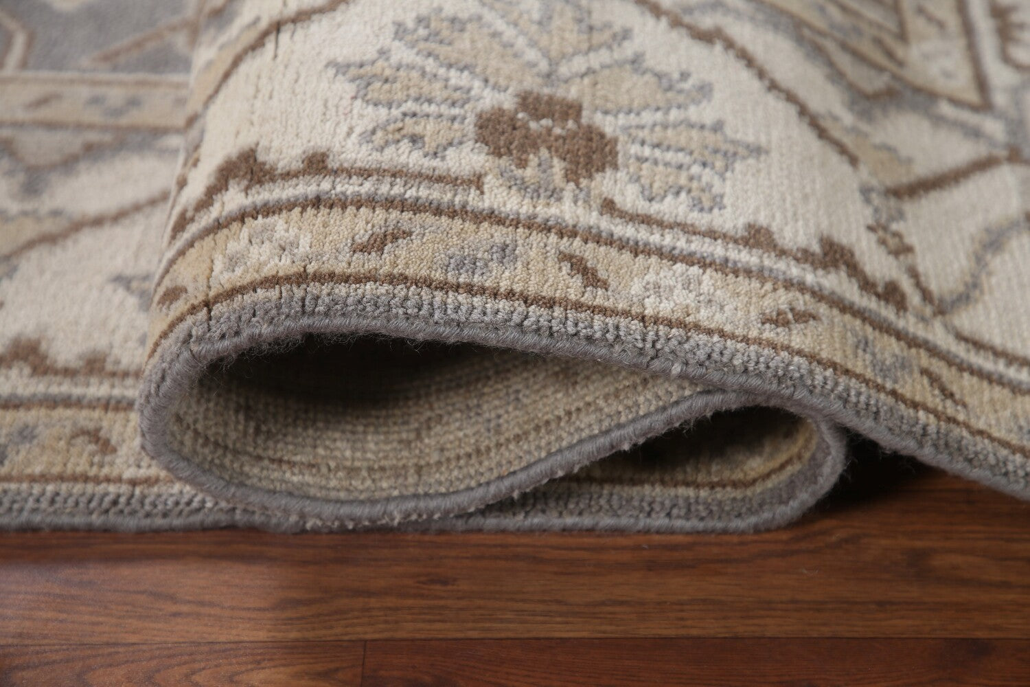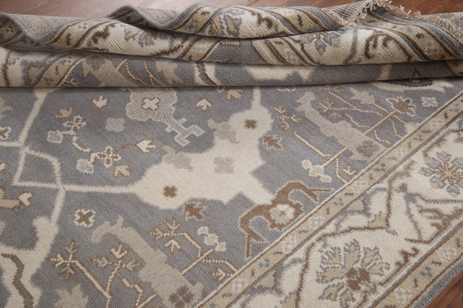 A Beautiful Genuine India Oushak rug is Hand Knotted by skillful weavers in India with 100% Wool Material. This rug is in New, First Quality condition. dimensions are 8' 9'' X 6' 1'' in foot and 267 X 185 in centimeter. the primary color is Greys & Charcoal.