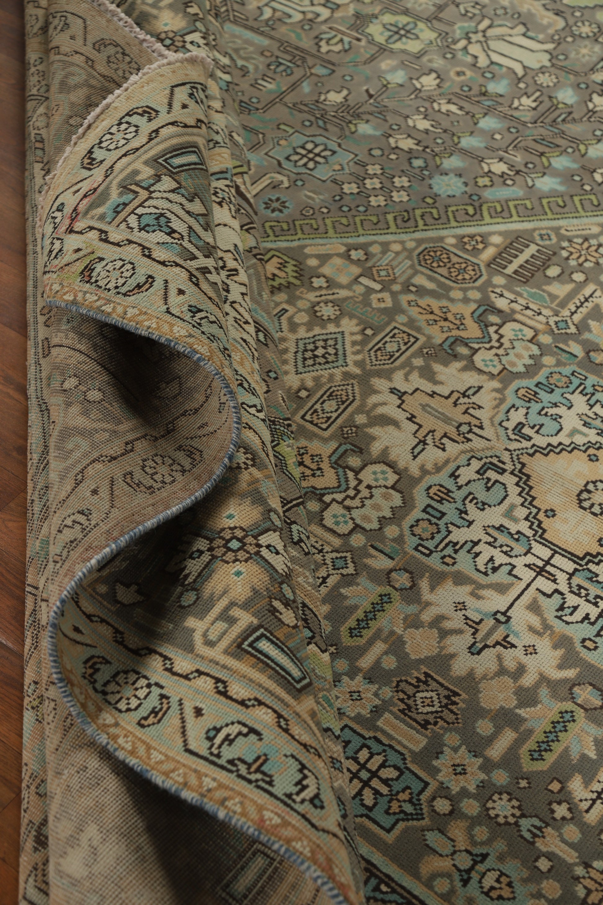 A Beautiful Genuine Persia ( Persia ) Tabriz rug is Hand Knotted by skillful weavers in Persia ( Persia ) with 100% Wool Material. This rug is in Very Good (Evenly Low Pile) condition. dimensions are 12' 7'' X 9' 8'' in foot and 384 X 295 in centimeter. the primary color is Greys & Charcoal.