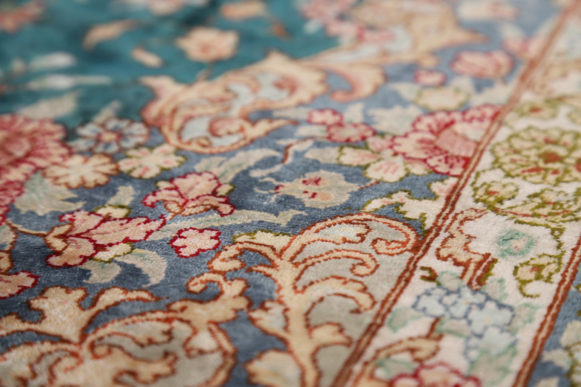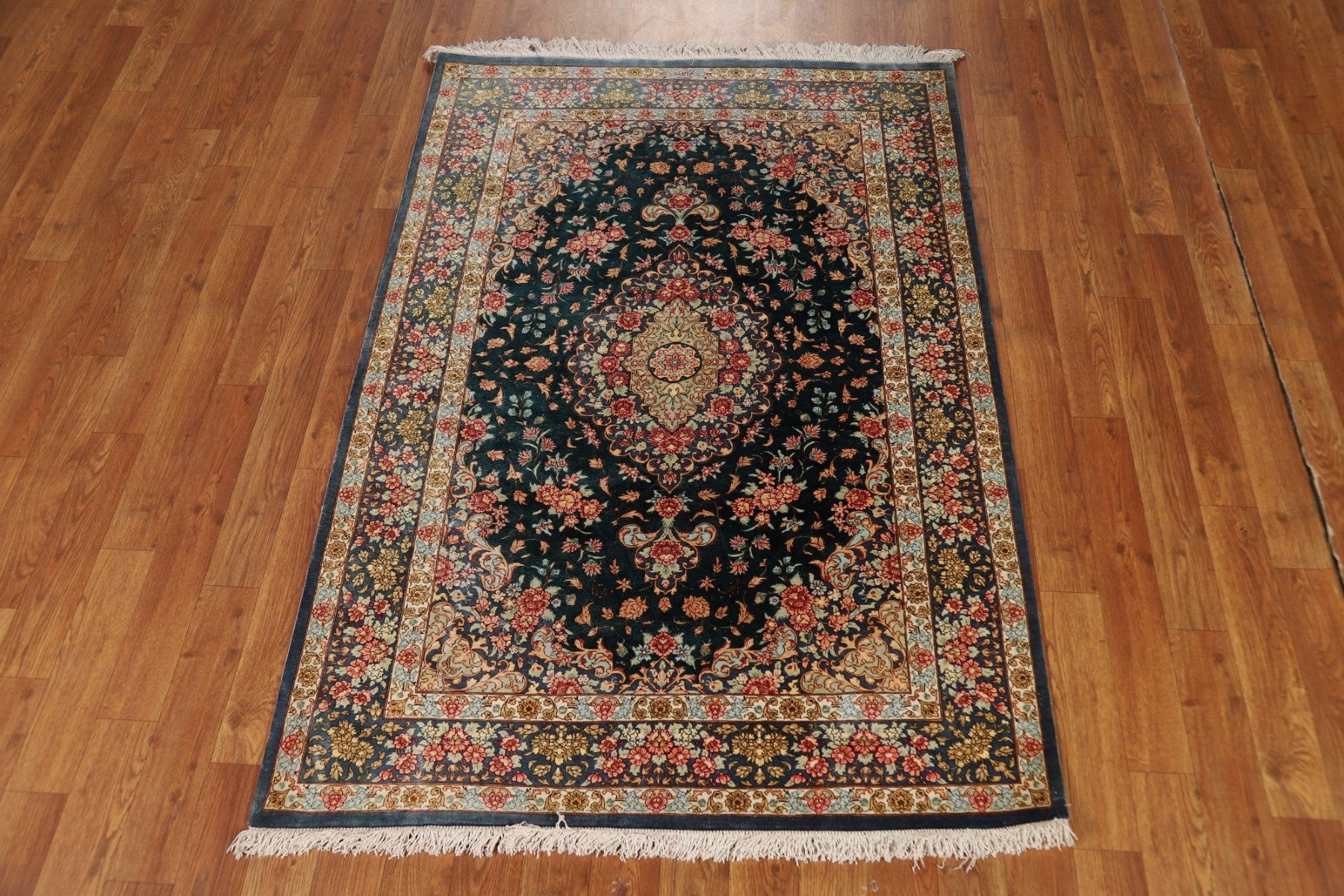 A Beautiful Genuine Persia ( Persia ) Qum rug is Hand Knotted by skillful weavers in Persia ( Persia ) with Silk Material. This rug is in New, First Quality condition. dimensions are 4' 10'' X 3' 5'' in foot and 147 X 104 in centimeter. the primary color is Green.