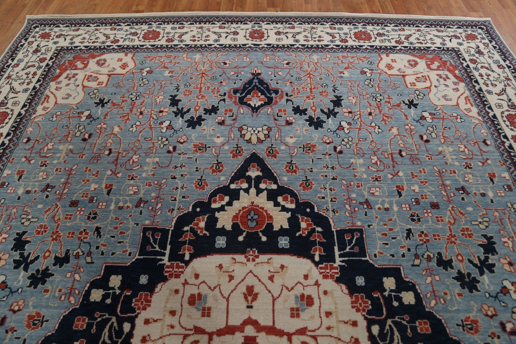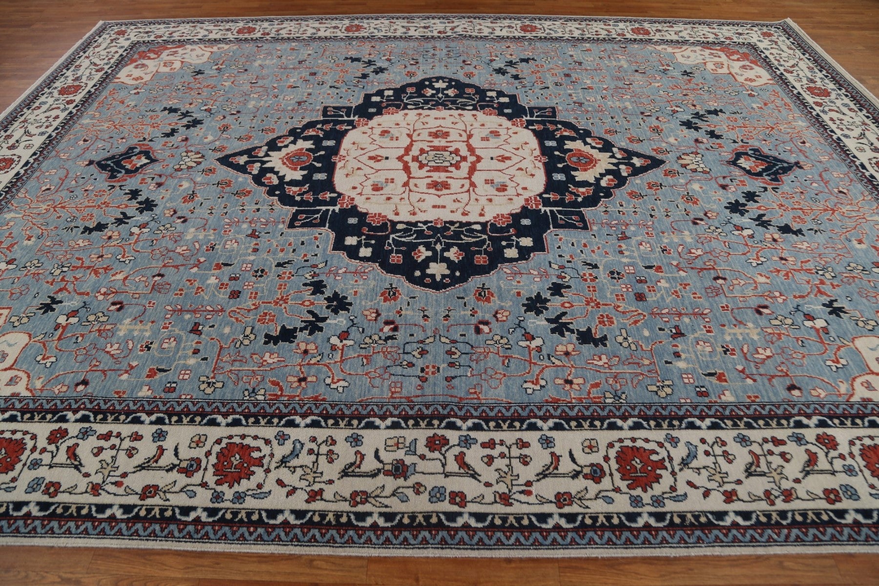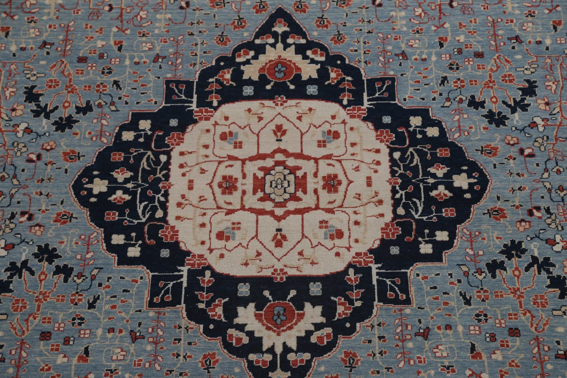 A Beautiful Genuine Turkey Kashan (Mohtasham) rug is Hand Knotted by skillful weavers in Turkey with 100% Wool Material. This rug is in New, First Quality condition. dimensions are 12' 9'' X 9' 10'' in foot and 389 X 300 in centimeter. the primary color is Navy Blue & Blues.