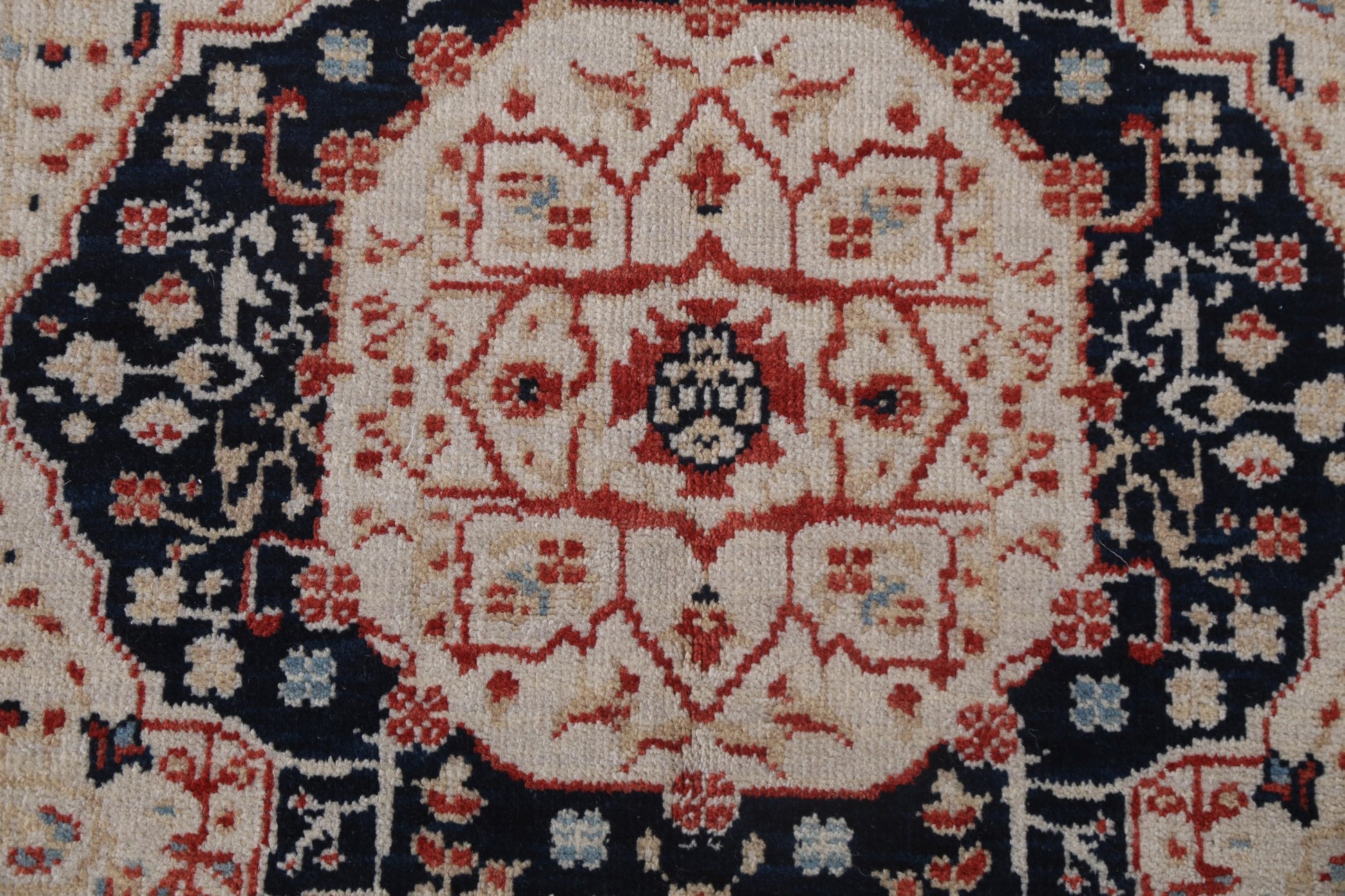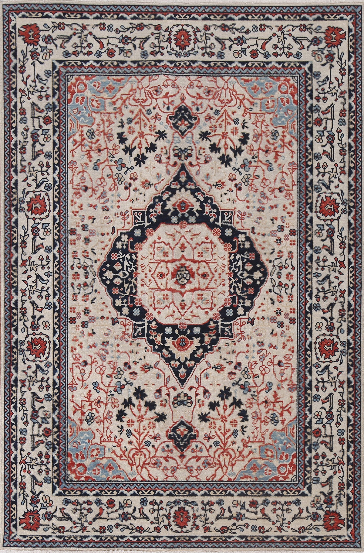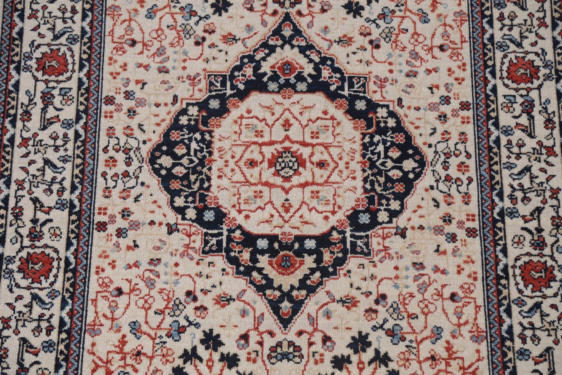 A Beautiful Genuine Turkey Kashan (Mohtasham) rug is Hand Knotted by skillful weavers in Turkey with 100% Wool Material. This rug is in New, First Quality condition. dimensions are 5' 10'' X 3' 11'' in foot and 178 X 119 in centimeter. the primary color is Beige & Ivories.