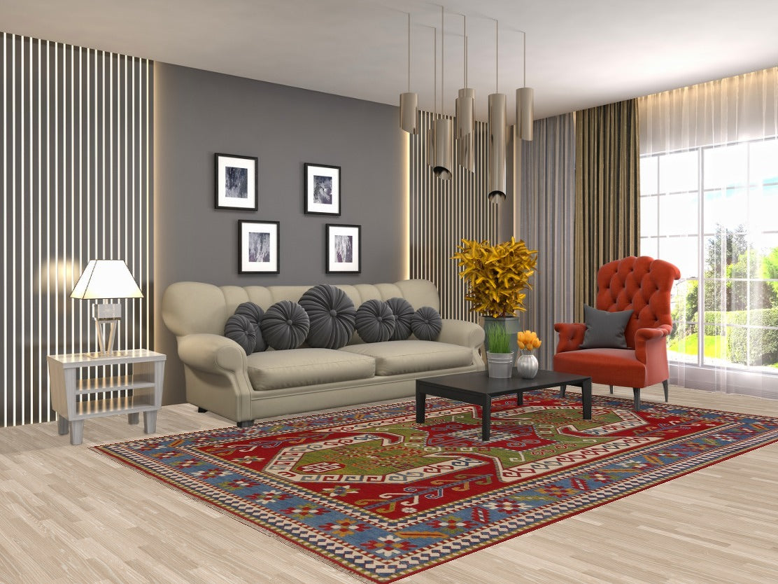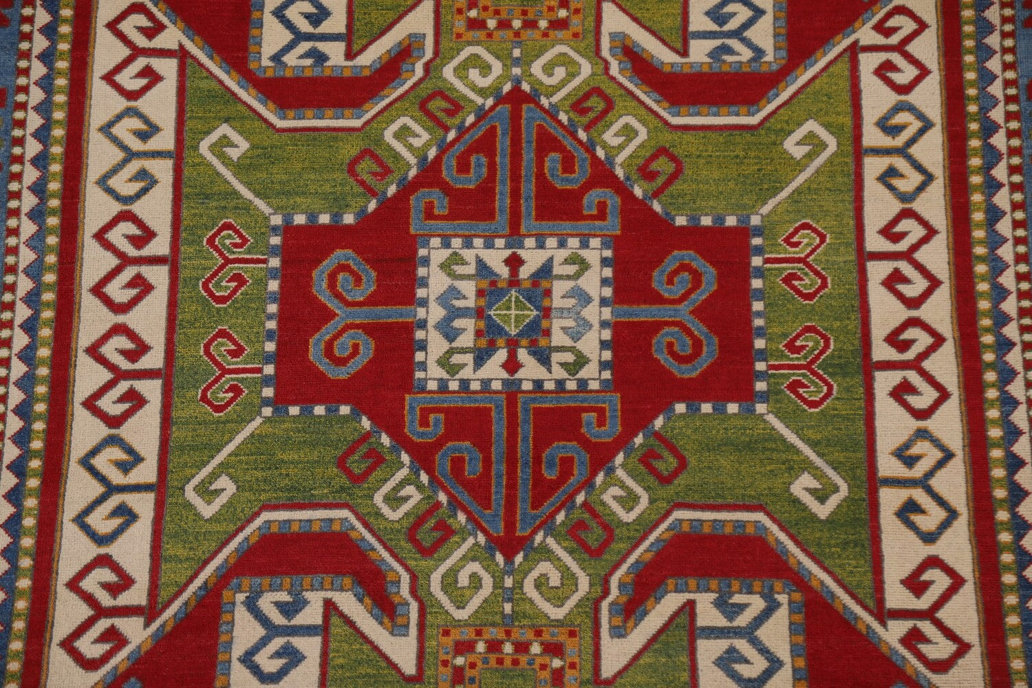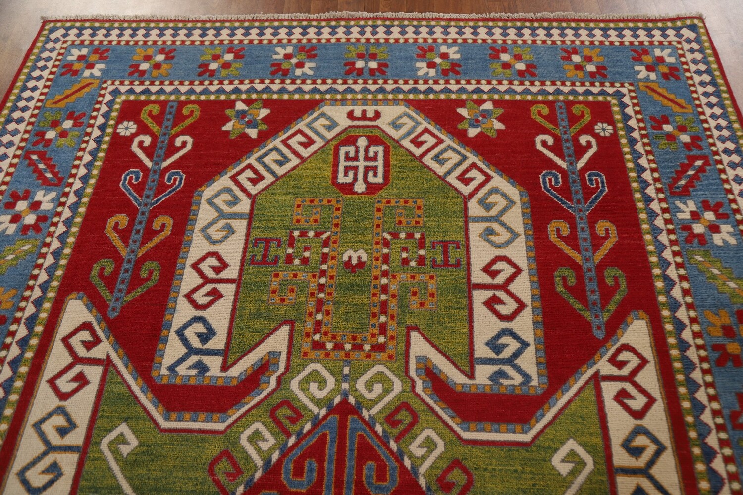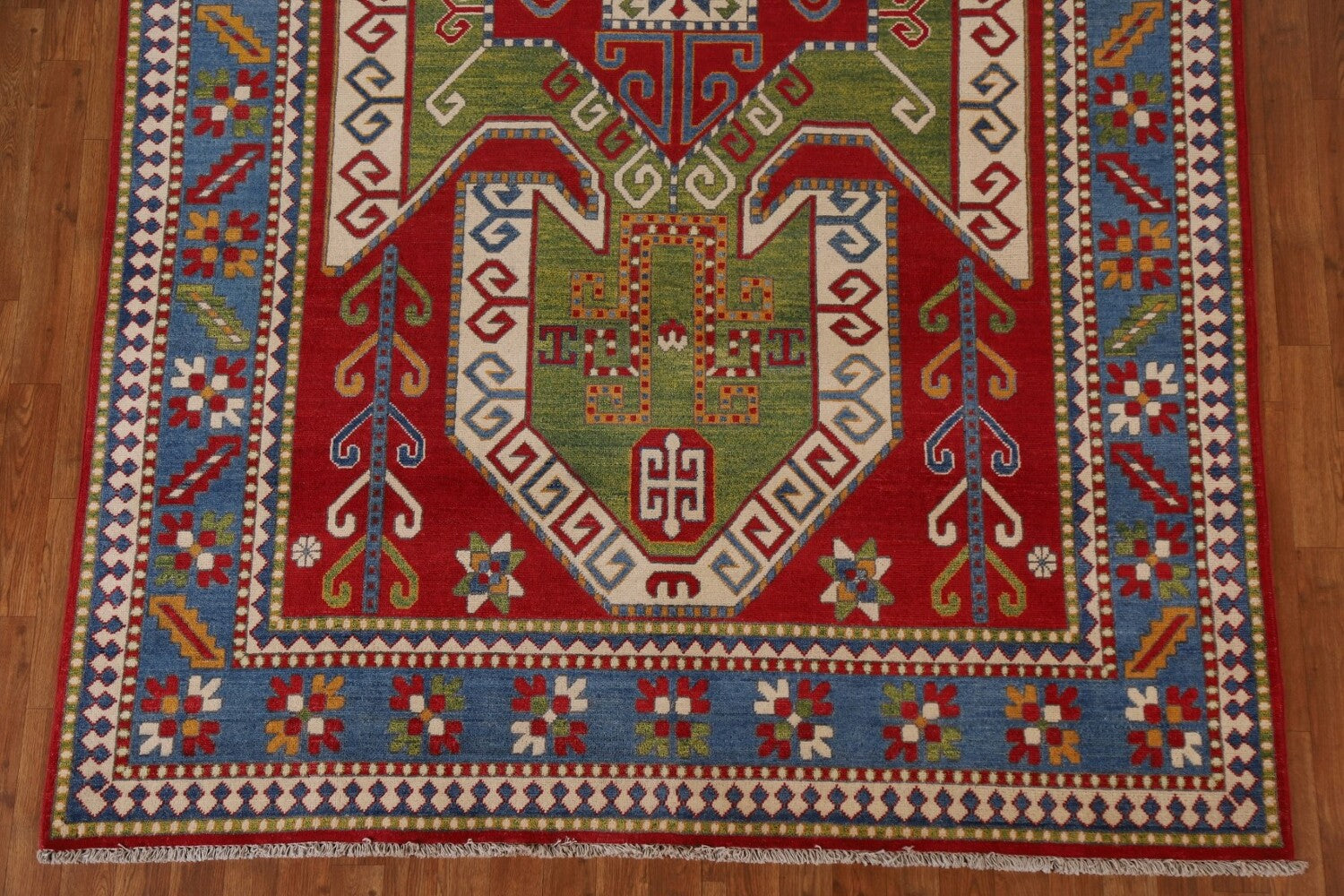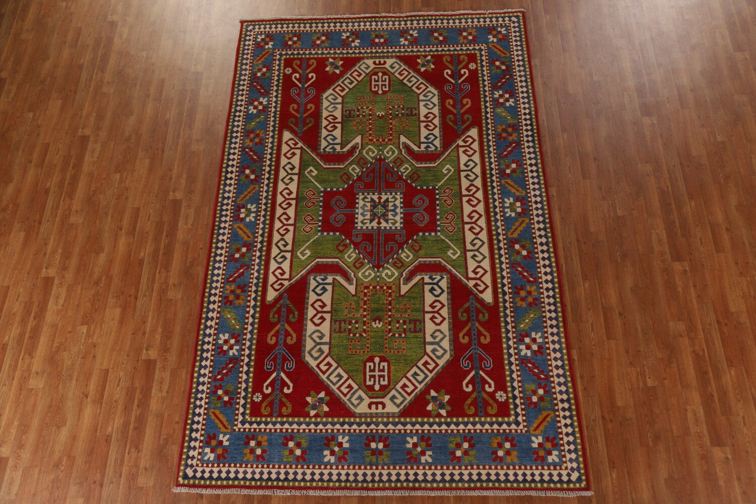 A Beautiful Genuine Pakistan Kazak rug is Hand Knotted by skillful weavers in Pakistan with 100% Wool Material. This rug is in New, First Quality condition. dimensions are 10' 2'' X 6' 6'' in foot and 310 X 198 in centimeter. the primary color is Green.