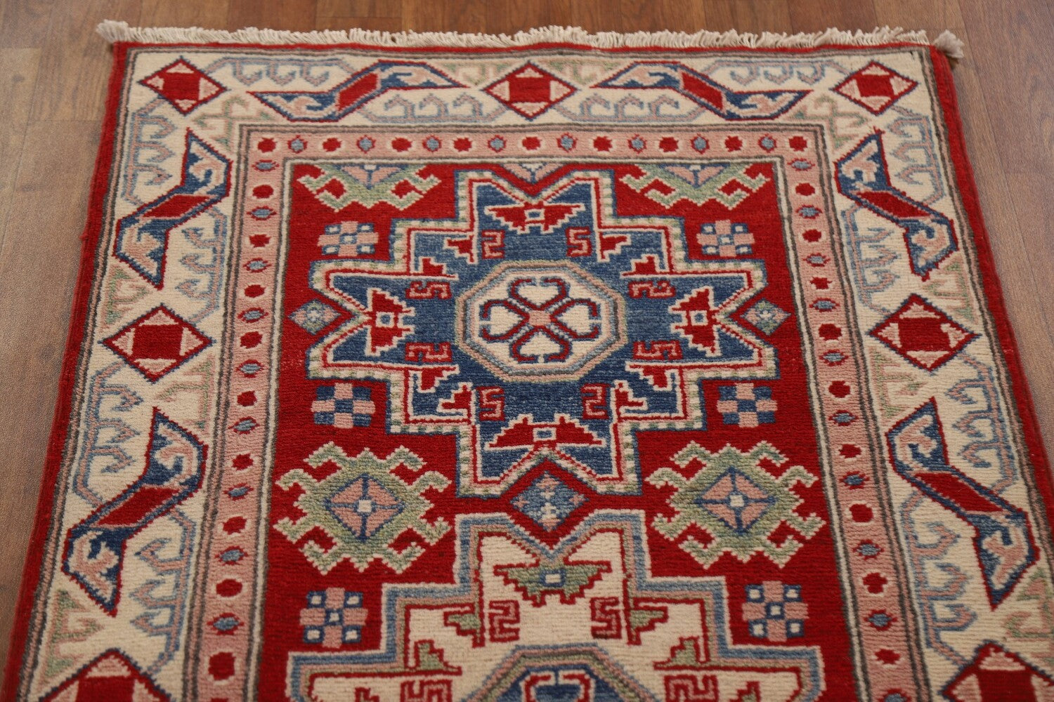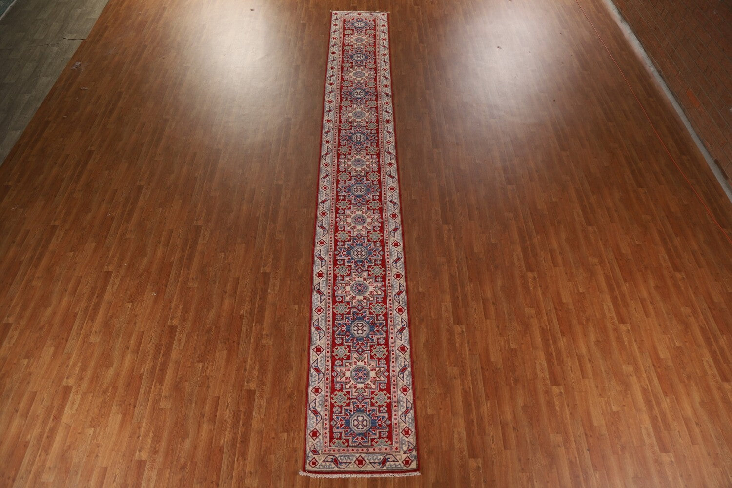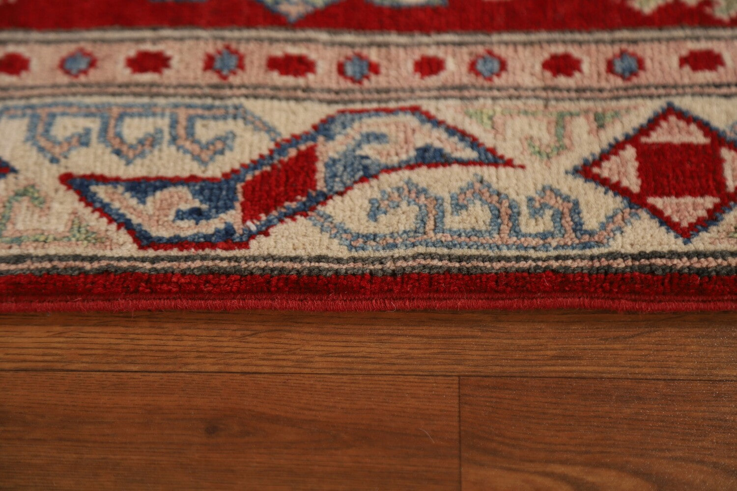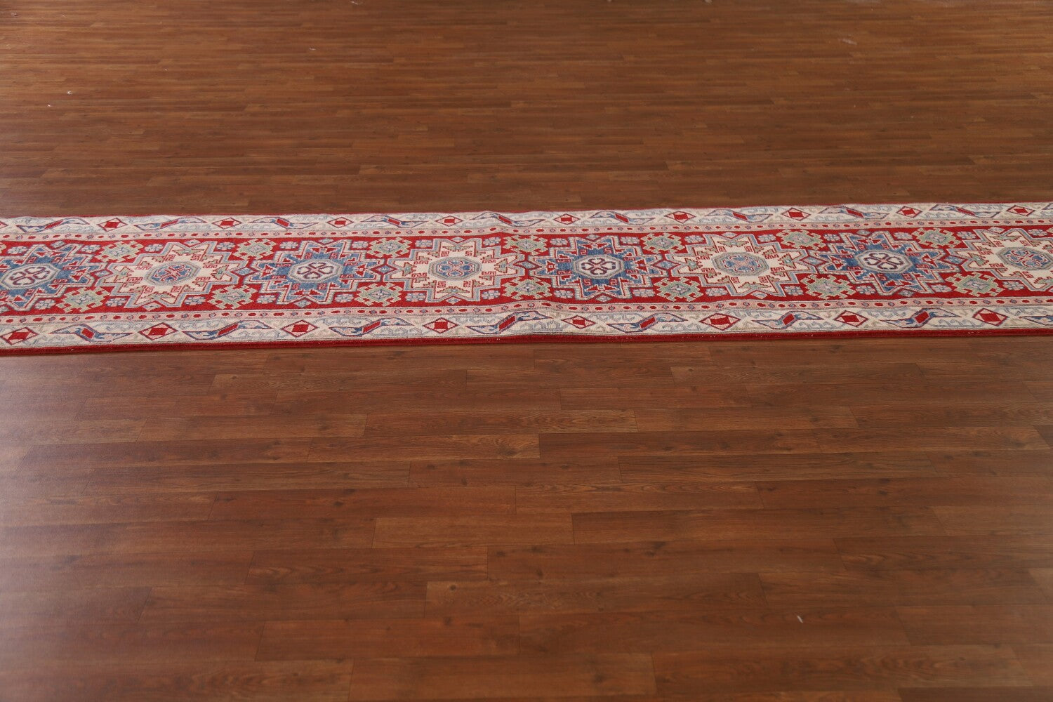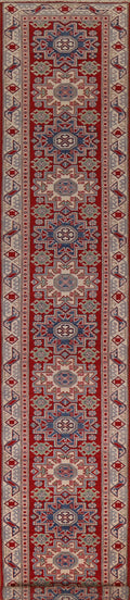 A Beautiful Genuine Pakistan Kazak rug is Hand Knotted by skillful weavers in Pakistan with 100% Wool Material. This rug is in New, First Quality condition. dimensions are 19' 3'' X 2' 6'' in foot and 587 X 76 in centimeter. the primary color is Red.