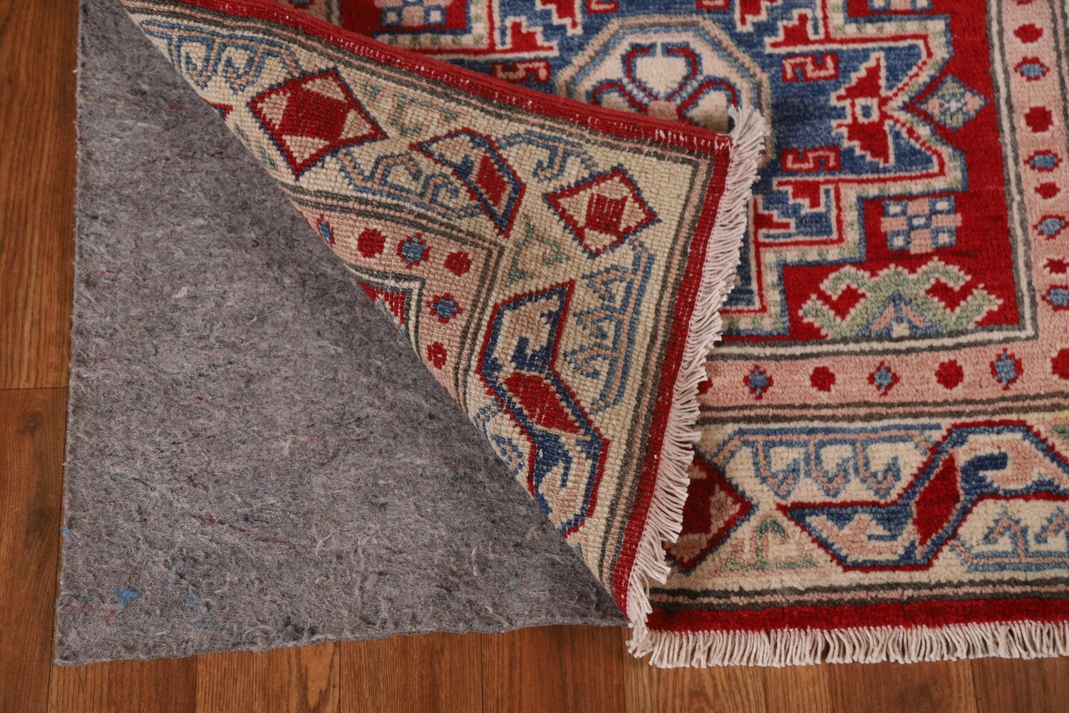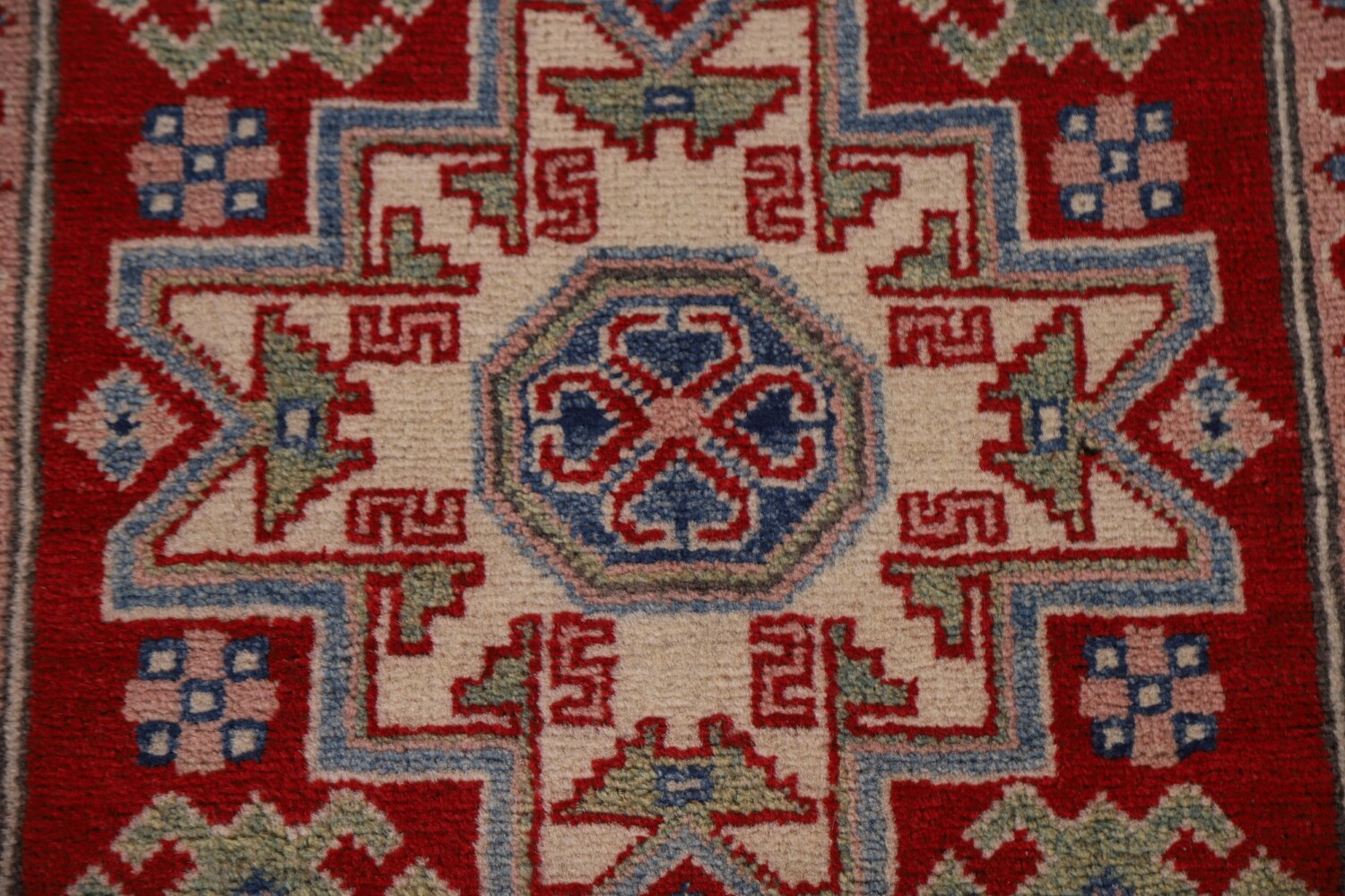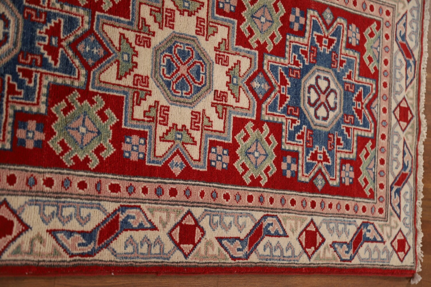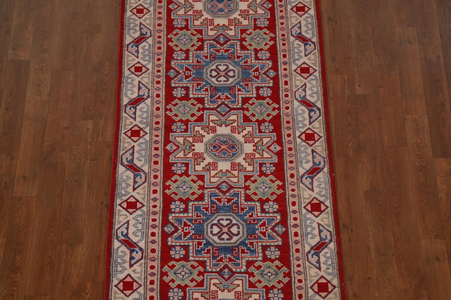 A Beautiful Genuine Pakistan Kazak rug is Hand Knotted by skillful weavers in Pakistan with 100% Wool Material. This rug is in New, First Quality condition. dimensions are 19' 3'' X 2' 6'' in foot and 587 X 76 in centimeter. the primary color is Red.