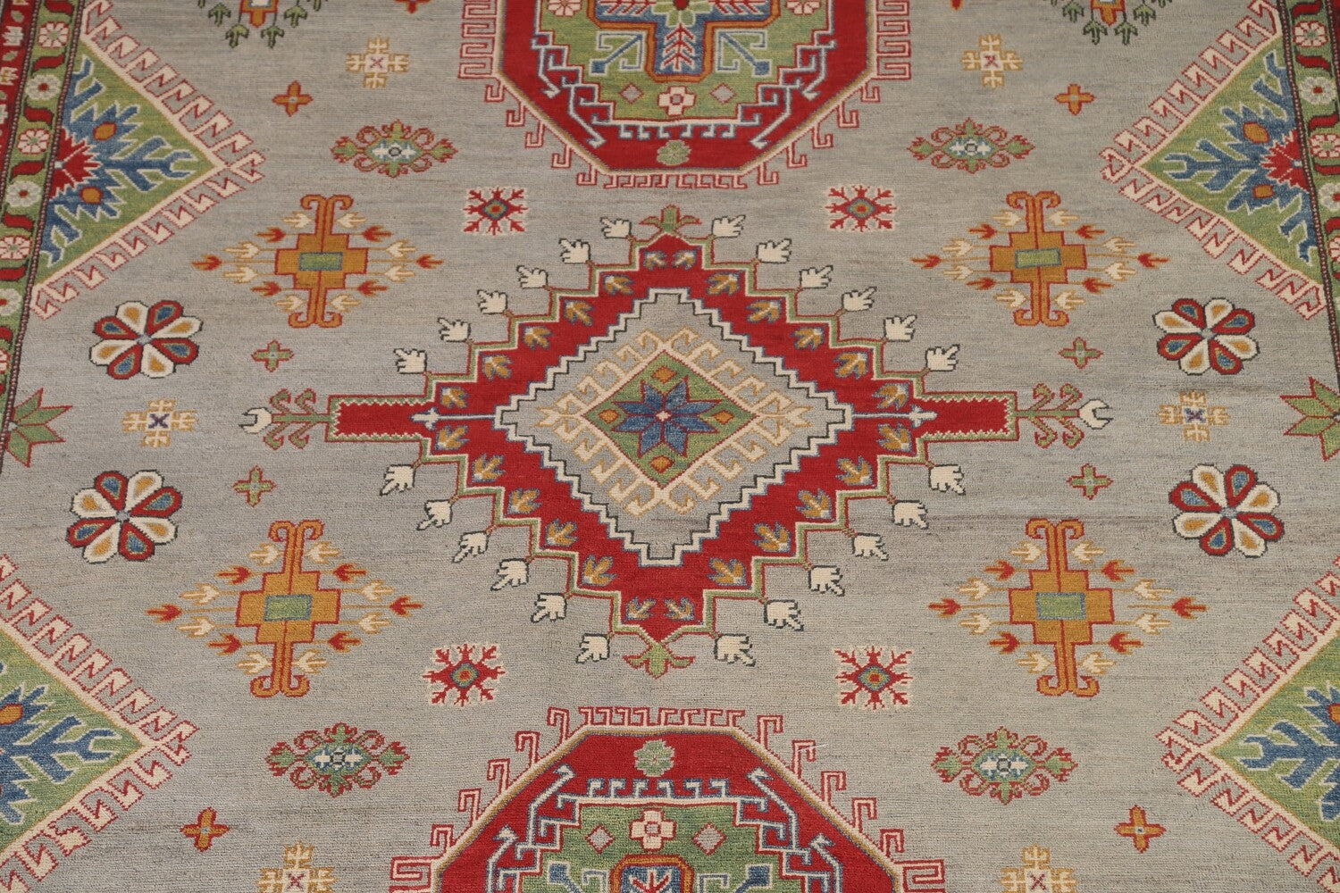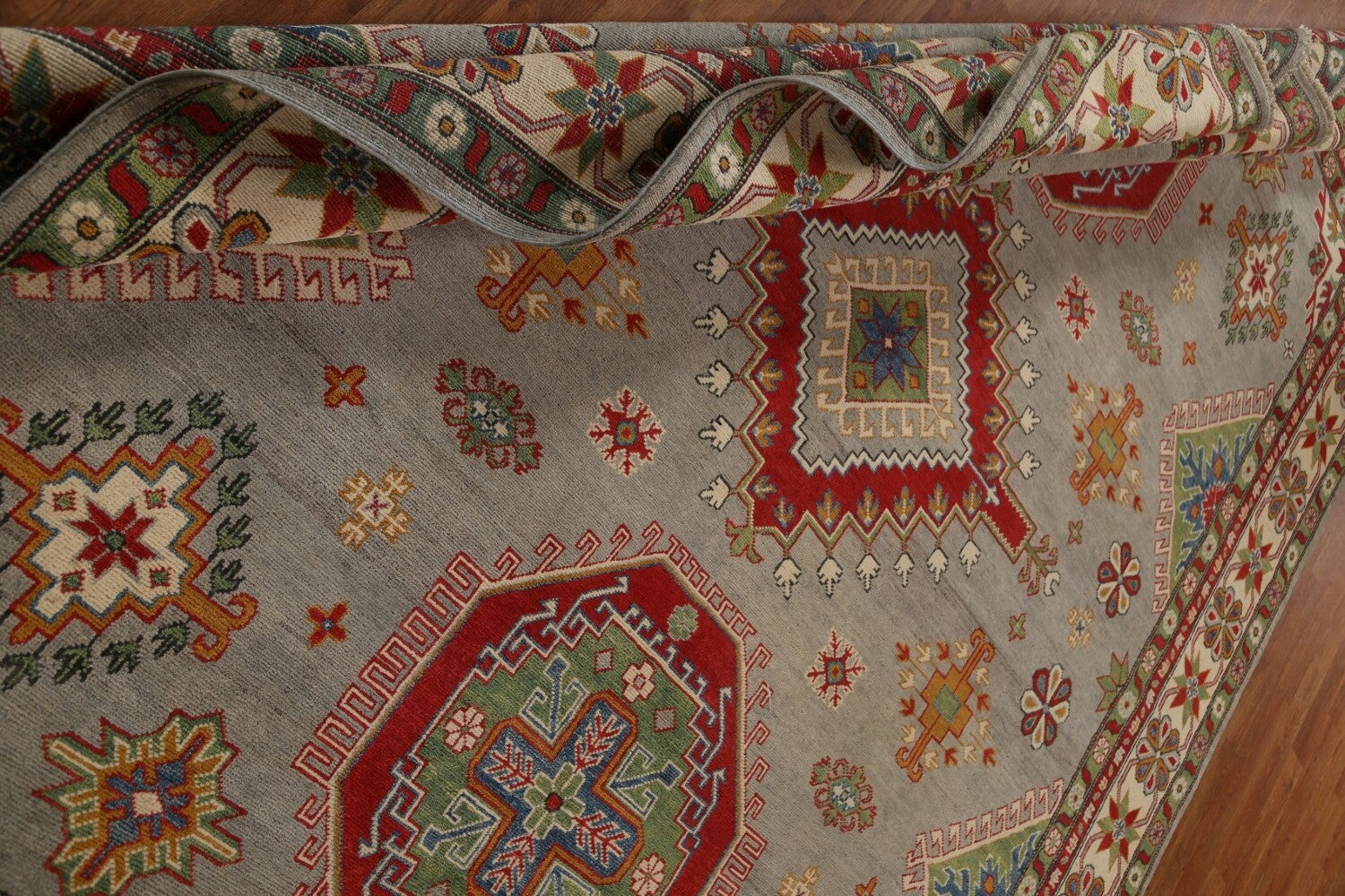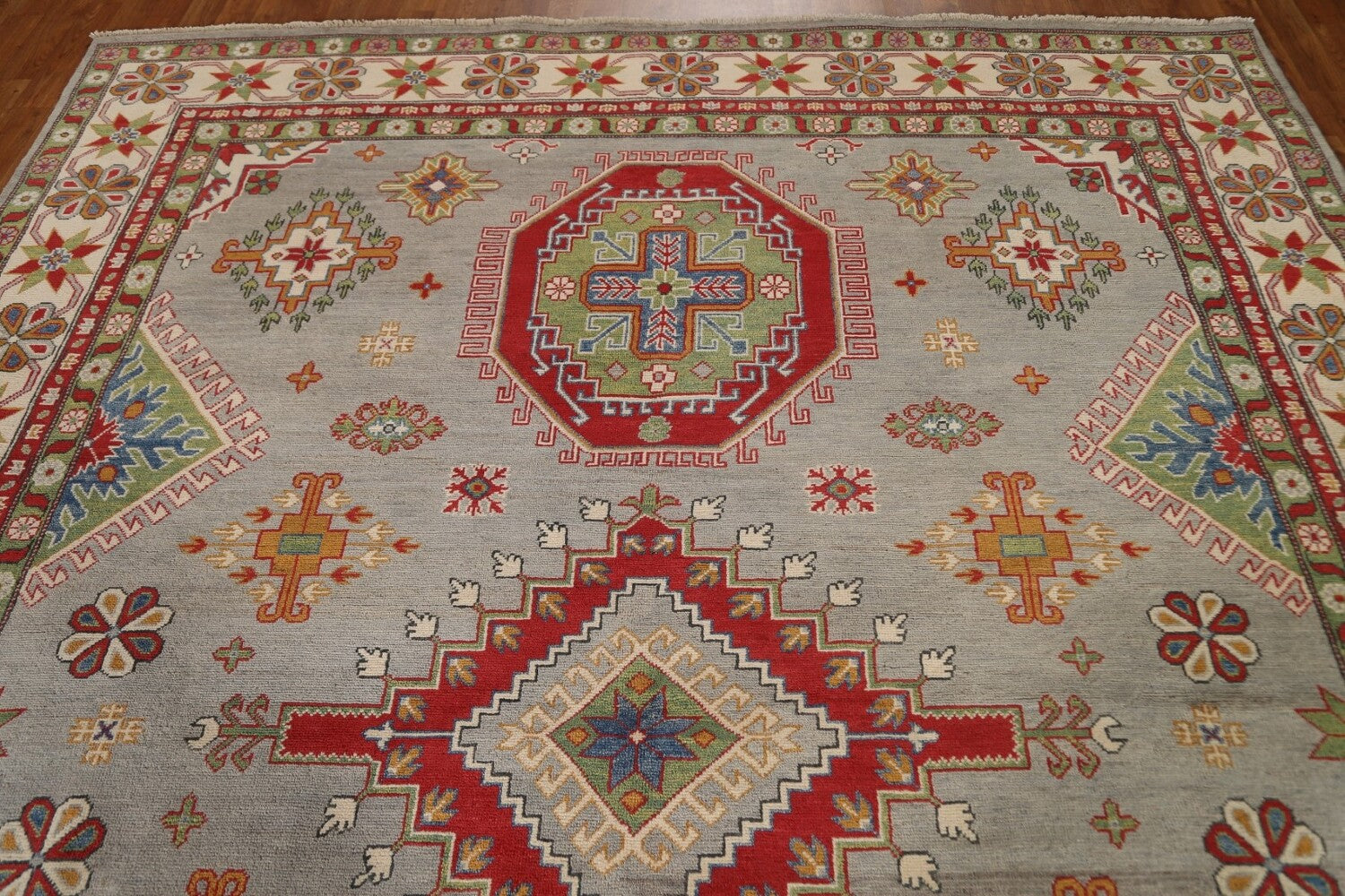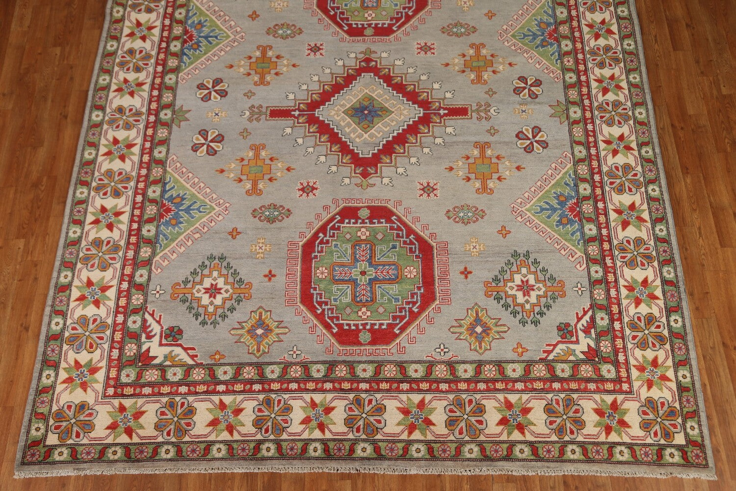 A Beautiful Genuine Pakistan Kazak rug is Hand Knotted by skillful weavers in Pakistan with 100% Wool Material. This rug is in condition. dimensions are 10' 2'' X 8' 4'' in foot and 310 X 254 in centimeter. the primary color is Greys & Charcoal.