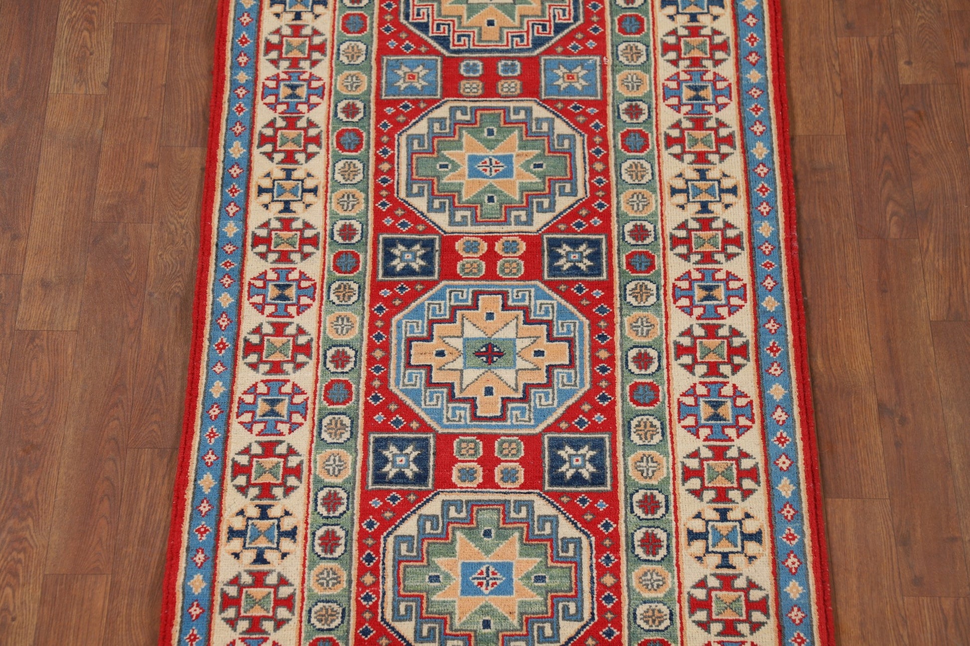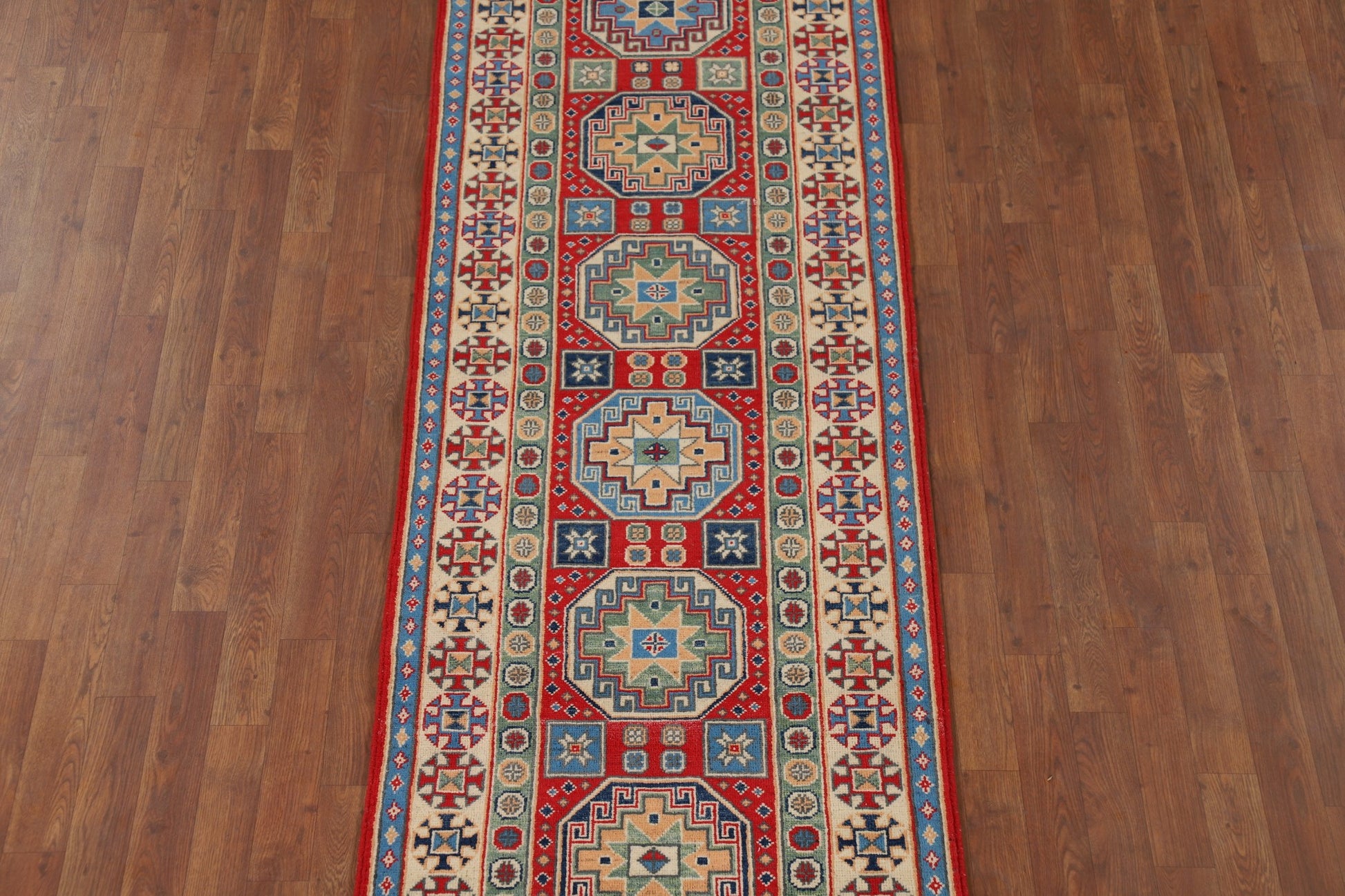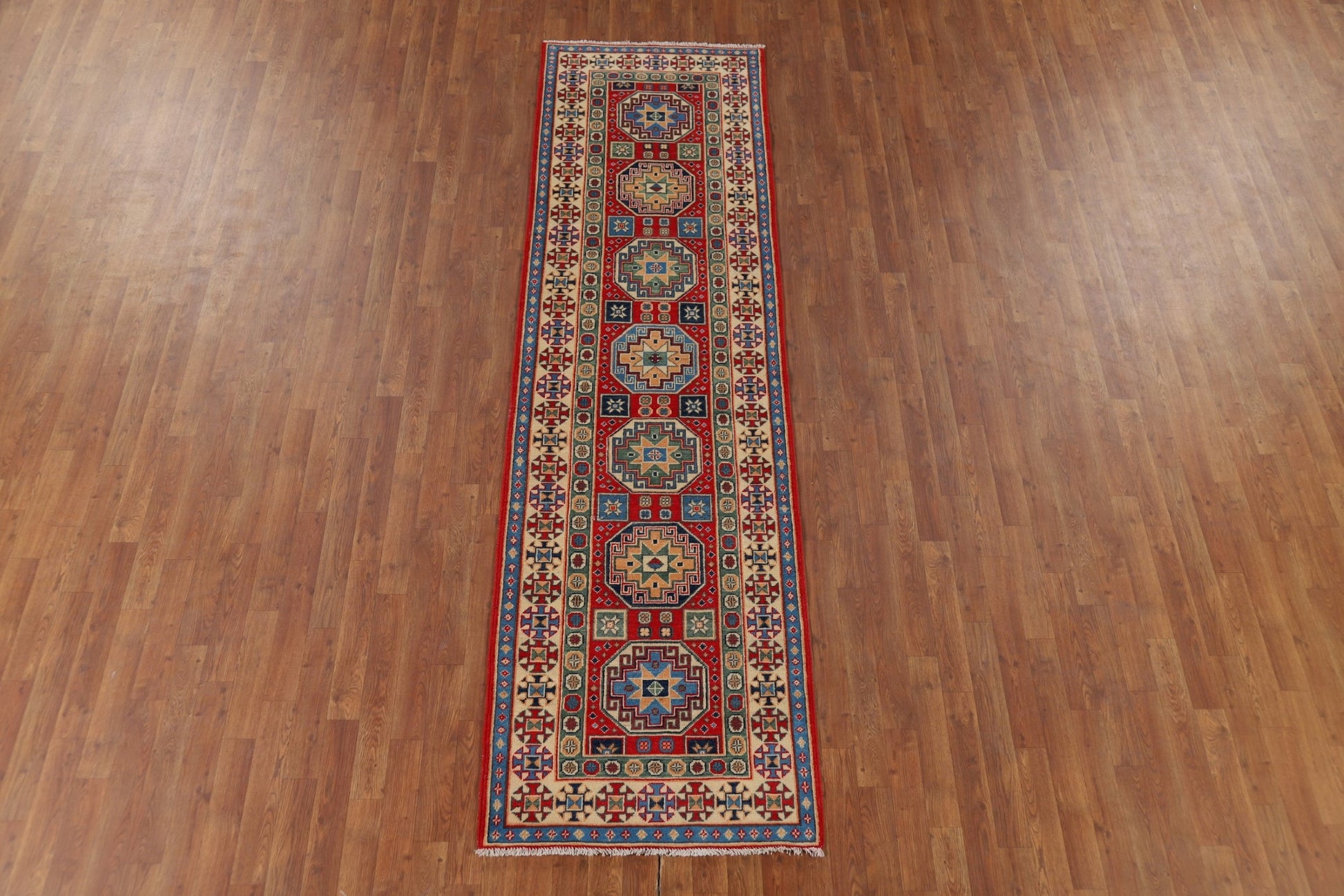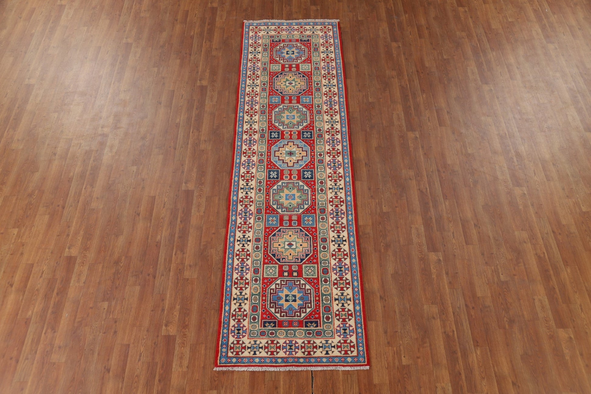 A Beautiful Genuine Pakistan Kazak rug is Hand Knotted by skillful weavers in Pakistan with 100% Wool Material. This rug is in New, First Quality condition. dimensions are 9' 8'' X 2' 9'' in foot and 295 X 84 in centimeter. the primary color is Red.