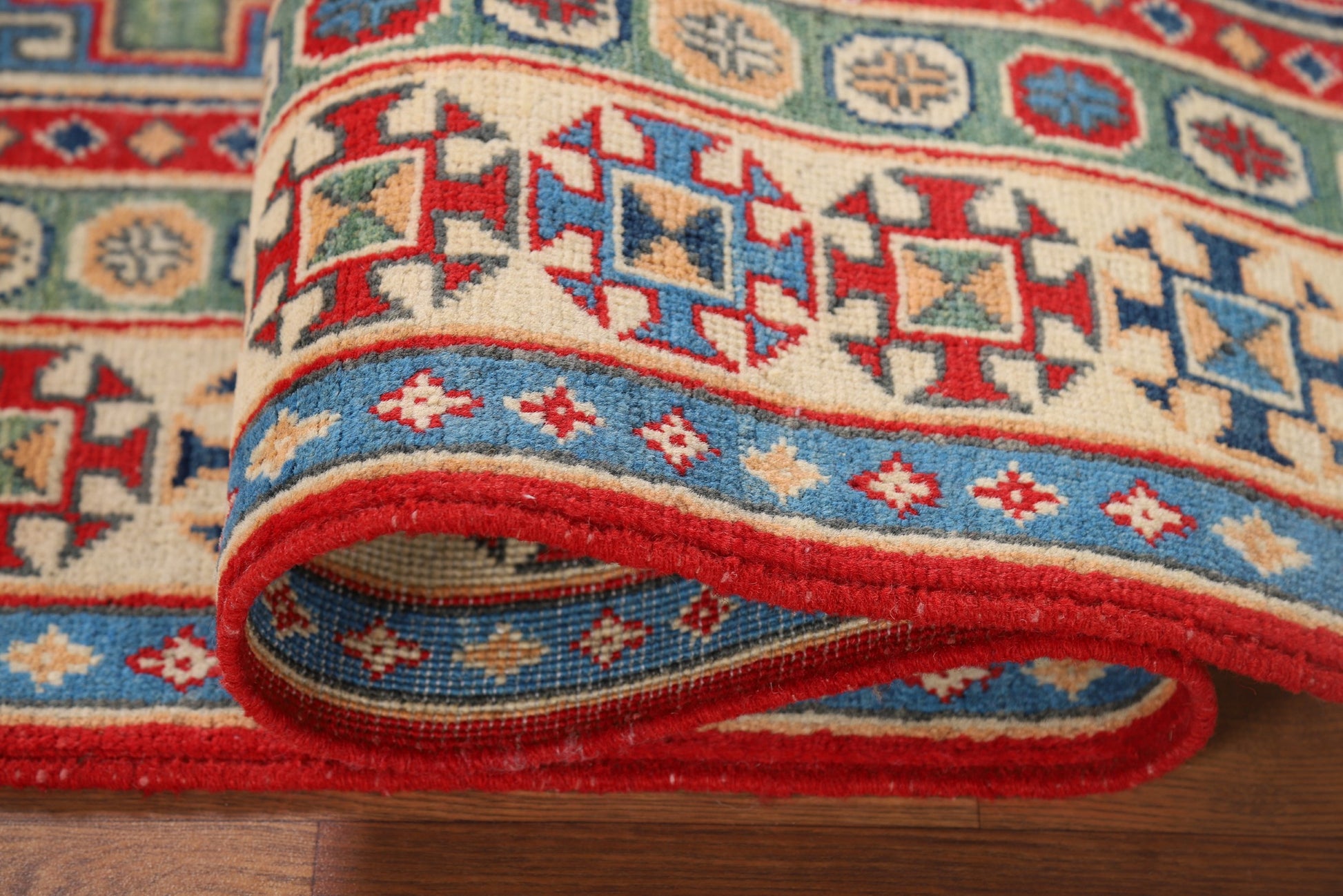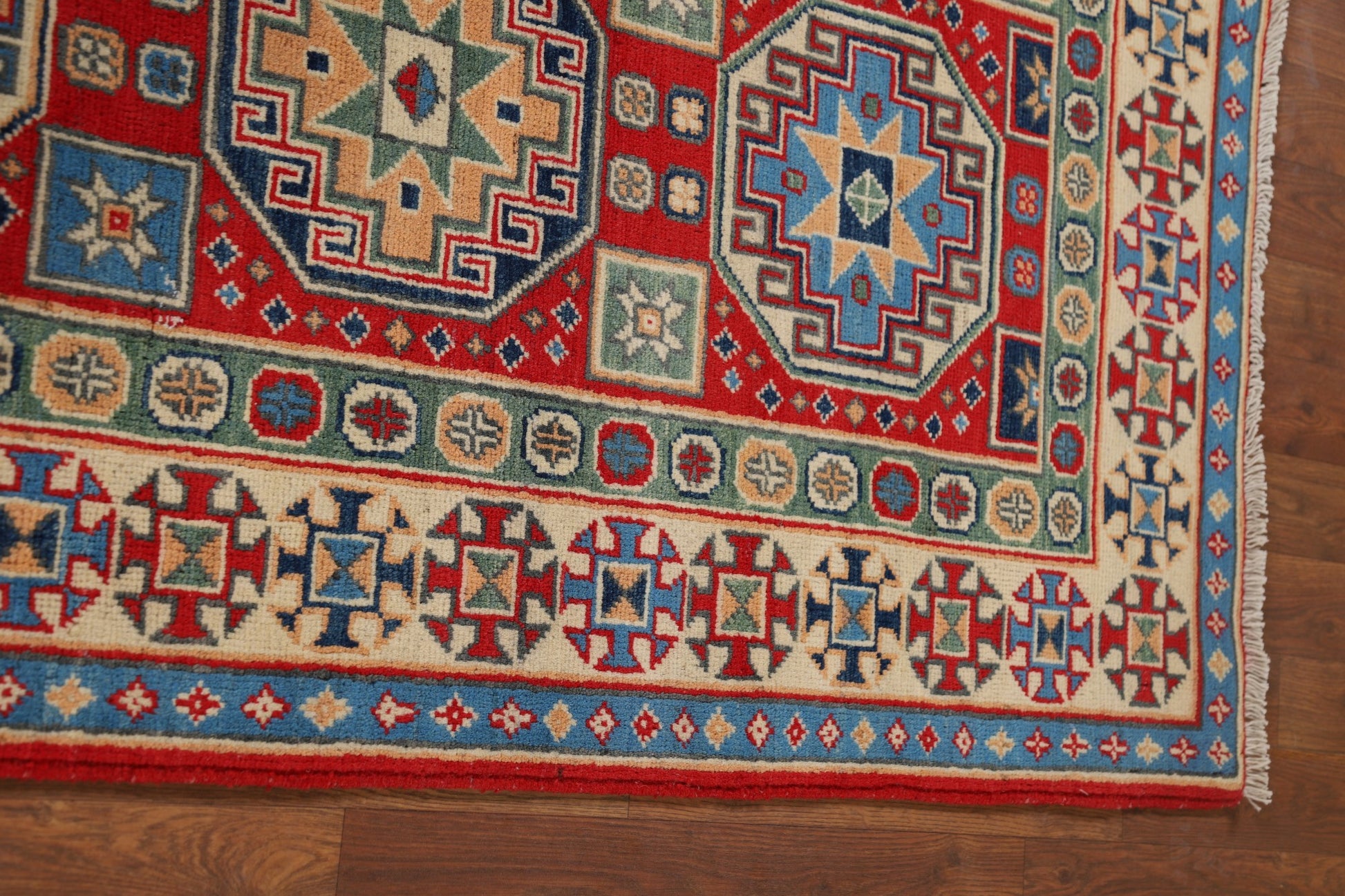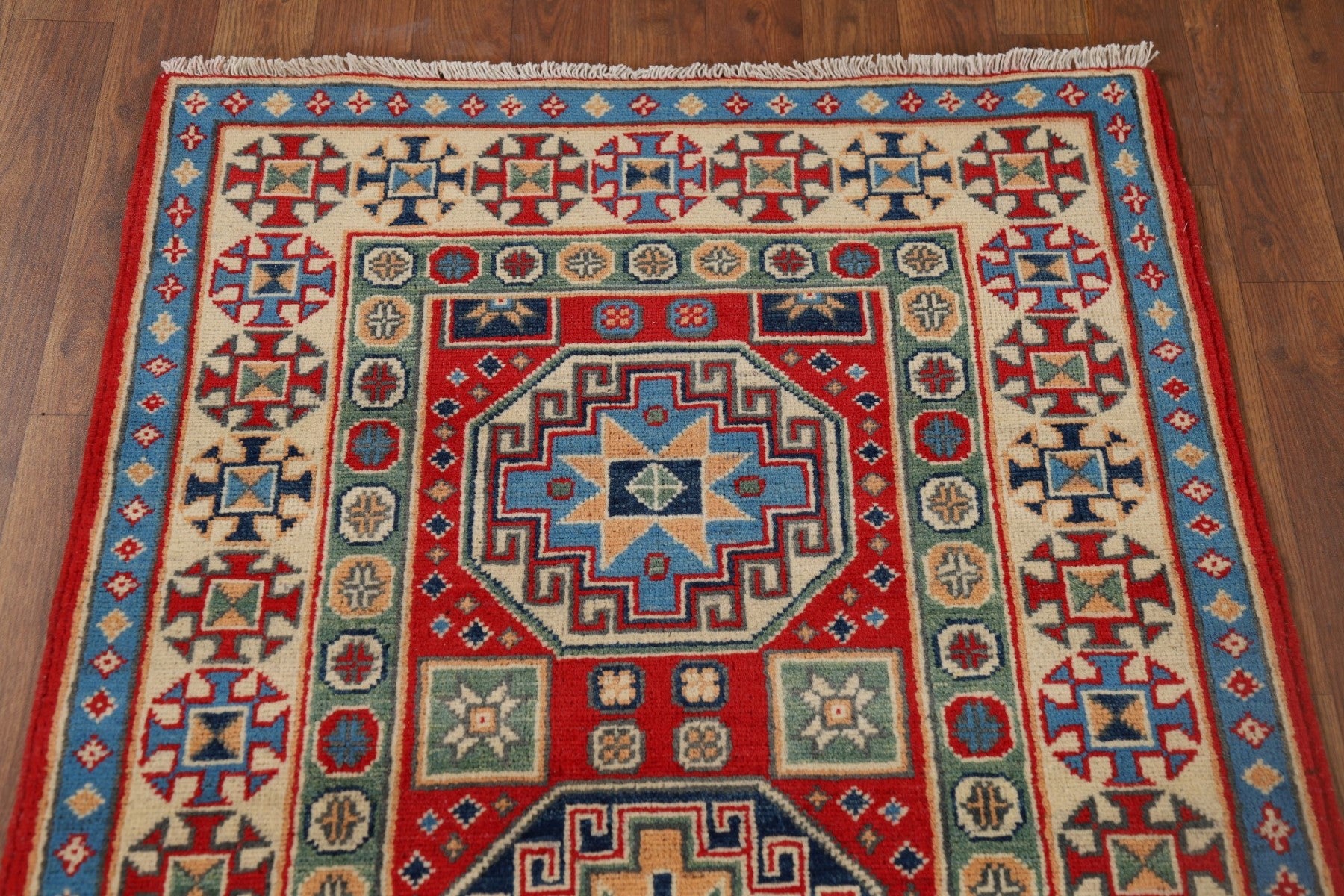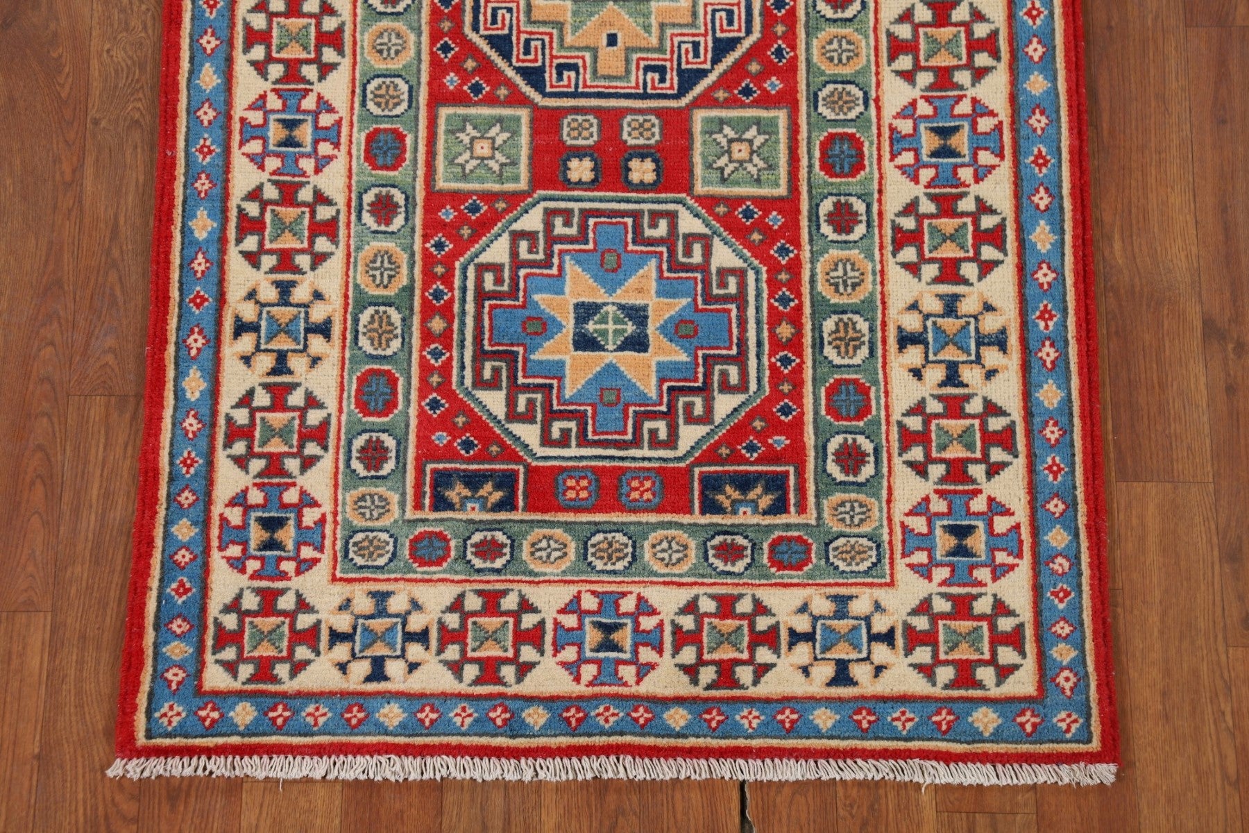 A Beautiful Genuine Pakistan Kazak rug is Hand Knotted by skillful weavers in Pakistan with 100% Wool Material. This rug is in New, First Quality condition. dimensions are 9' 8'' X 2' 9'' in foot and 295 X 84 in centimeter. the primary color is Red.