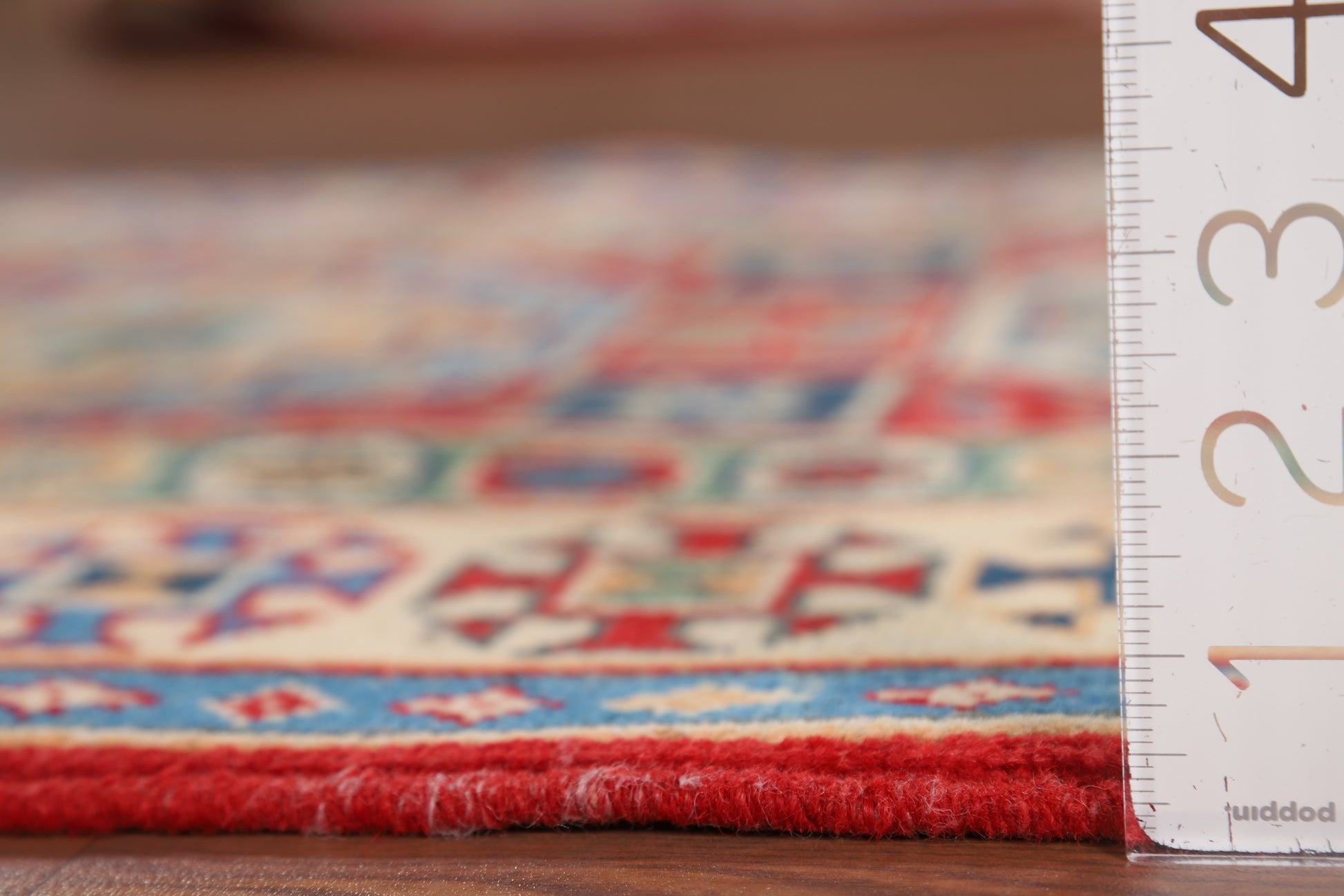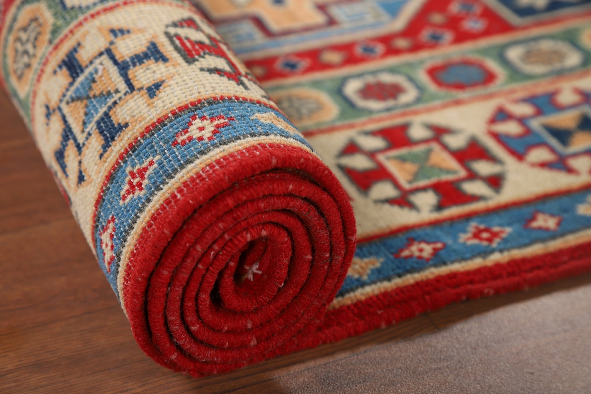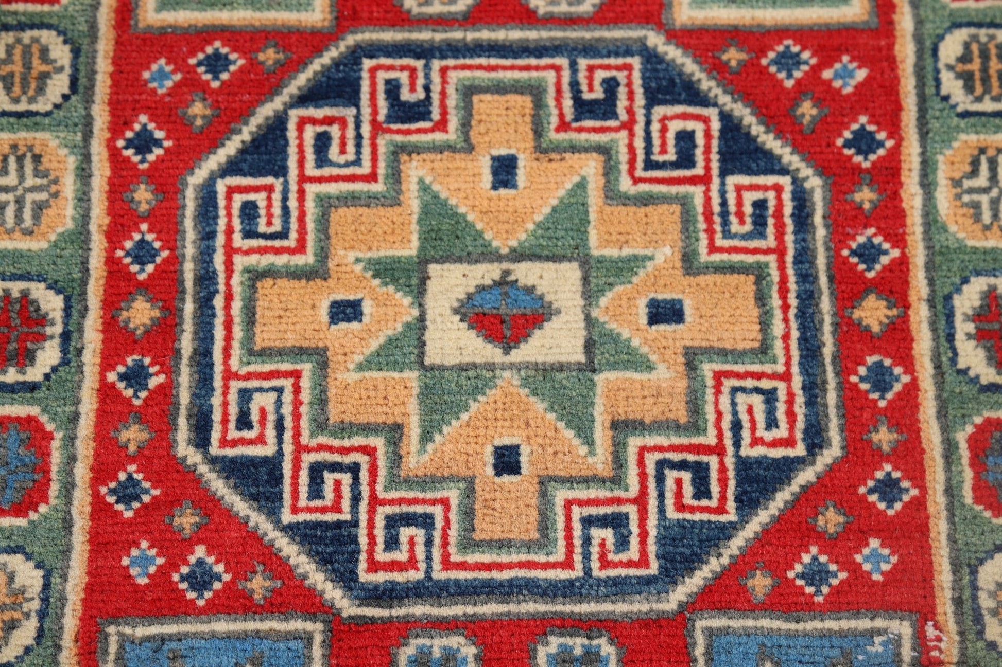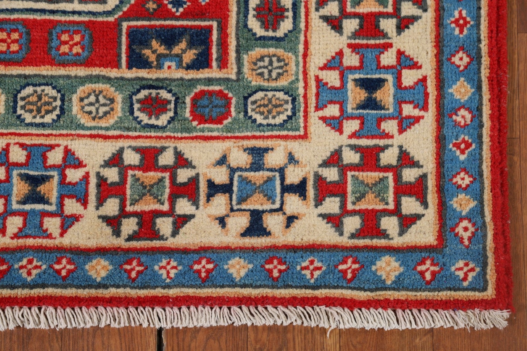 A Beautiful Genuine Pakistan Kazak rug is Hand Knotted by skillful weavers in Pakistan with 100% Wool Material. This rug is in New, First Quality condition. dimensions are 9' 8'' X 2' 9'' in foot and 295 X 84 in centimeter. the primary color is Red.