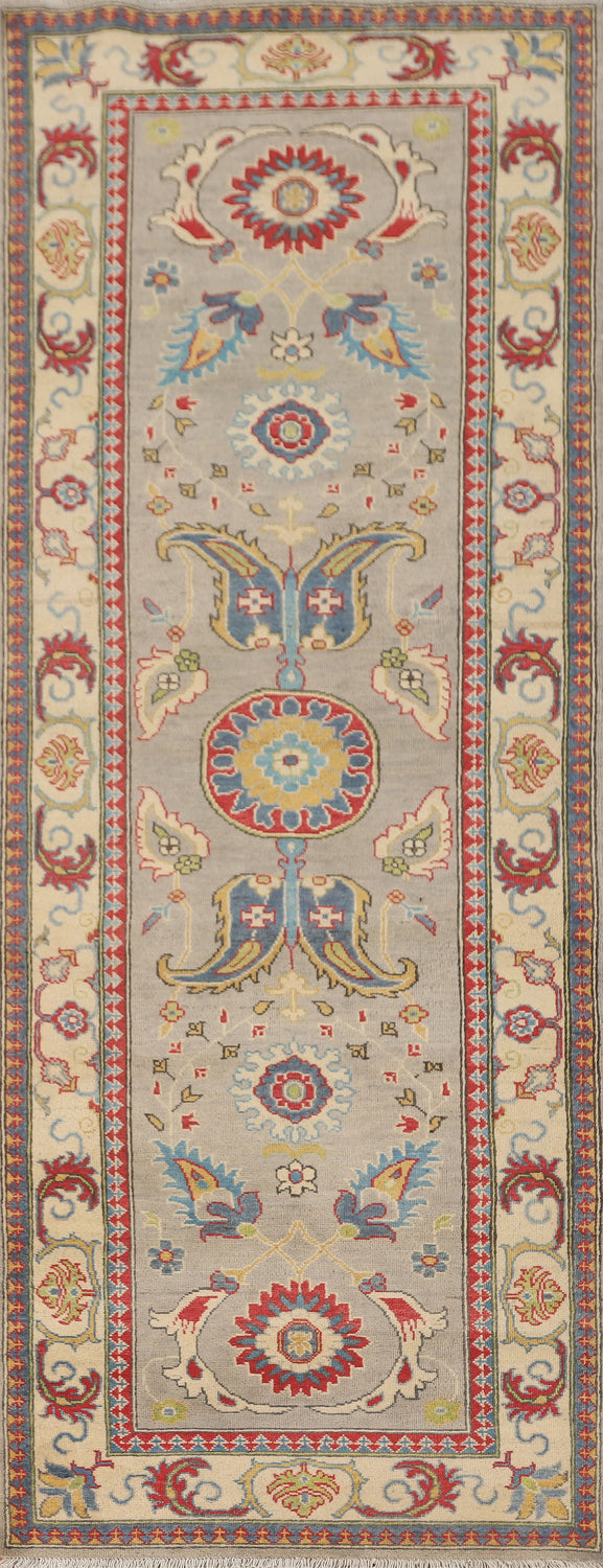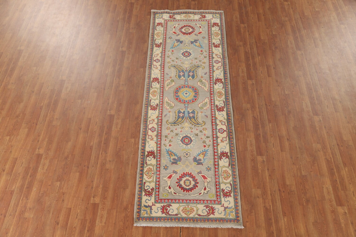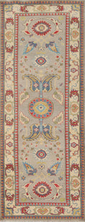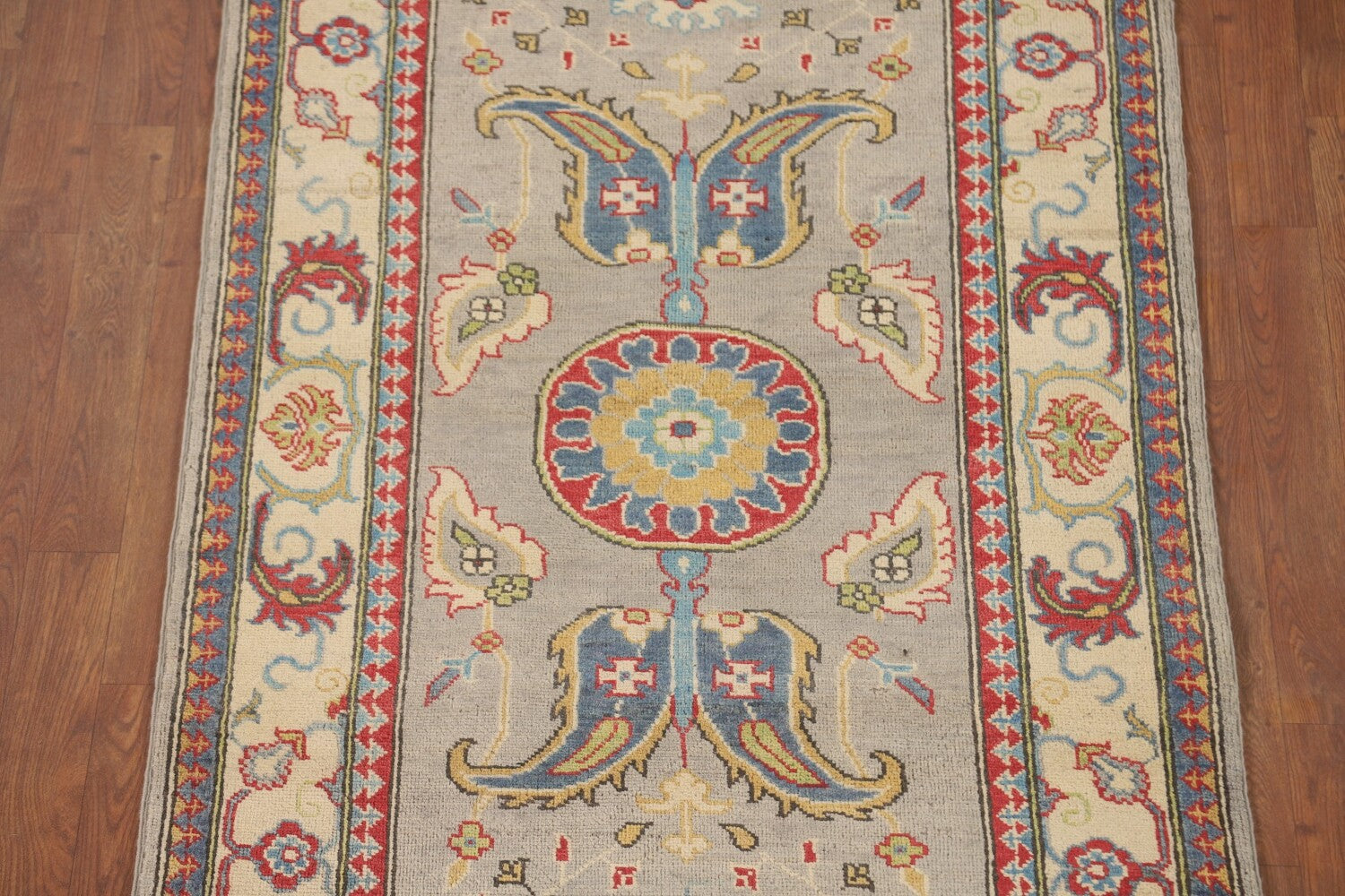 A Beautiful Genuine Pakistan Kazak rug is Hand Knotted by skillful weavers in Pakistan with 100% Wool Material. This rug is in New, First Quality condition. dimensions are 9' 8'' X 3' 3'' in foot and 295 X 99 in centimeter. the primary color is Green.