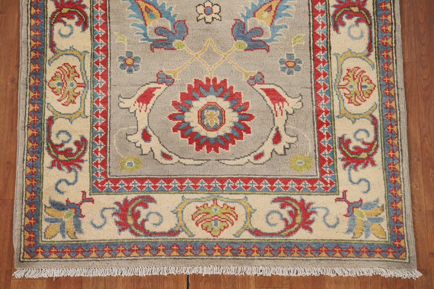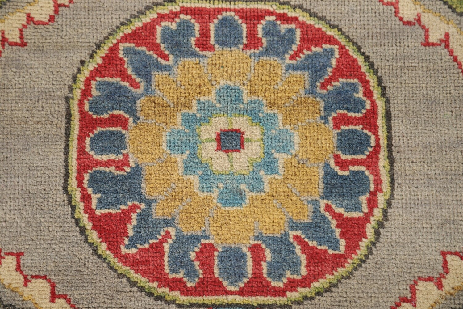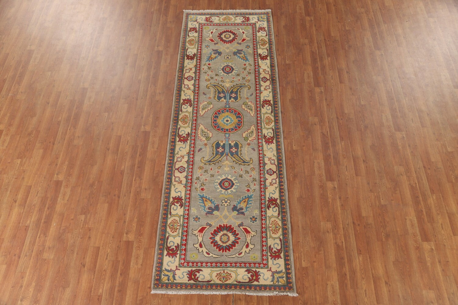 A Beautiful Genuine Pakistan Kazak rug is Hand Knotted by skillful weavers in Pakistan with 100% Wool Material. This rug is in New, First Quality condition. dimensions are 9' 8'' X 3' 3'' in foot and 295 X 99 in centimeter. the primary color is Green.