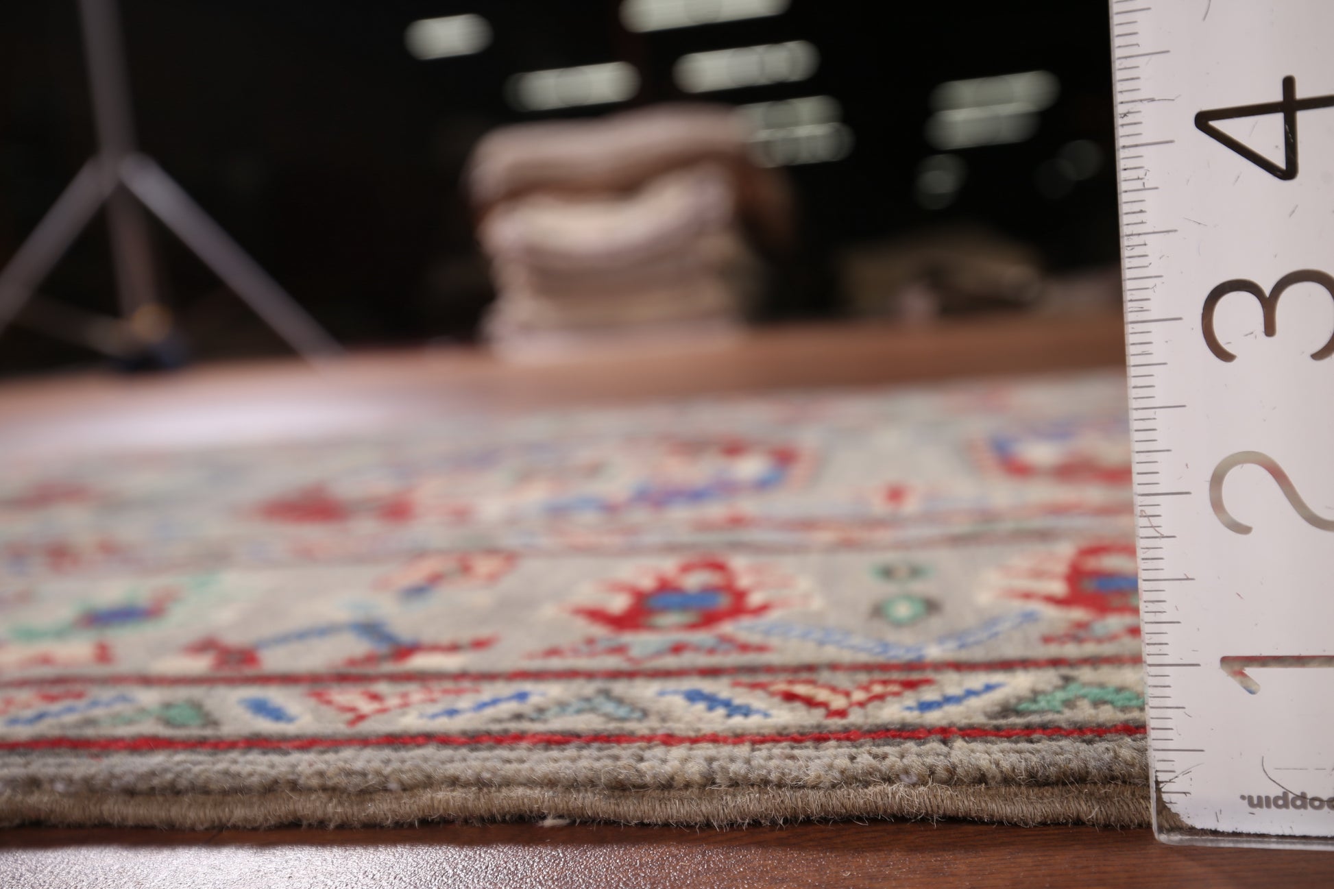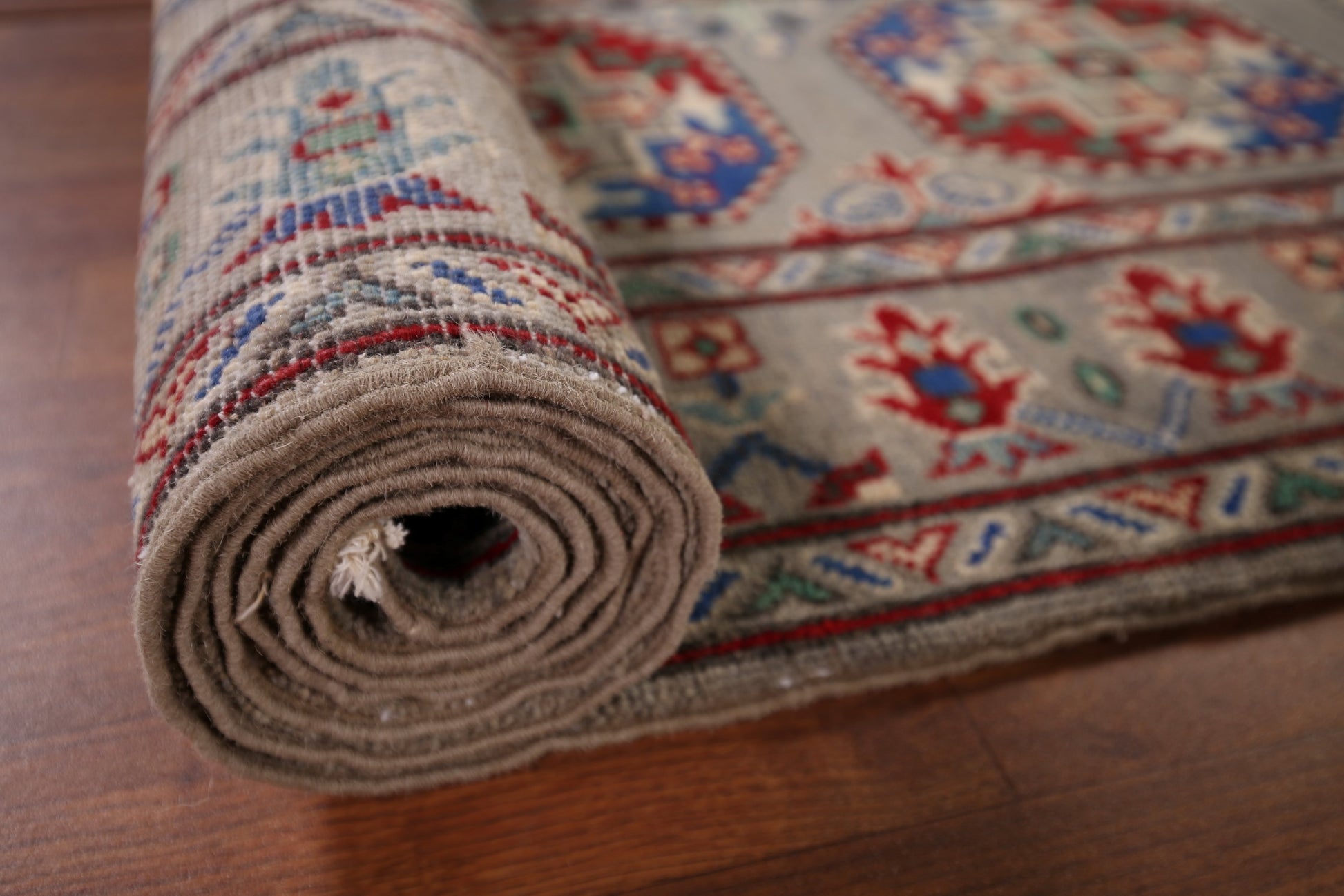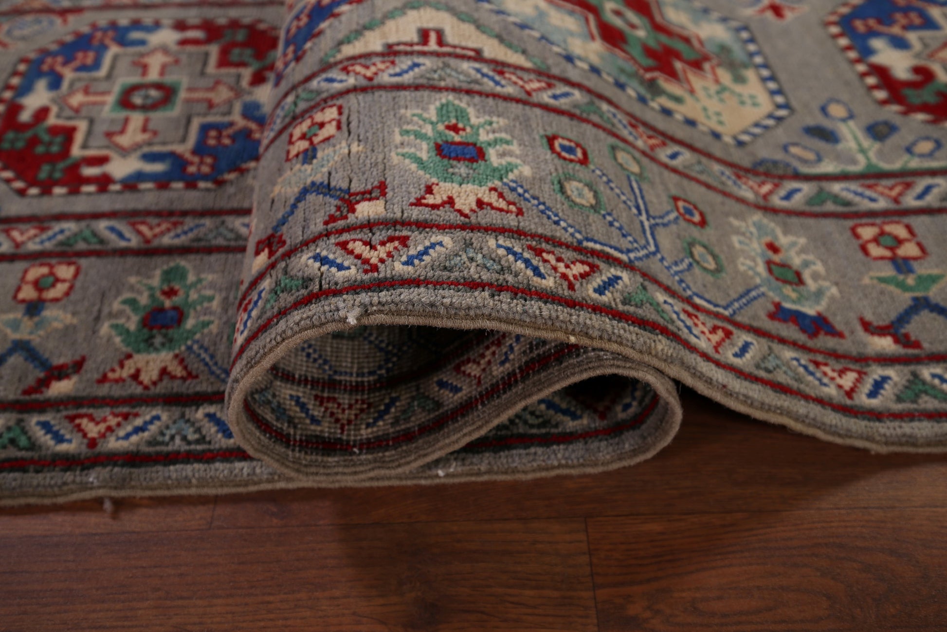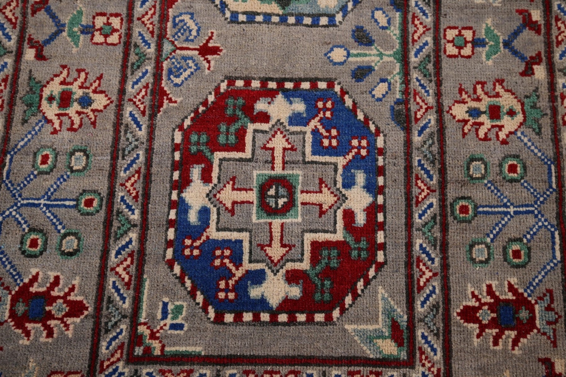 A Beautiful Genuine Pakistan Kazak rug is Hand Knotted by skillful weavers in Pakistan with 100% Wool Material. This rug is in New, First Quality condition. dimensions are 12' 9'' X 2' 6'' in foot and 389 X 76 in centimeter. the primary color is Greys & Charcoal.