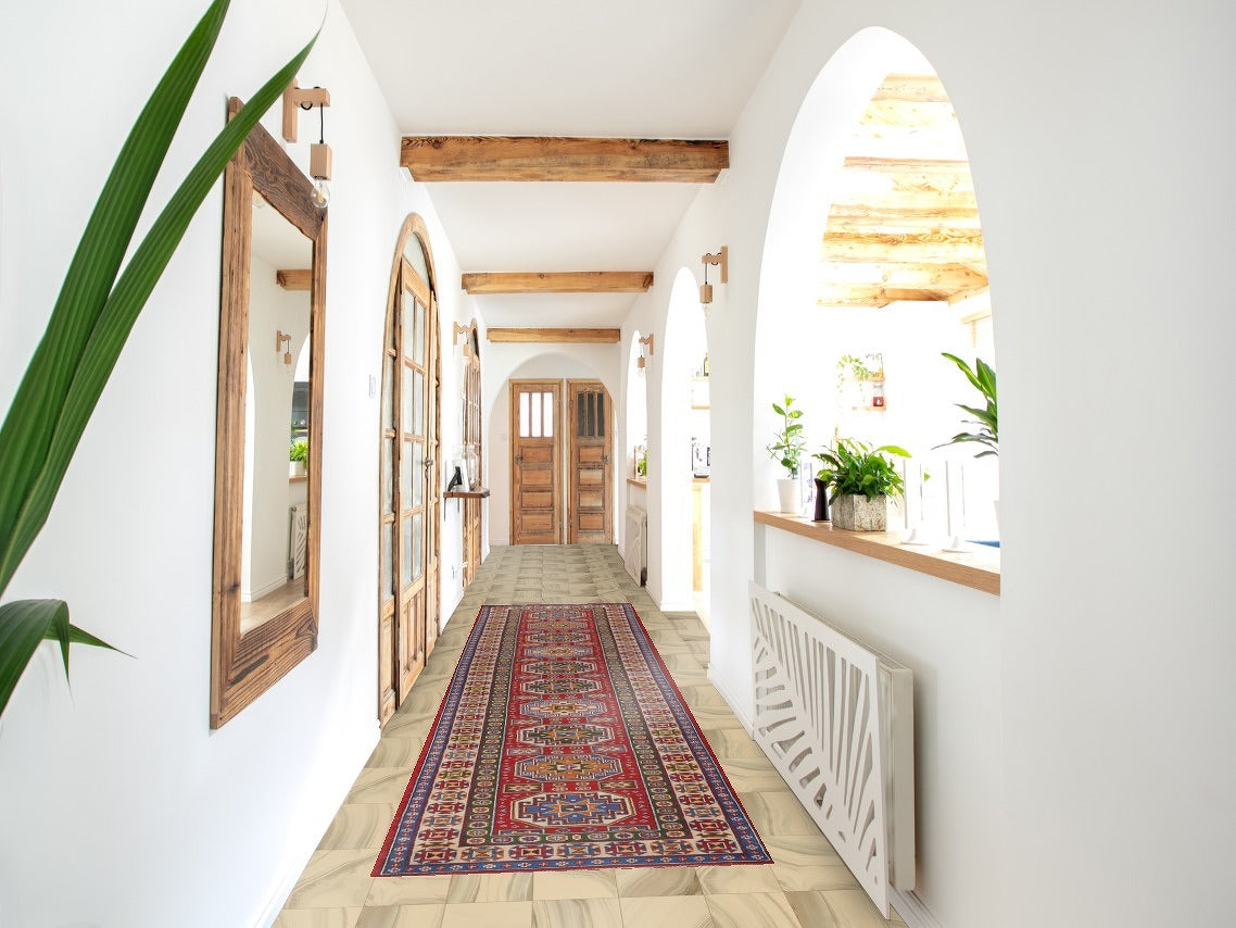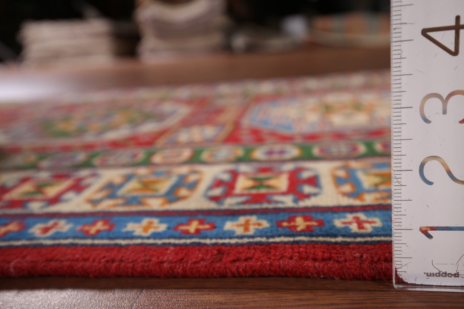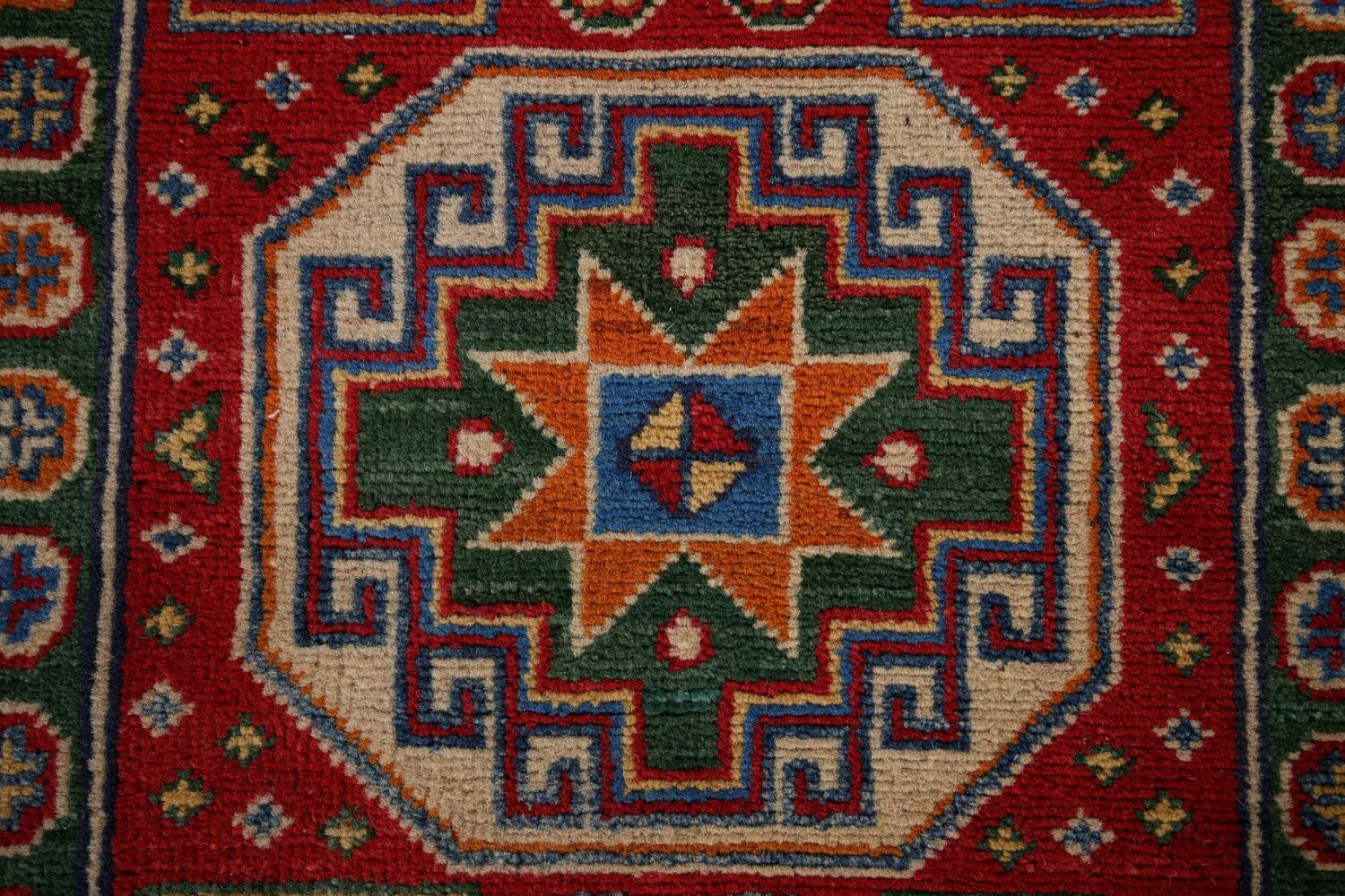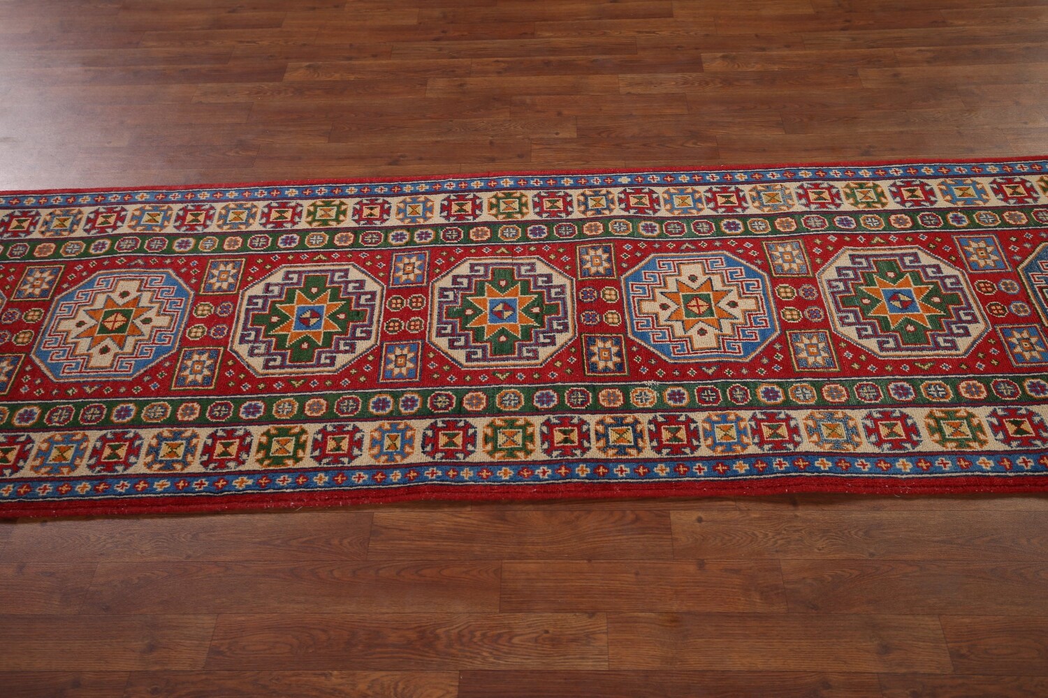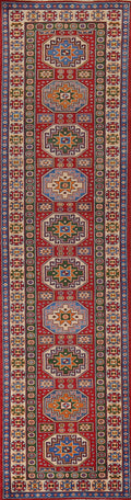 A Beautiful Genuine Pakistan Kazak rug is Hand Knotted by skillful weavers in Pakistan with 100% Wool Material. This rug is in New, First Quality condition. dimensions are 13' 1'' X 2' 9'' in foot and 399 X 84 in centimeter. the primary color is Red.