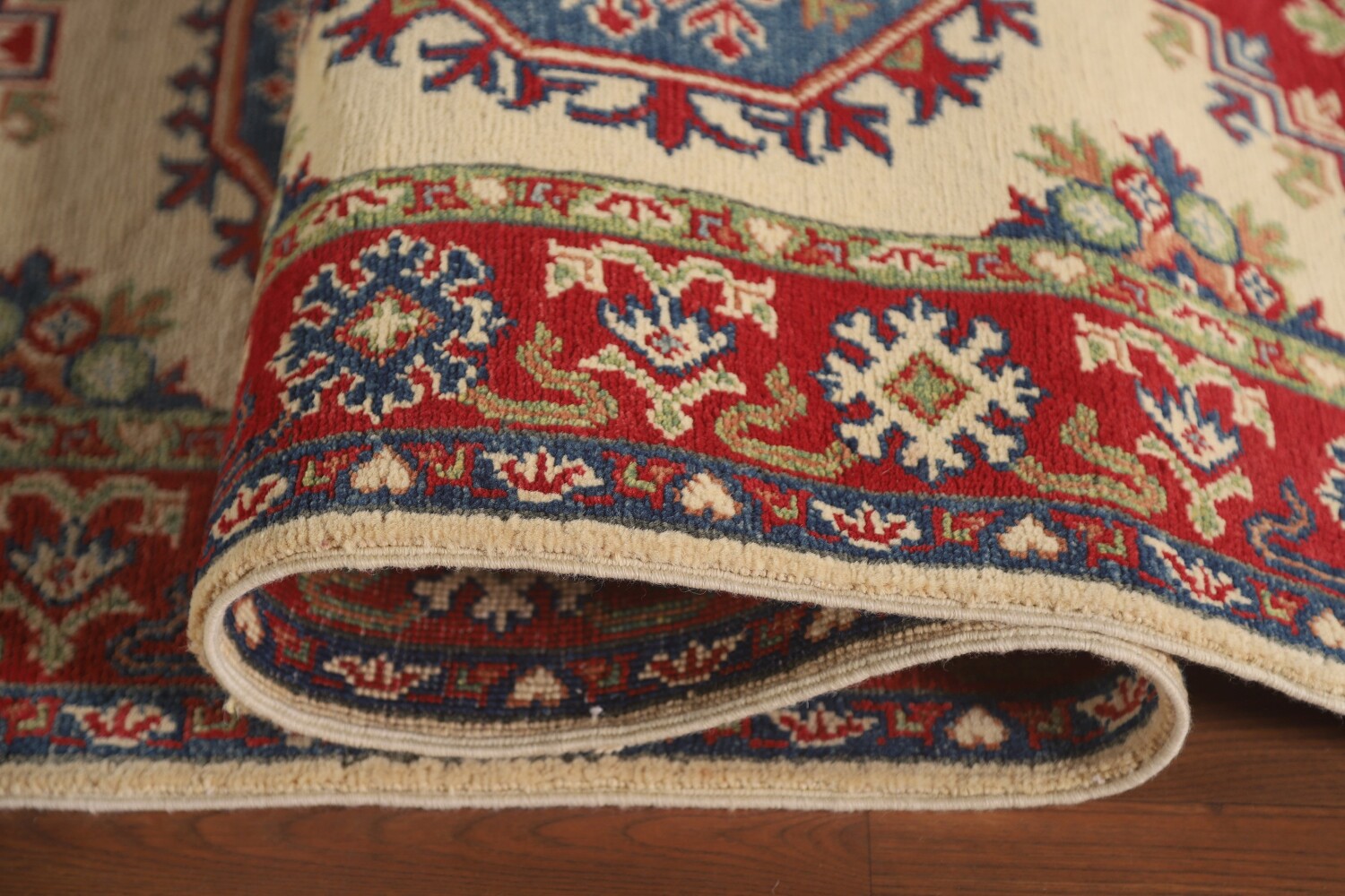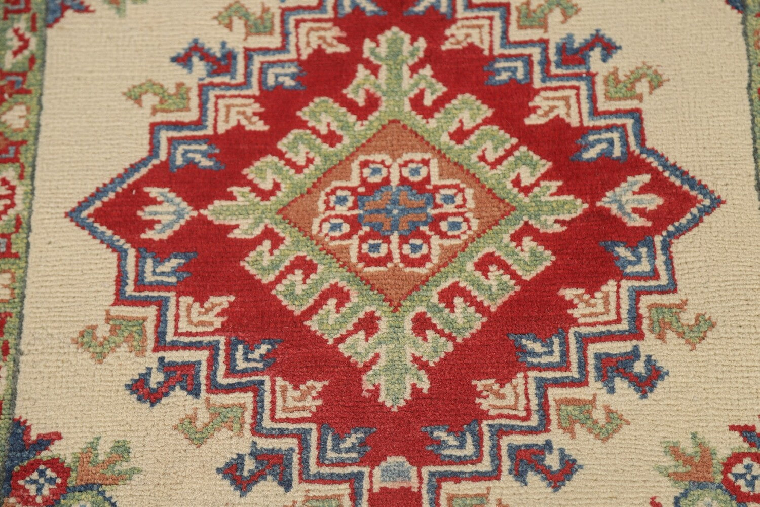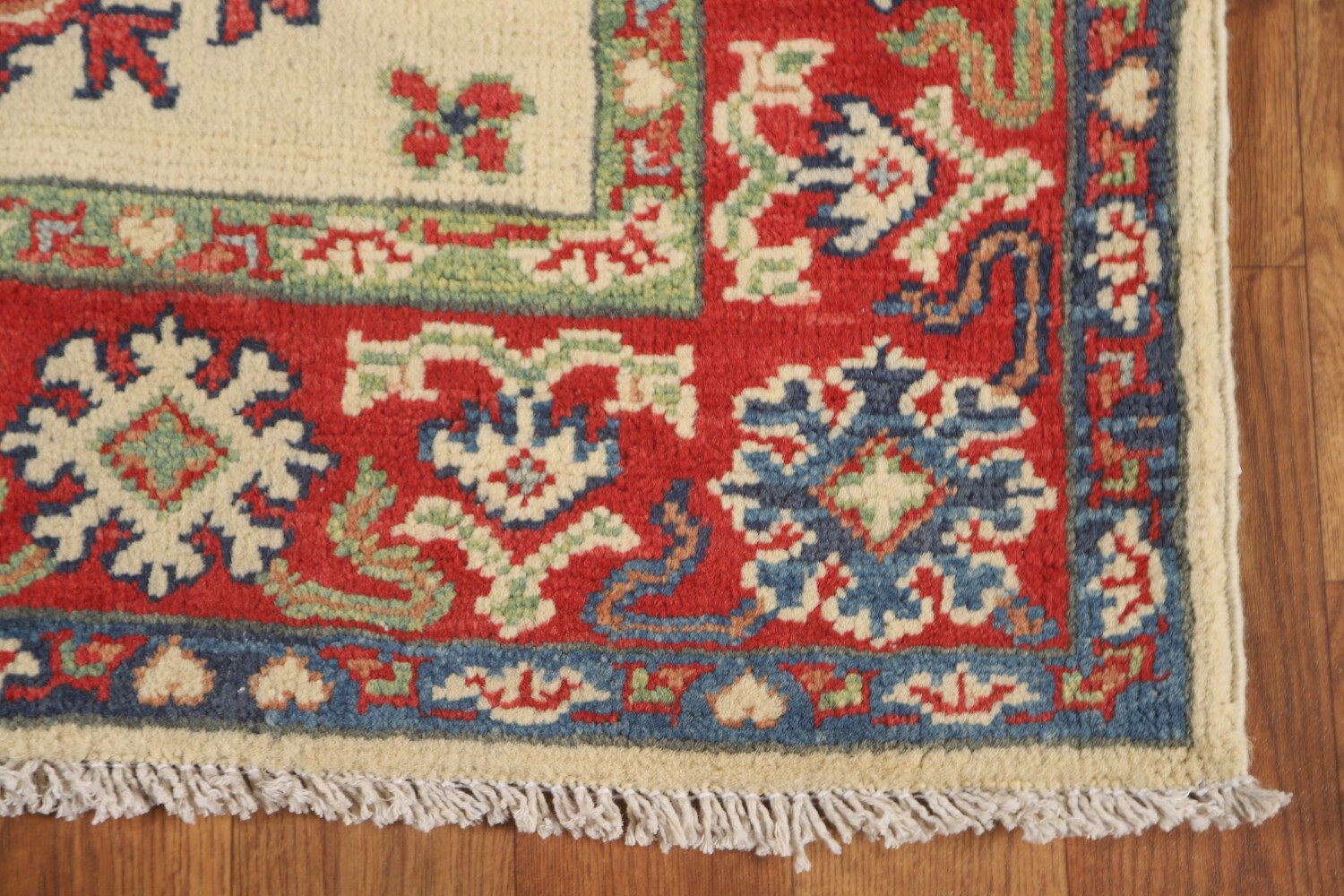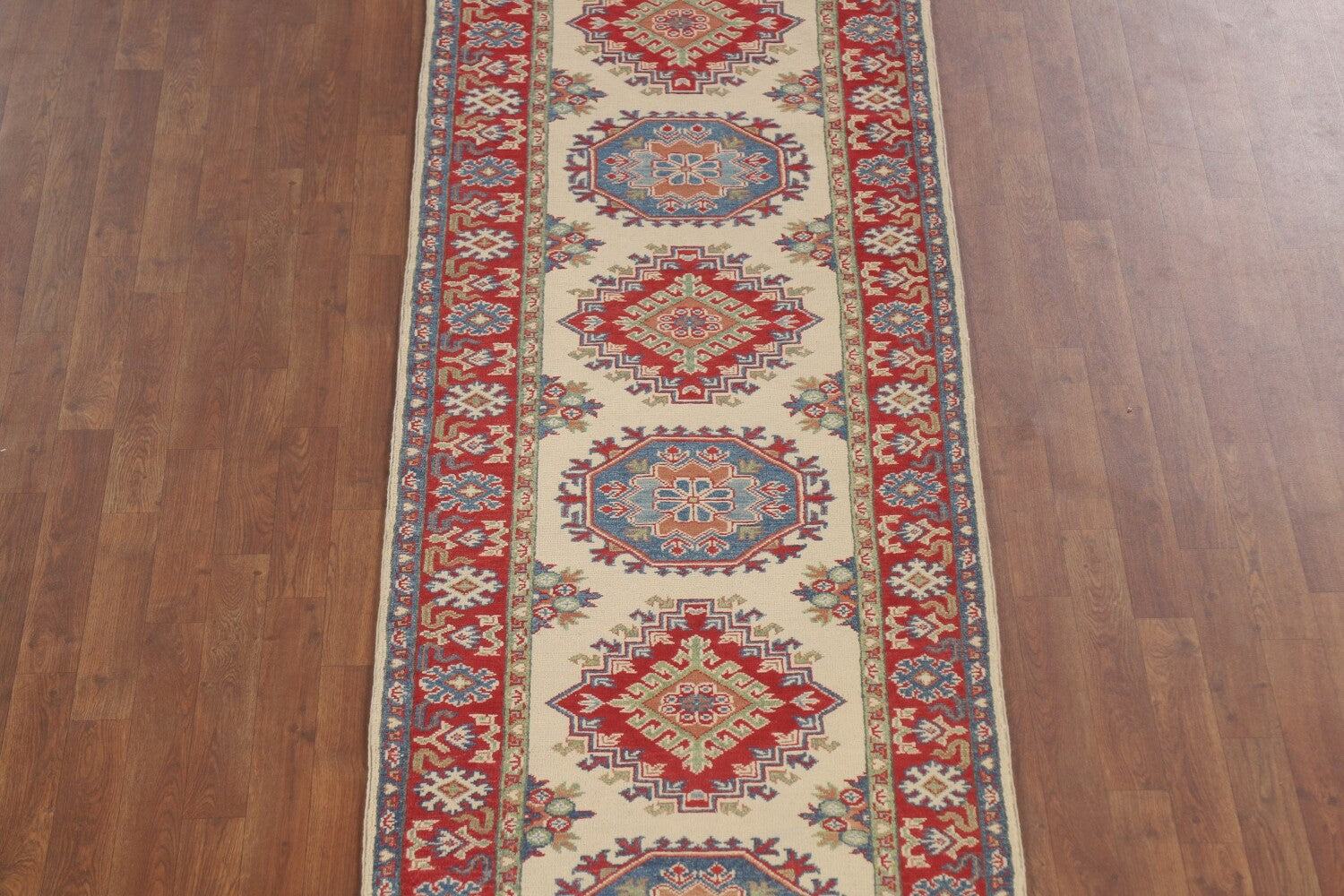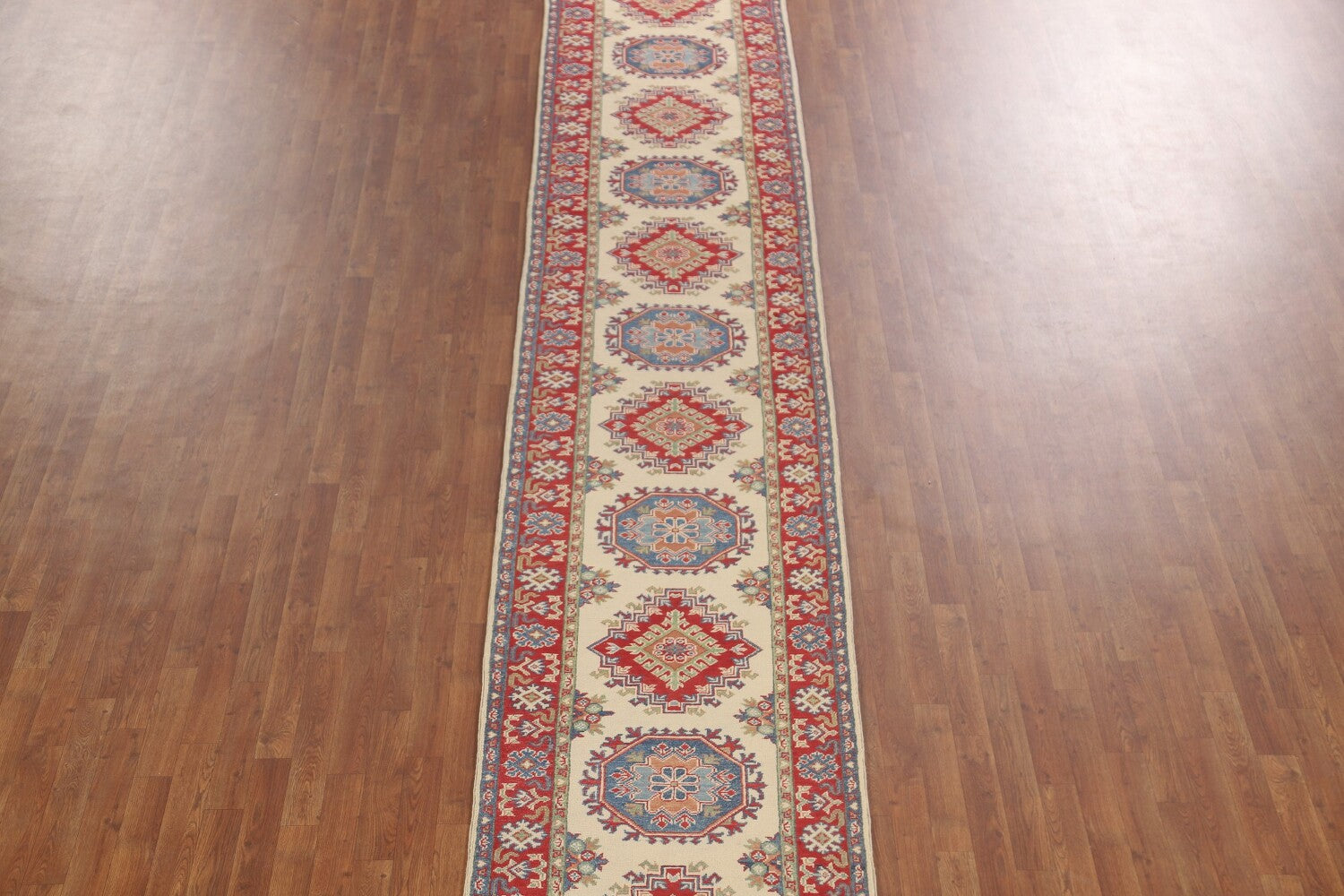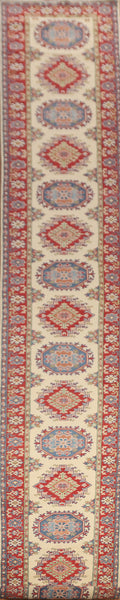 A Beautiful Genuine Pakistan Kazak rug is Hand Knotted by skillful weavers in Pakistan with 100% Wool Material. This rug is in New, First Quality condition. dimensions are 25' 6'' X 2' 10'' in foot and 777 X 86 in centimeter. the primary color is Beige & Ivories.