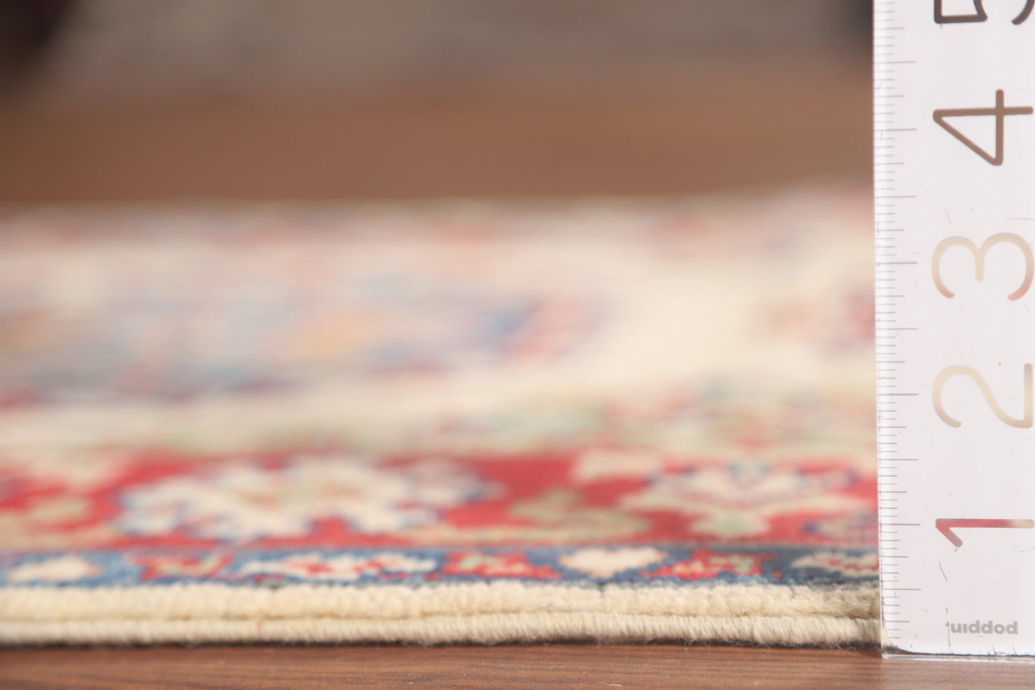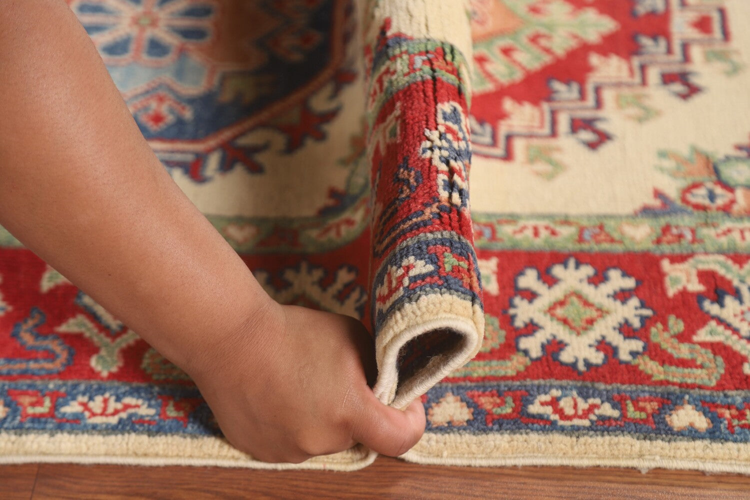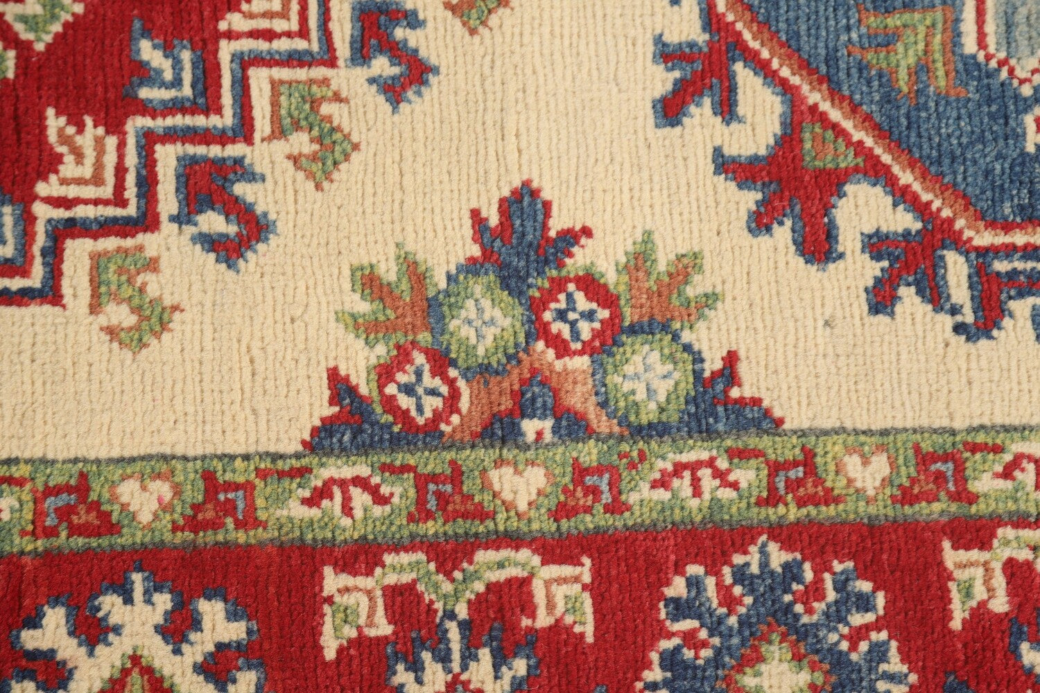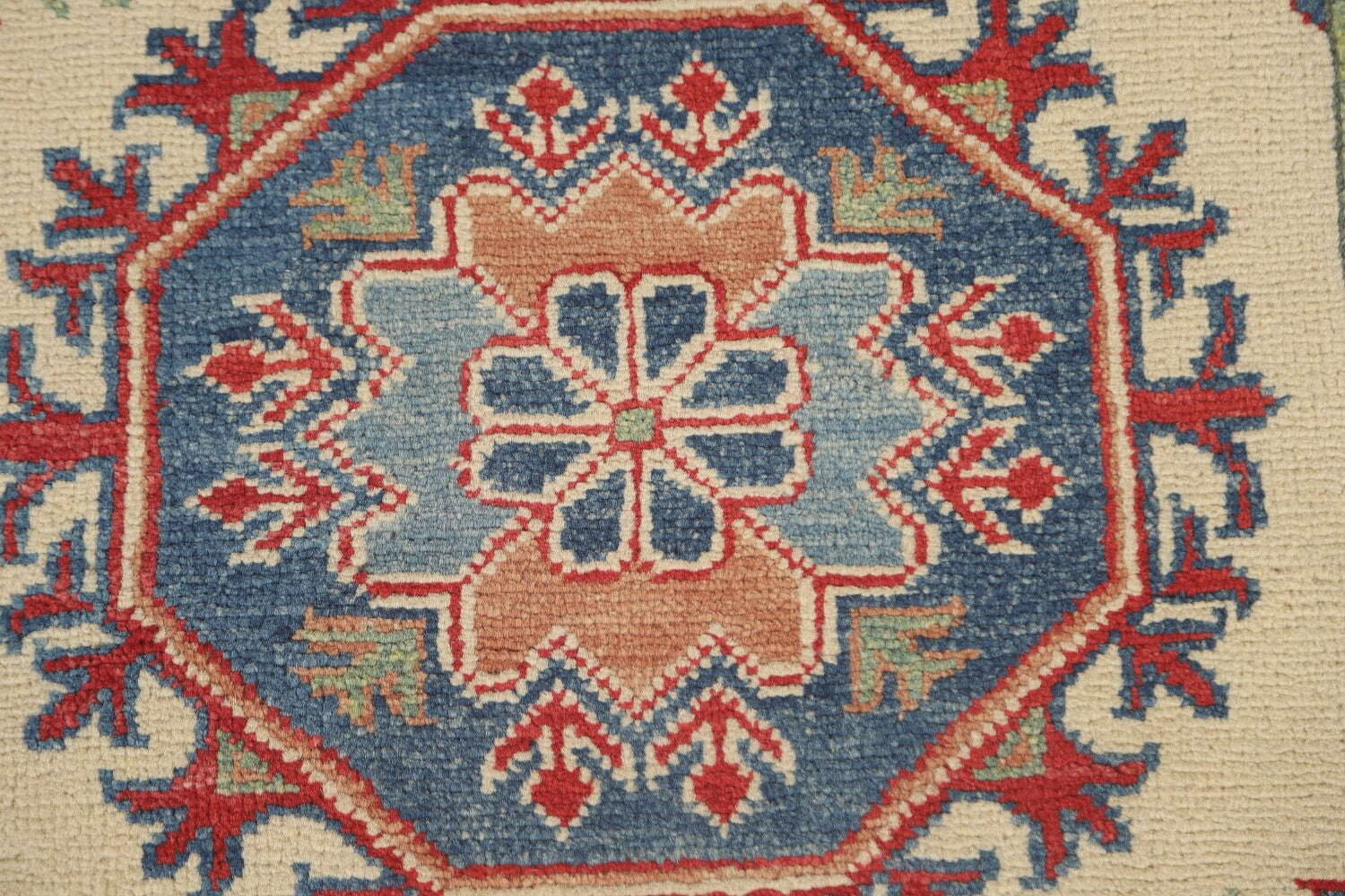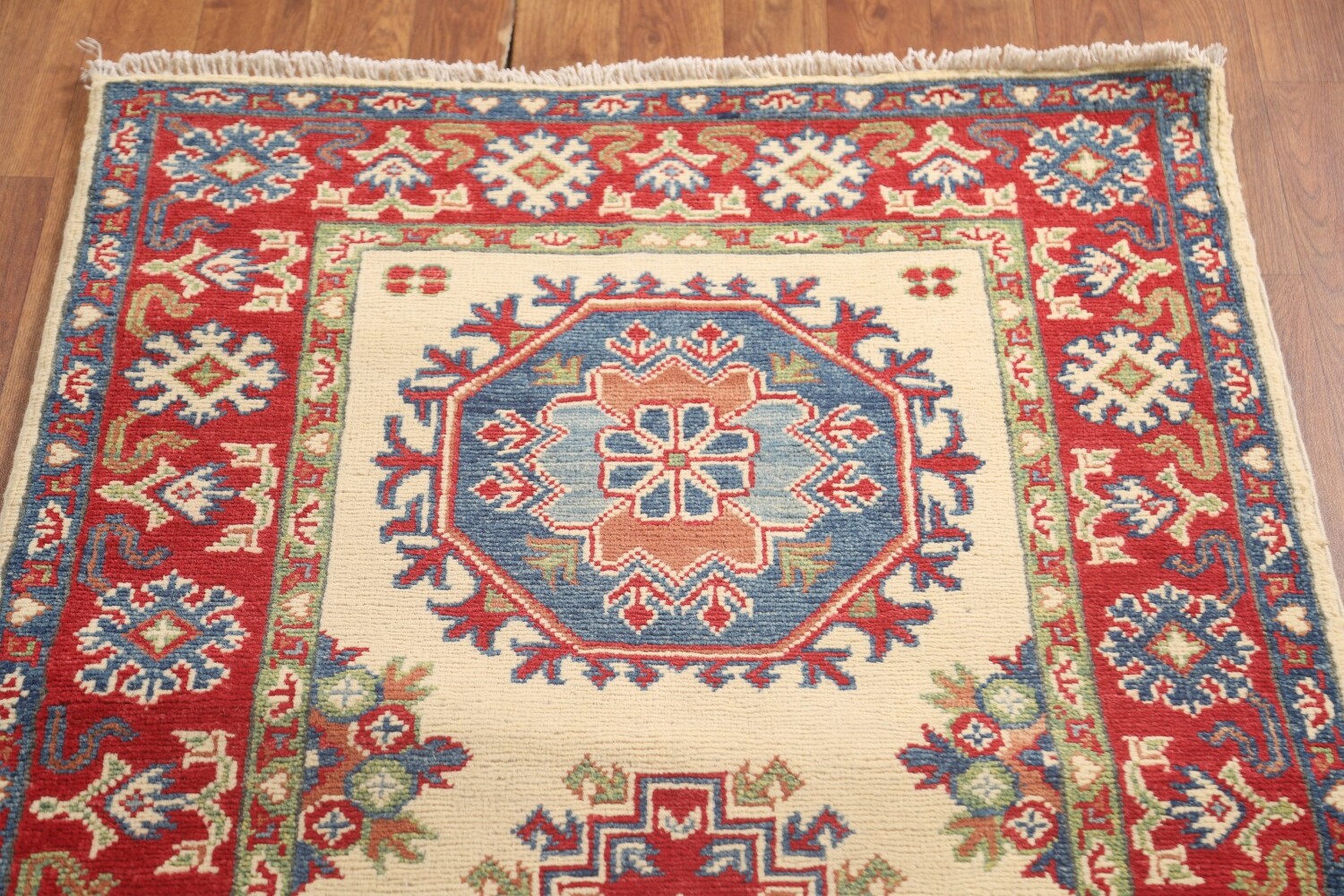 A Beautiful Genuine Pakistan Kazak rug is Hand Knotted by skillful weavers in Pakistan with 100% Wool Material. This rug is in New, First Quality condition. dimensions are 25' 6'' X 2' 10'' in foot and 777 X 86 in centimeter. the primary color is Beige & Ivories.