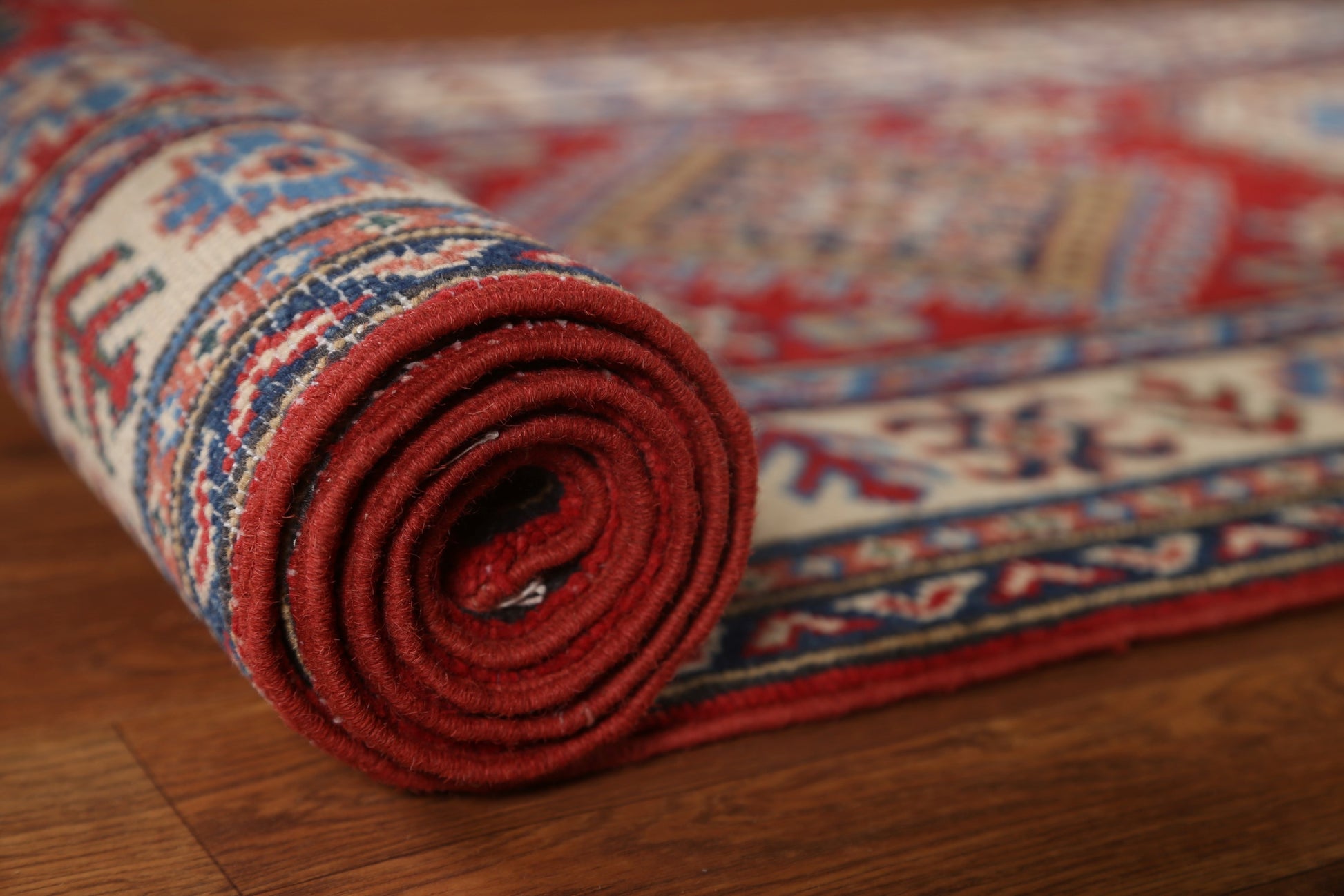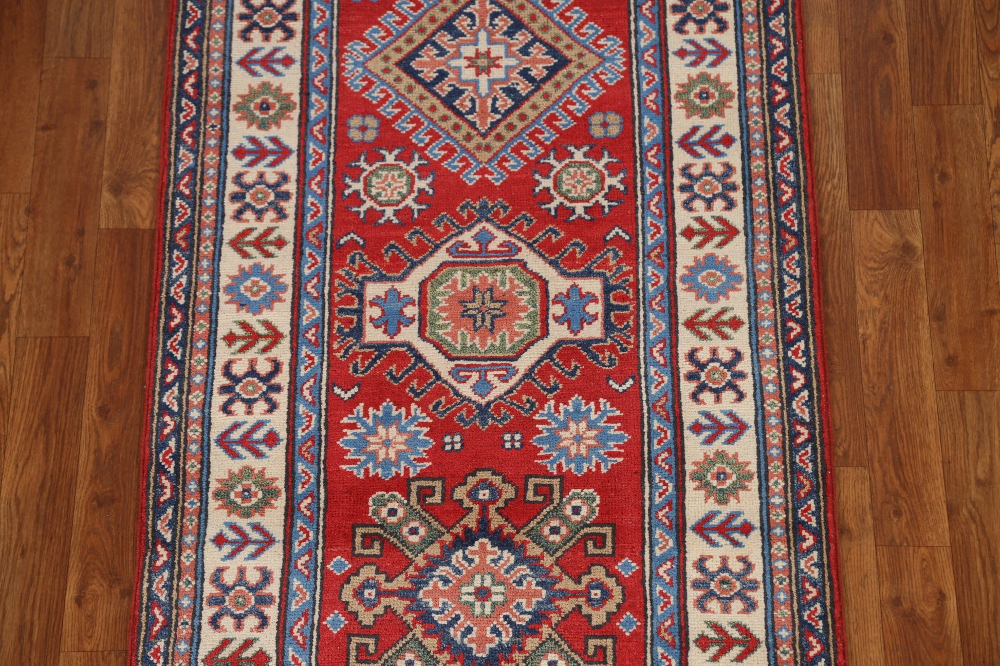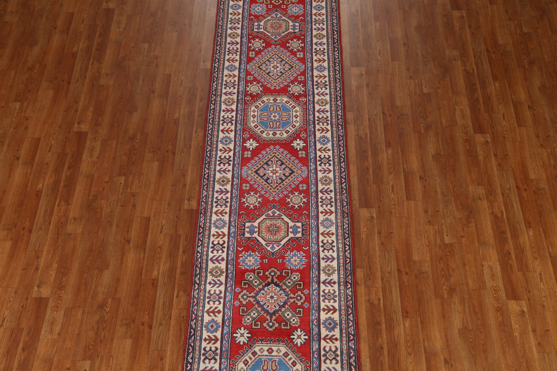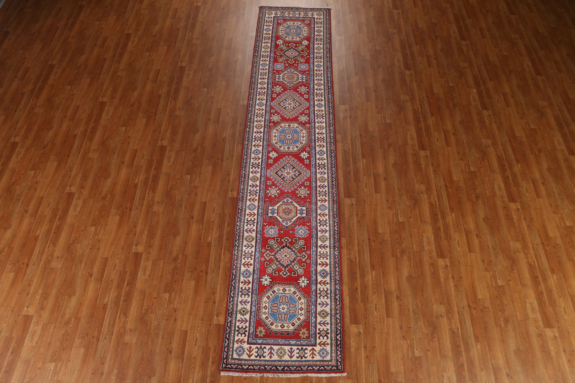 A Beautiful Genuine Pakistan Kazak rug is Hand Knotted by skillful weavers in Pakistan with 100% Wool Material. This rug is in  condition. dimensions are 12' 6'' X 2' 8'' in foot and  381 X 81 in centimeter. the primary color is Red.