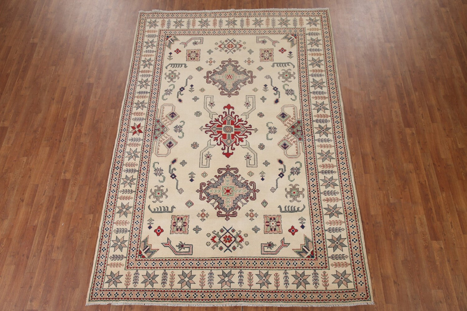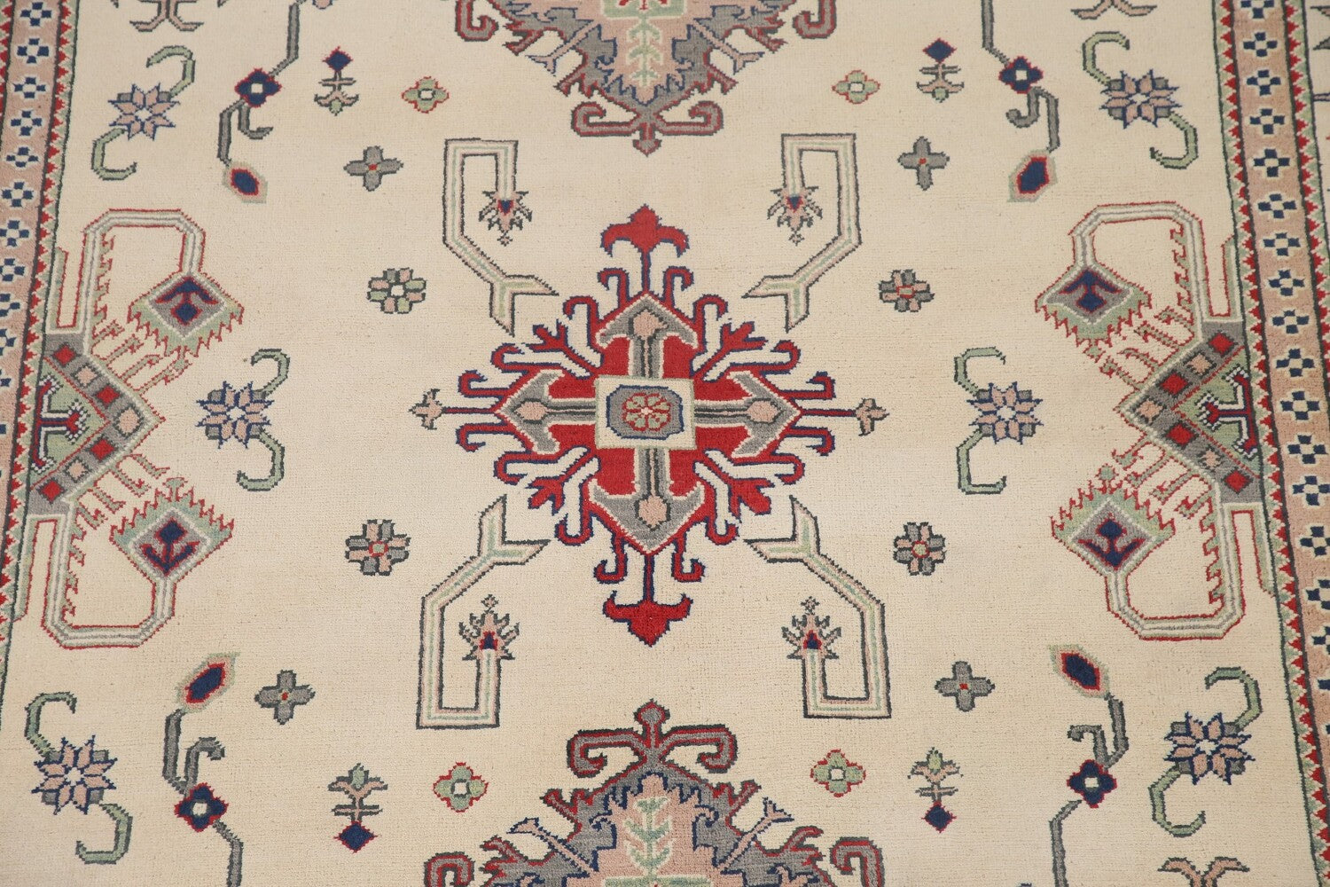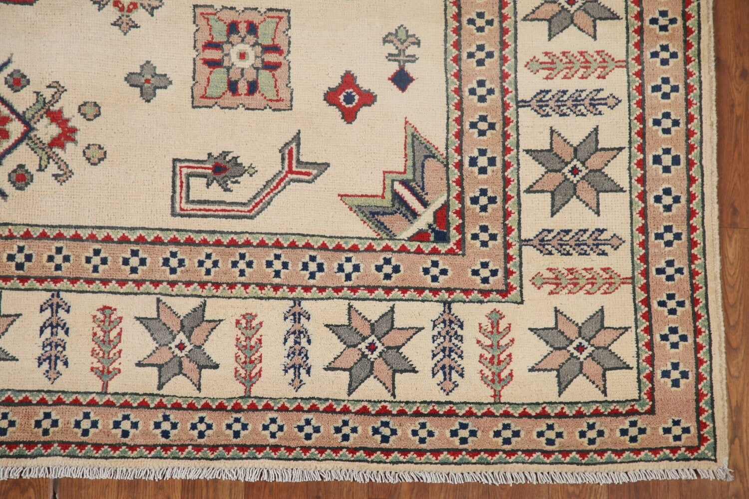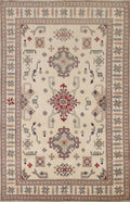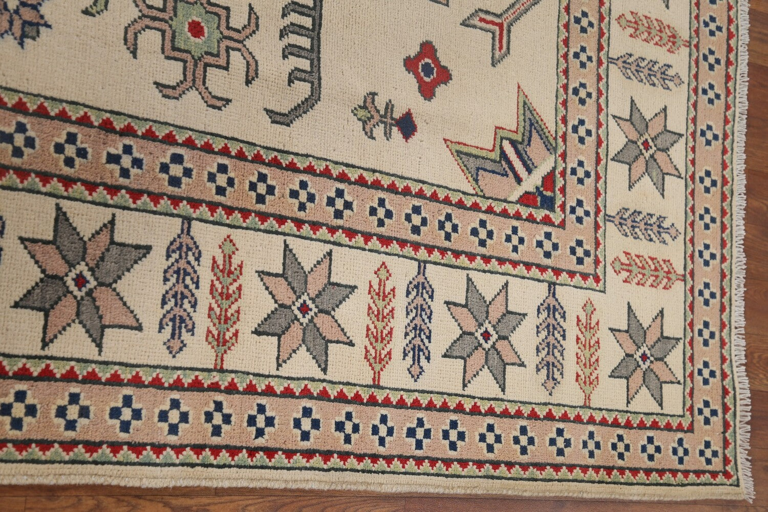 A Beautiful Genuine Pakistan Kazak rug is Hand Knotted by skillful weavers in Pakistan with 100% Wool Material. This rug is in New, First Quality condition. dimensions are 9' 7'' X 6' 7'' in foot and 292 X 201 in centimeter. the primary color is Beige & Ivories.