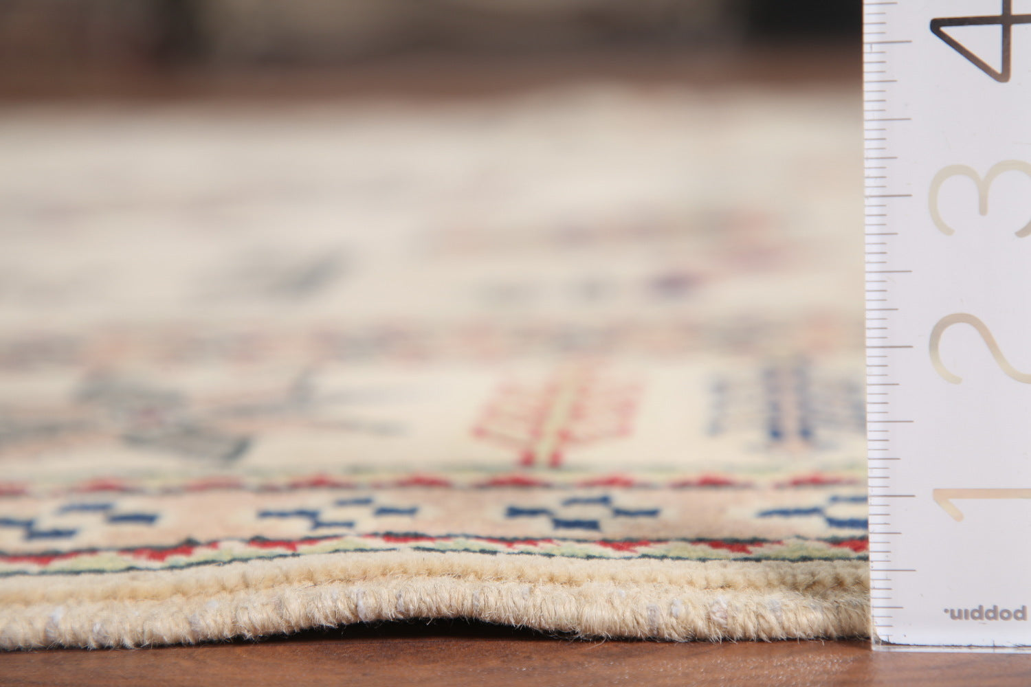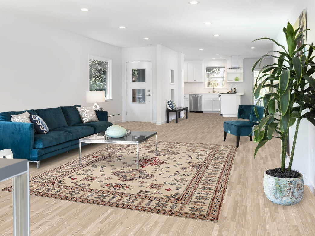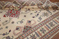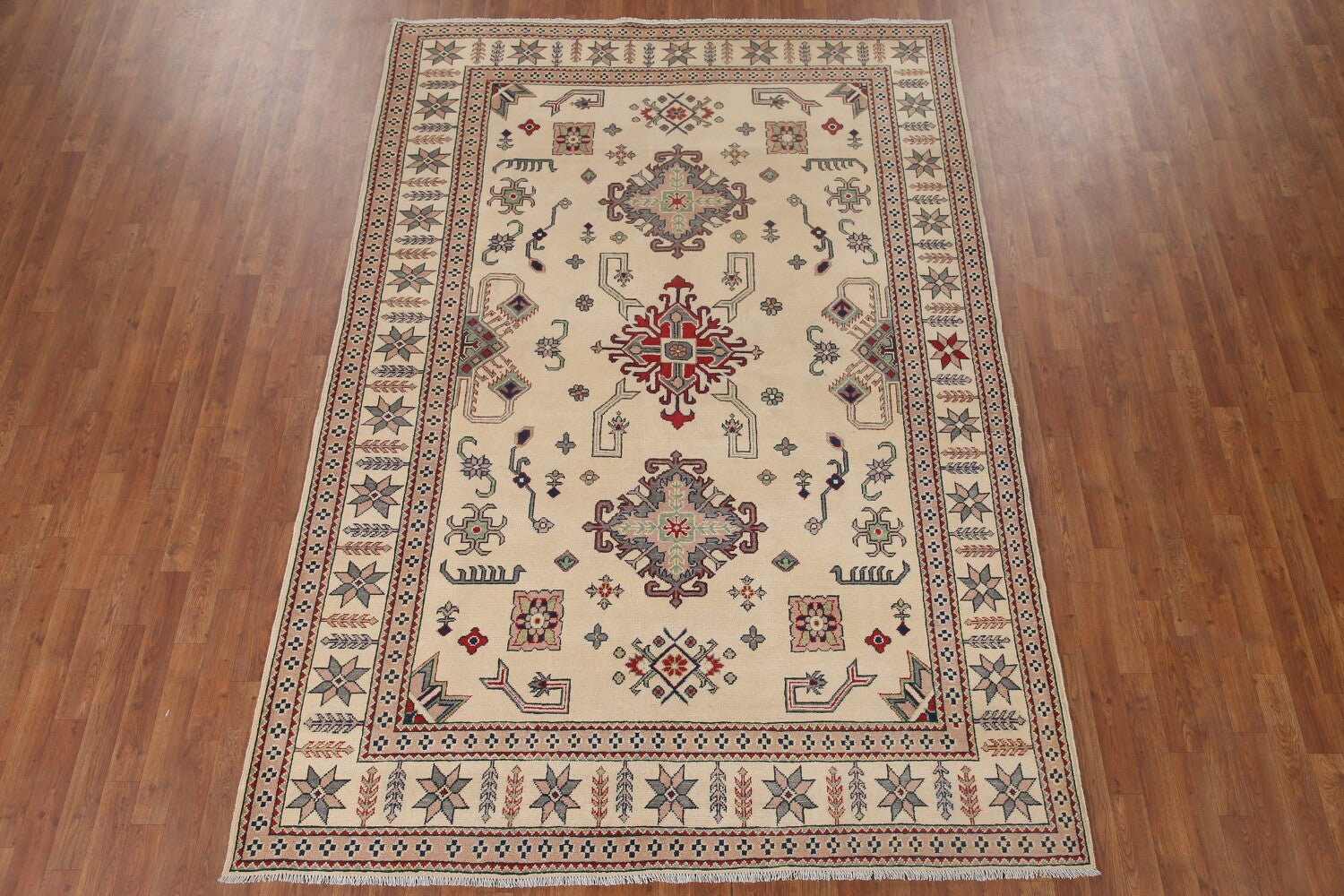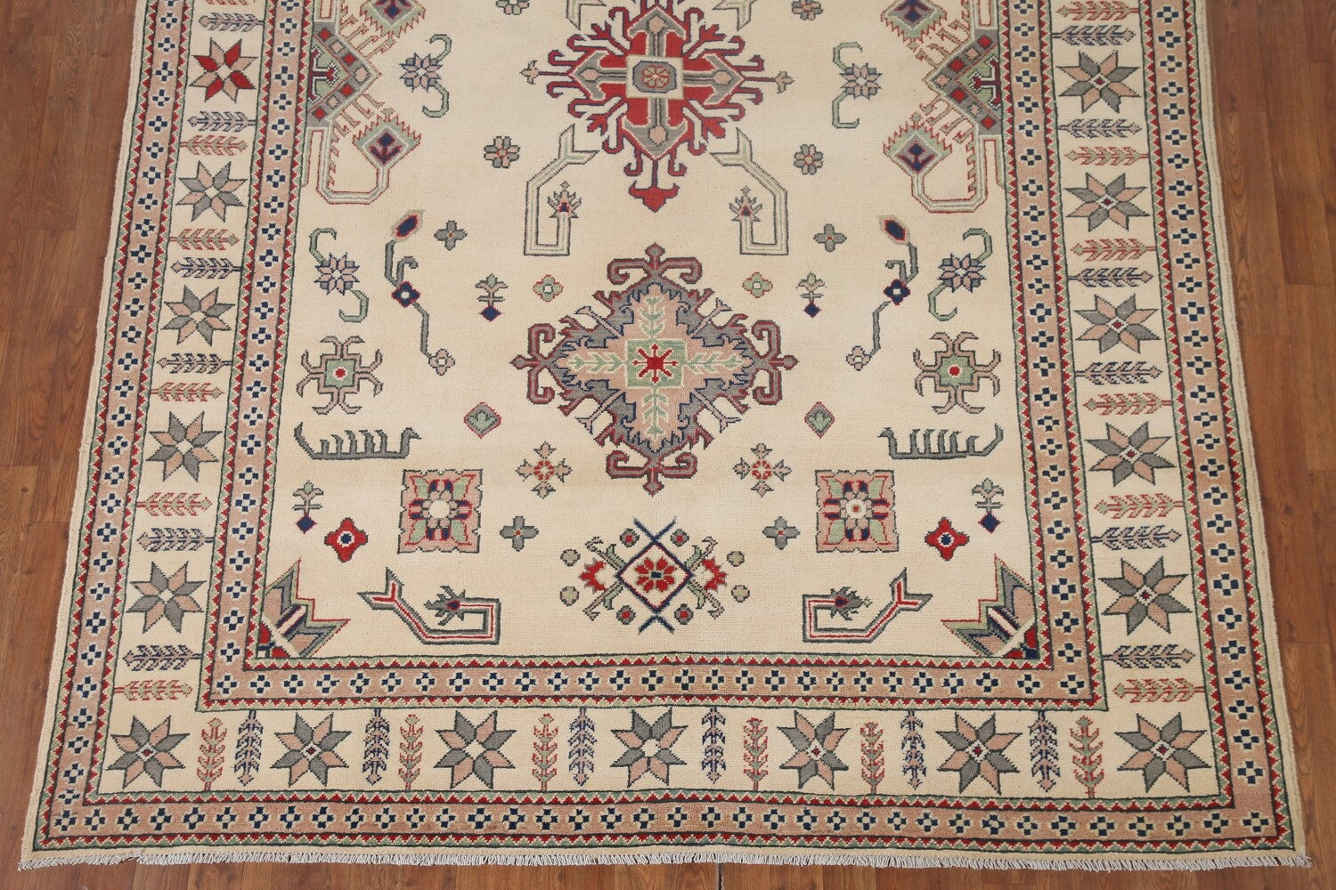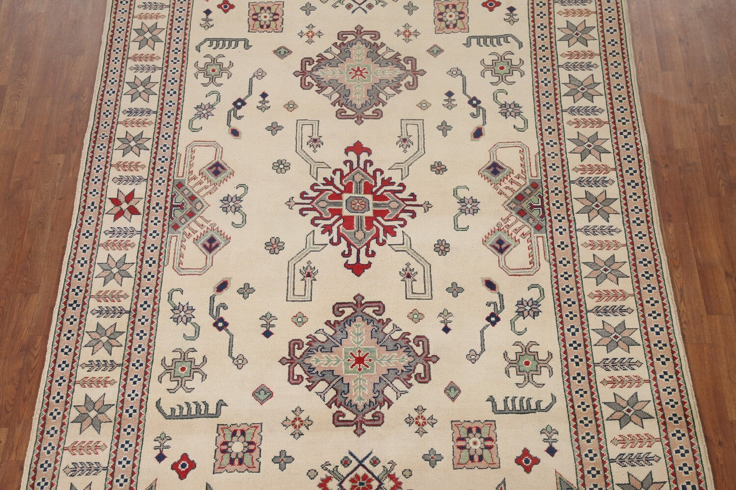 A Beautiful Genuine Pakistan Kazak rug is Hand Knotted by skillful weavers in Pakistan with 100% Wool Material. This rug is in New, First Quality condition. dimensions are 9' 7'' X 6' 7'' in foot and 292 X 201 in centimeter. the primary color is Beige & Ivories.