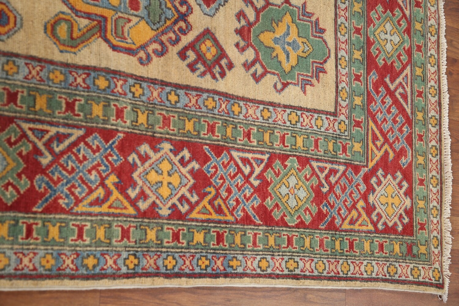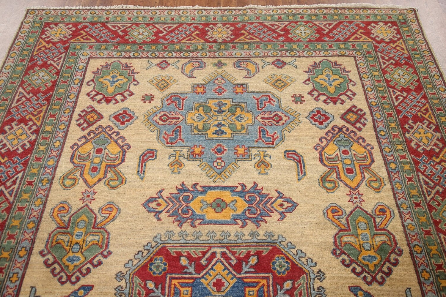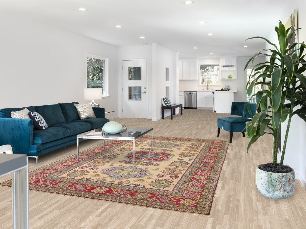 A Beautiful Genuine Pakistan Kazak rug is Hand Knotted by skillful weavers in Pakistan with 100% Wool Material. This rug is in New, First Quality condition. dimensions are 9' 11'' X 6' 7'' in foot and 302 X 201 in centimeter. the primary color is Yellow & Gold.