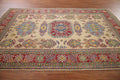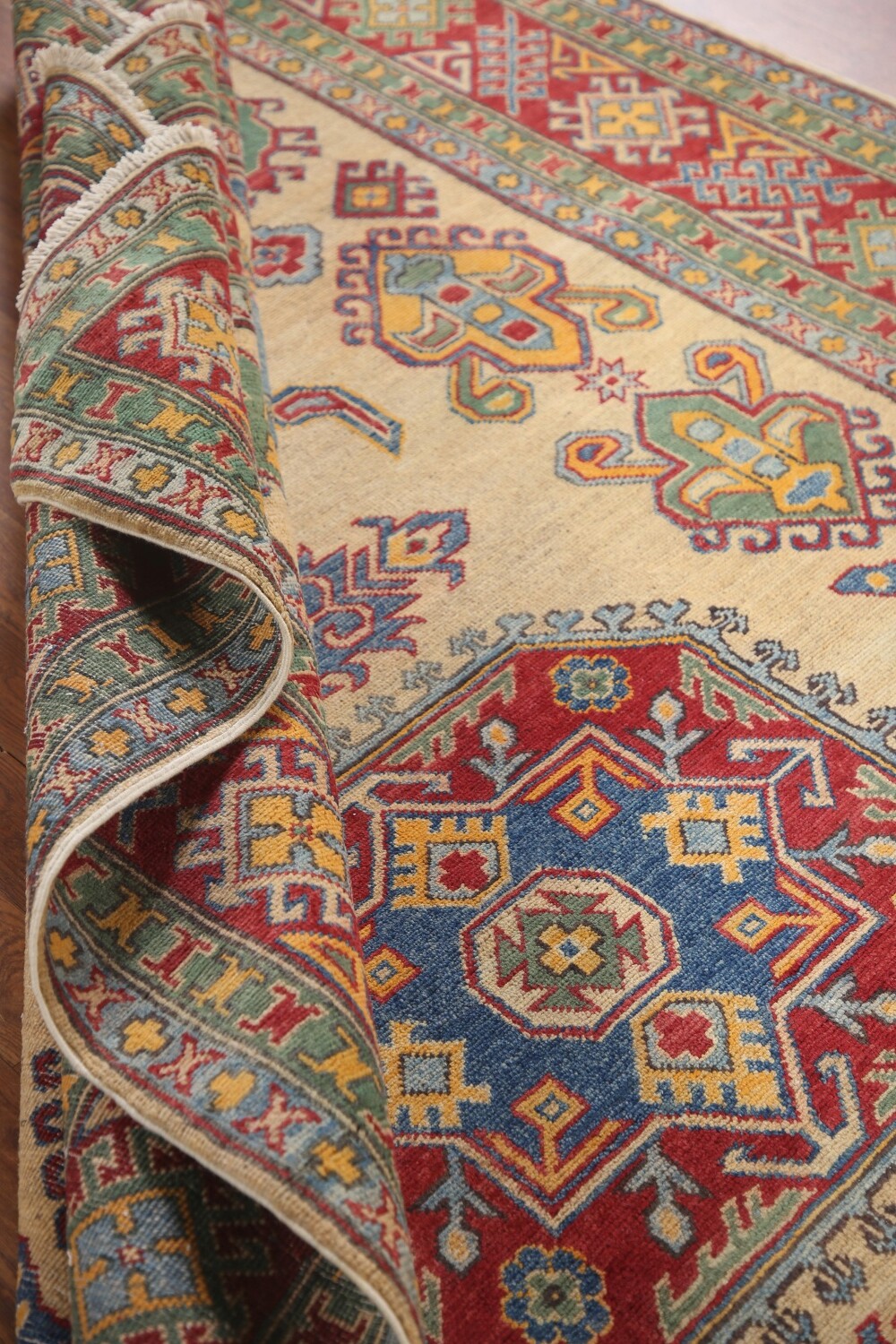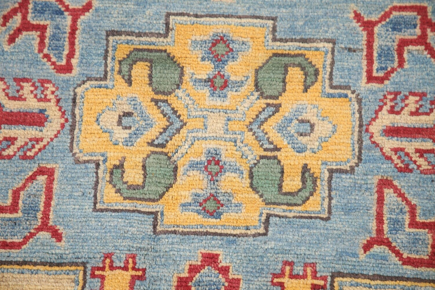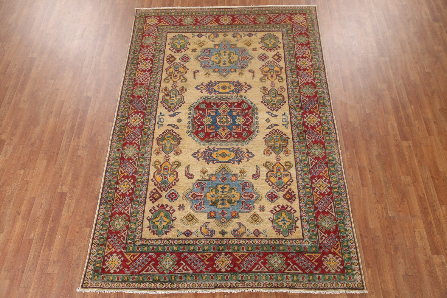 A Beautiful Genuine Pakistan Kazak rug is Hand Knotted by skillful weavers in Pakistan with 100% Wool Material. This rug is in New, First Quality condition. dimensions are 9' 11'' X 6' 7'' in foot and 302 X 201 in centimeter. the primary color is Yellow & Gold.