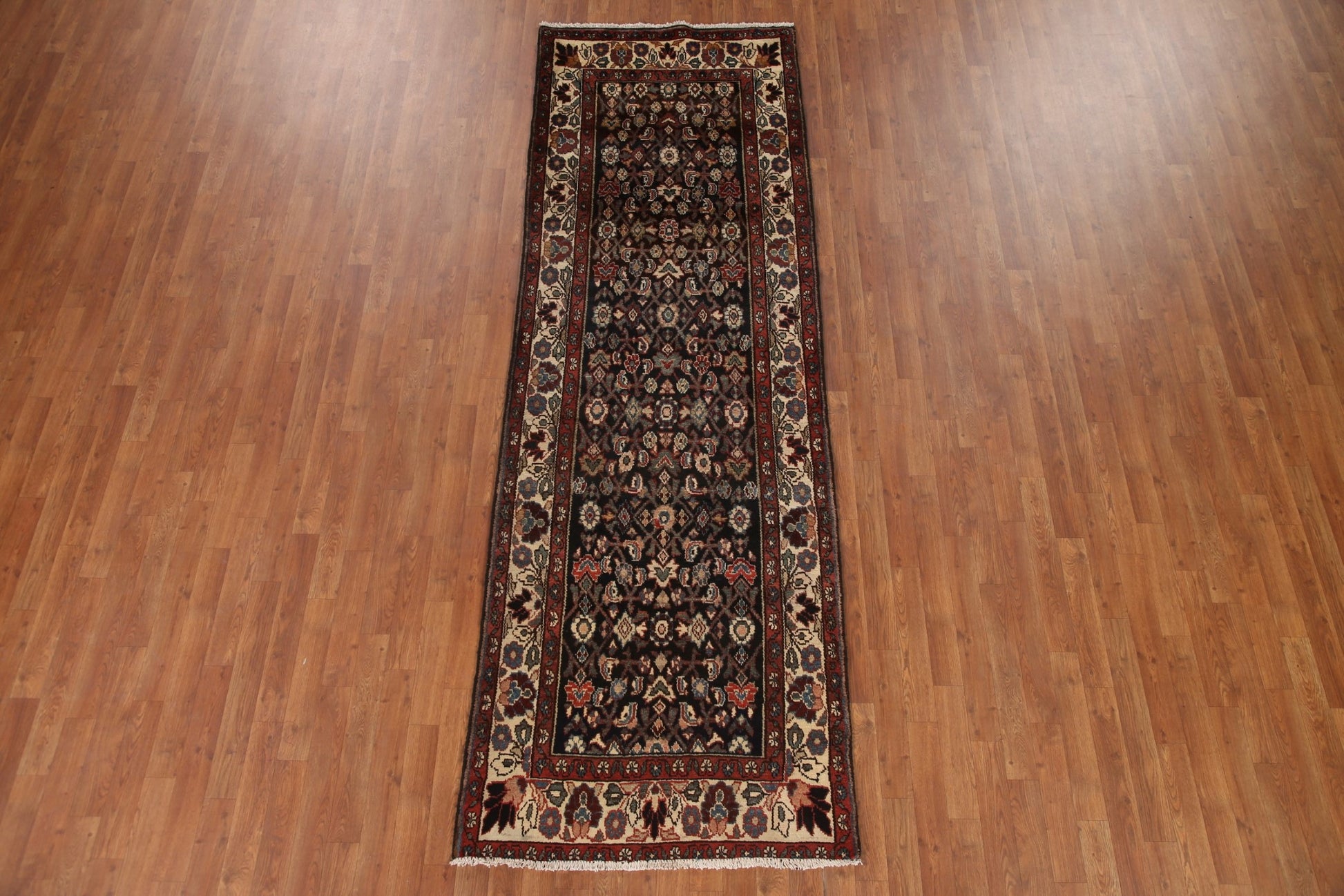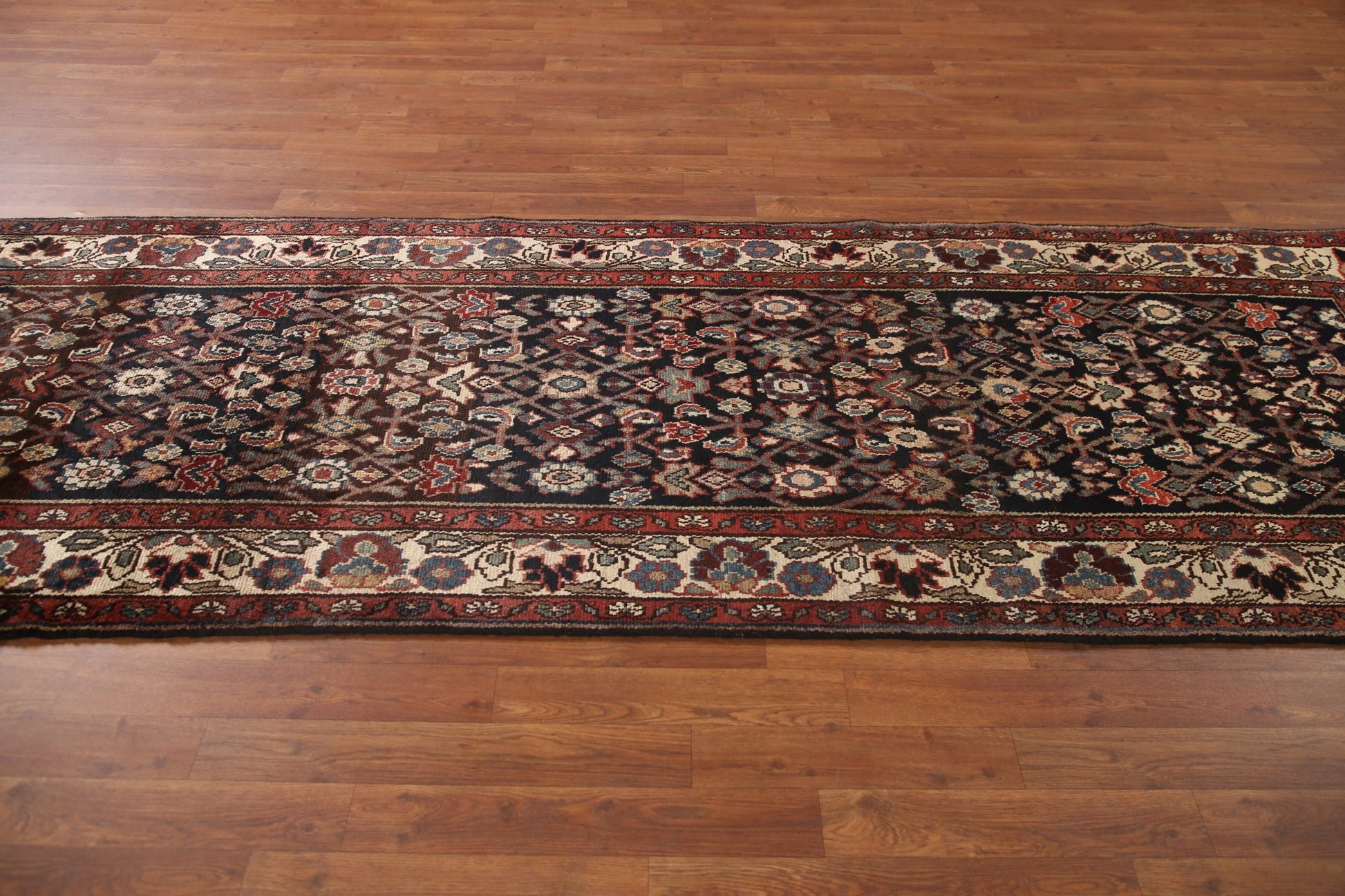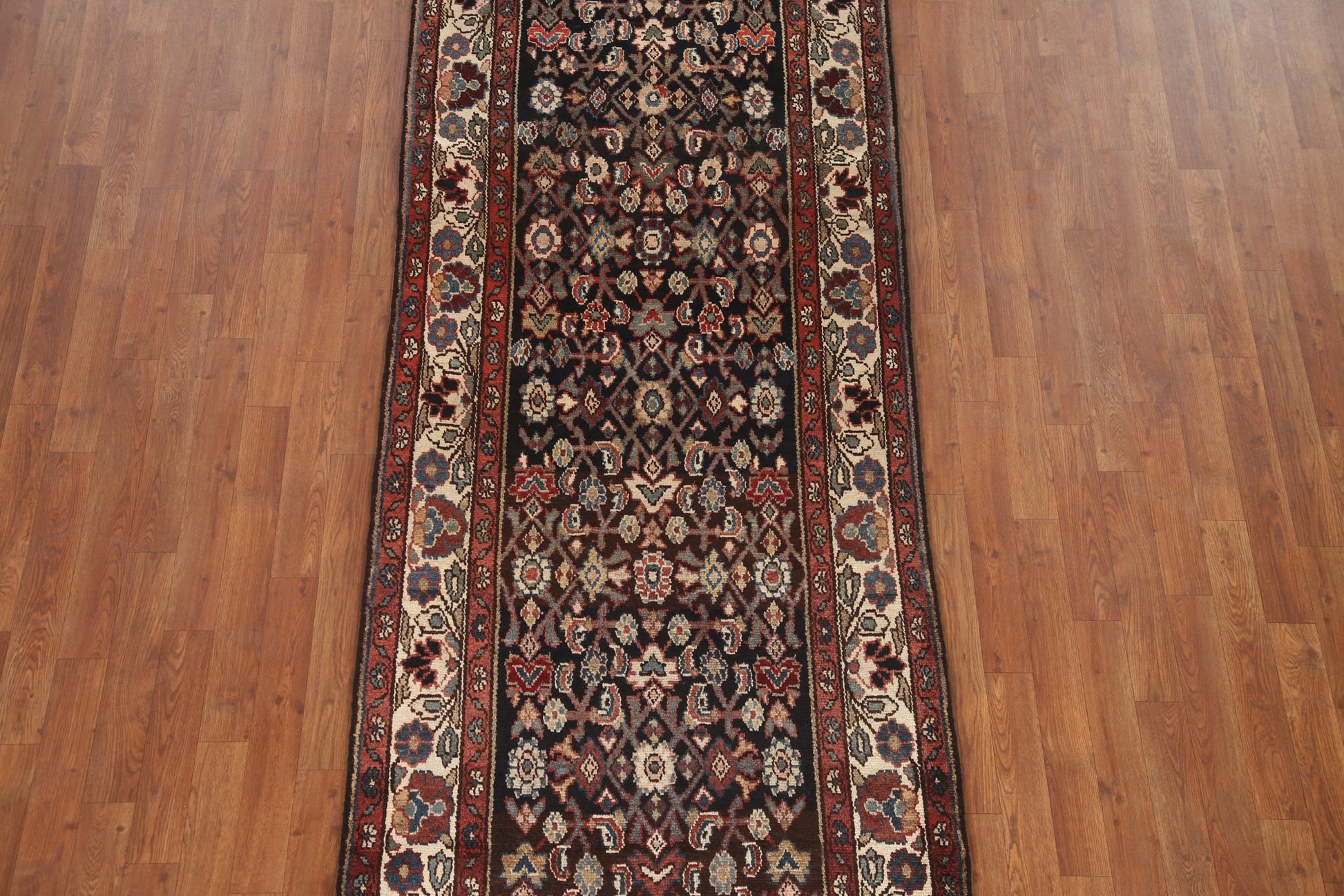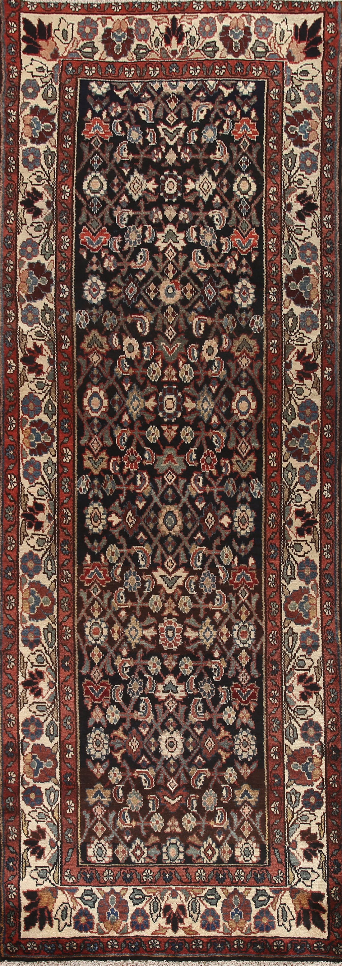 A Beautiful Genuine Persia ( Persia ) Malayer rug is Hand Knotted by skillful weavers in Persia ( Persia ) with 100% Wool Material. This rug is in Very Good condition. dimensions are 10' 3'' X 3' 4'' in foot and 312 X 102 in centimeter. the primary color is Black.