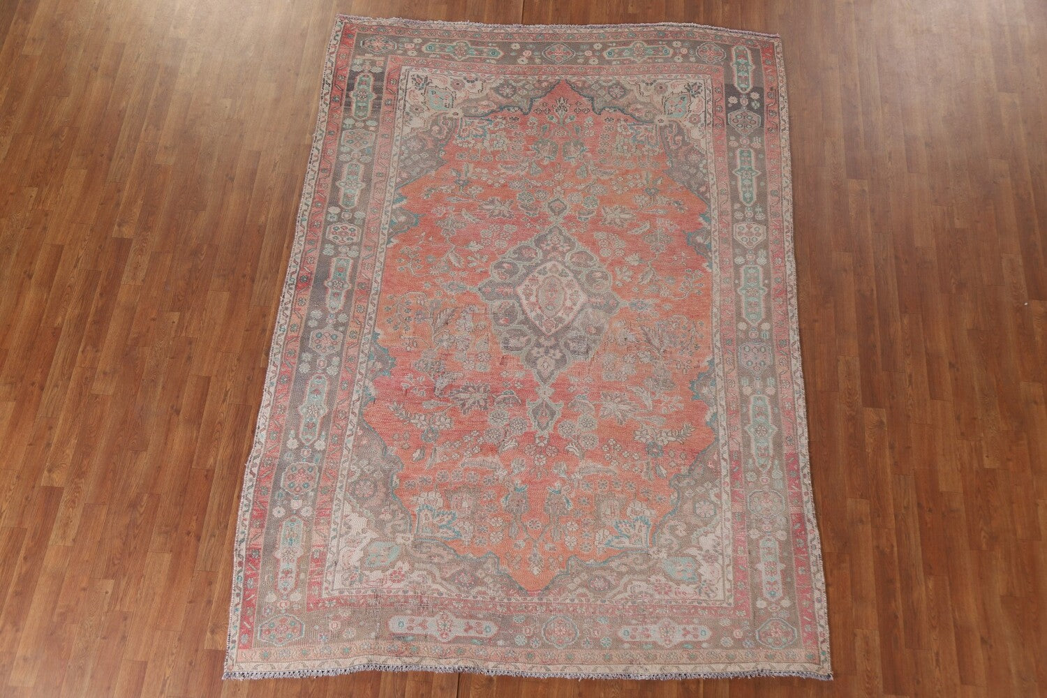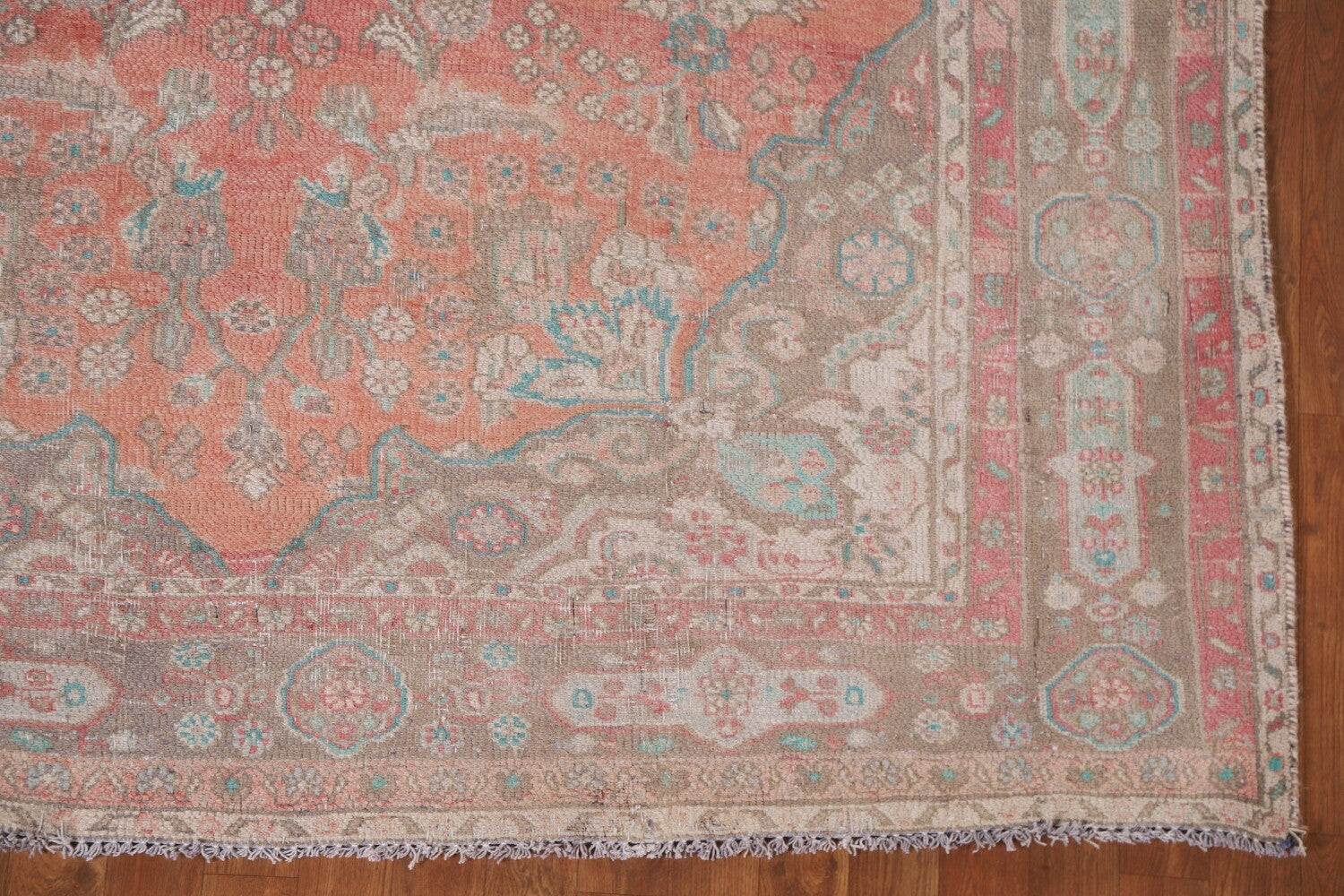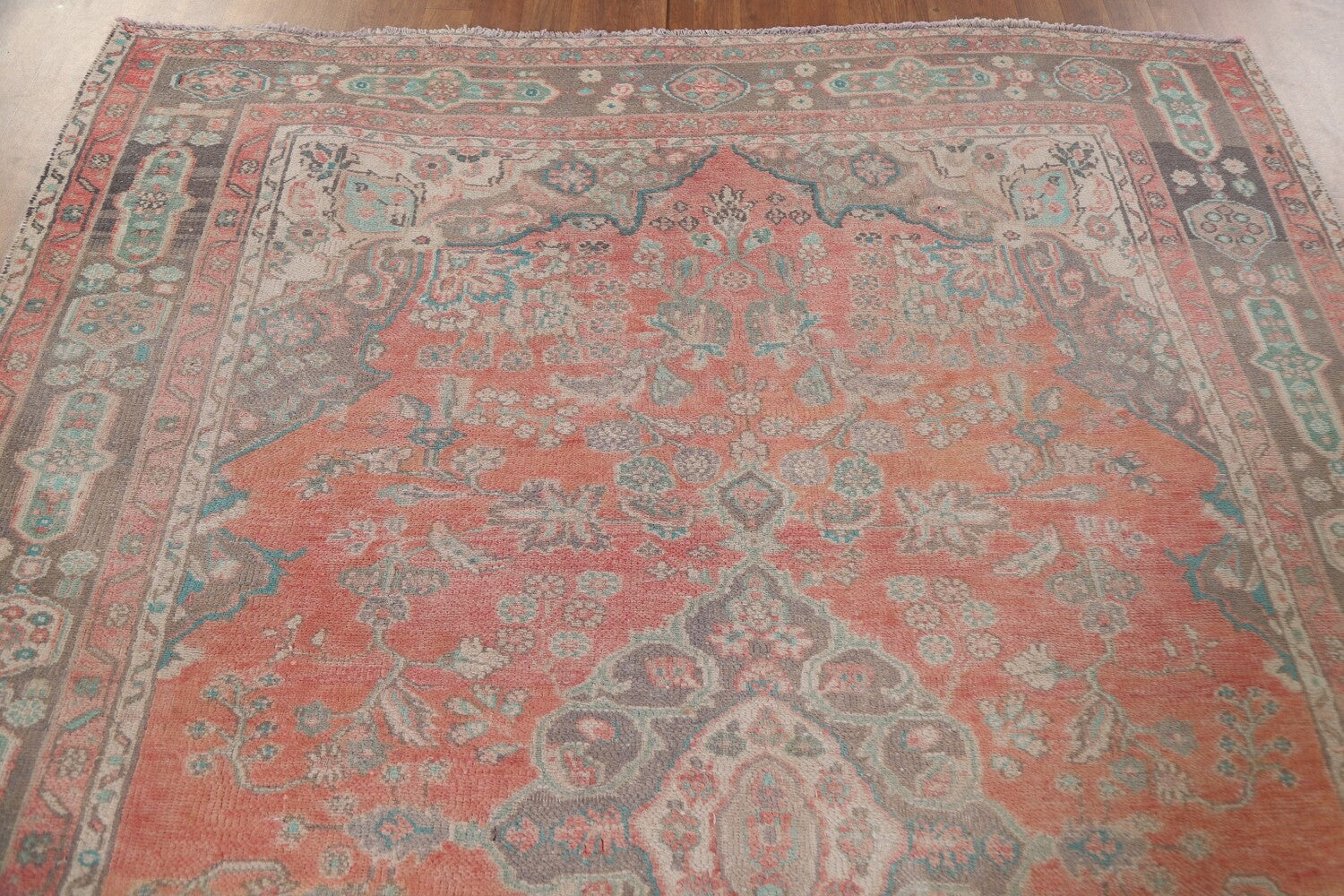 A Beautiful Genuine Persia ( Persia ) Mashad rug is Hand Knotted by skillful weavers in Persia ( Persia ) with 100% Wool Material. This rug is in Very Good (Low Pile-Worn) condition. dimensions are 8' 11'' X 6' 5'' in foot and 272 X 196 in centimeter. the primary color is Coral.