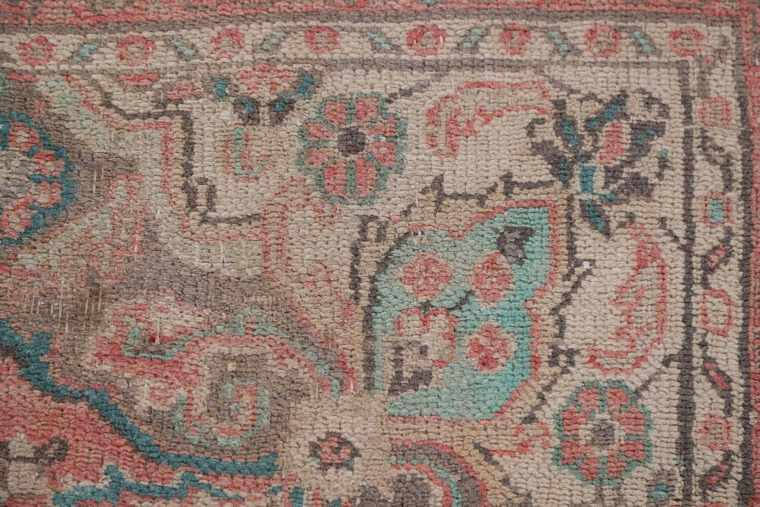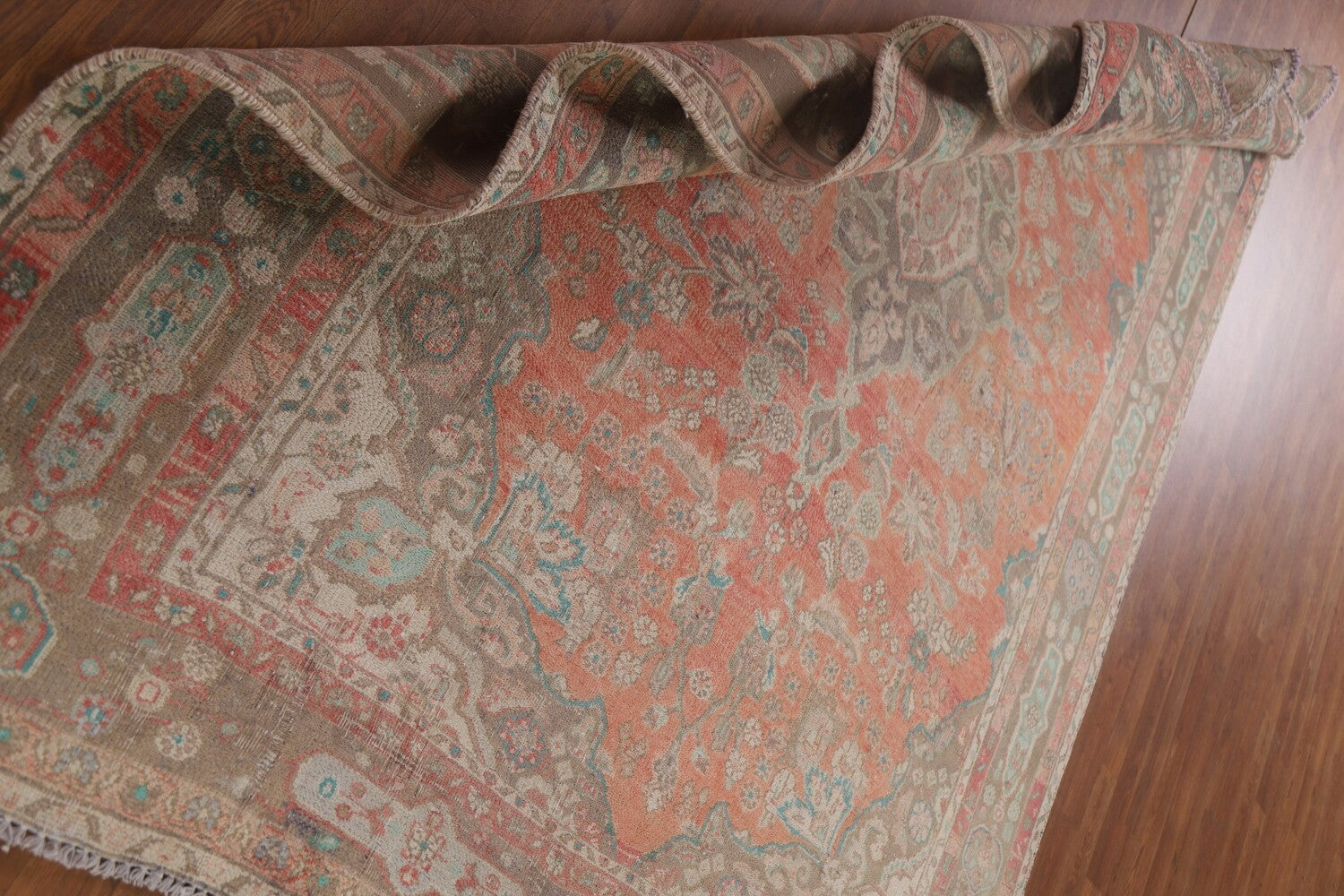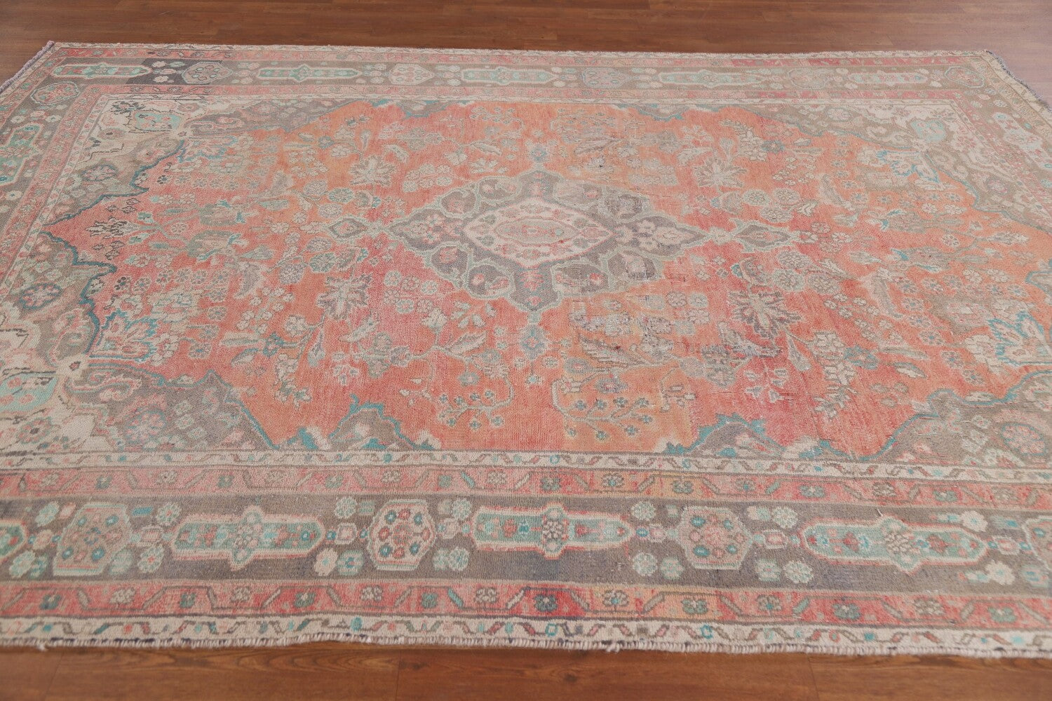 A Beautiful Genuine Persia ( Persia ) Mashad rug is Hand Knotted by skillful weavers in Persia ( Persia ) with 100% Wool Material. This rug is in Very Good (Low Pile-Worn) condition. dimensions are 8' 11'' X 6' 5'' in foot and 272 X 196 in centimeter. the primary color is Coral.